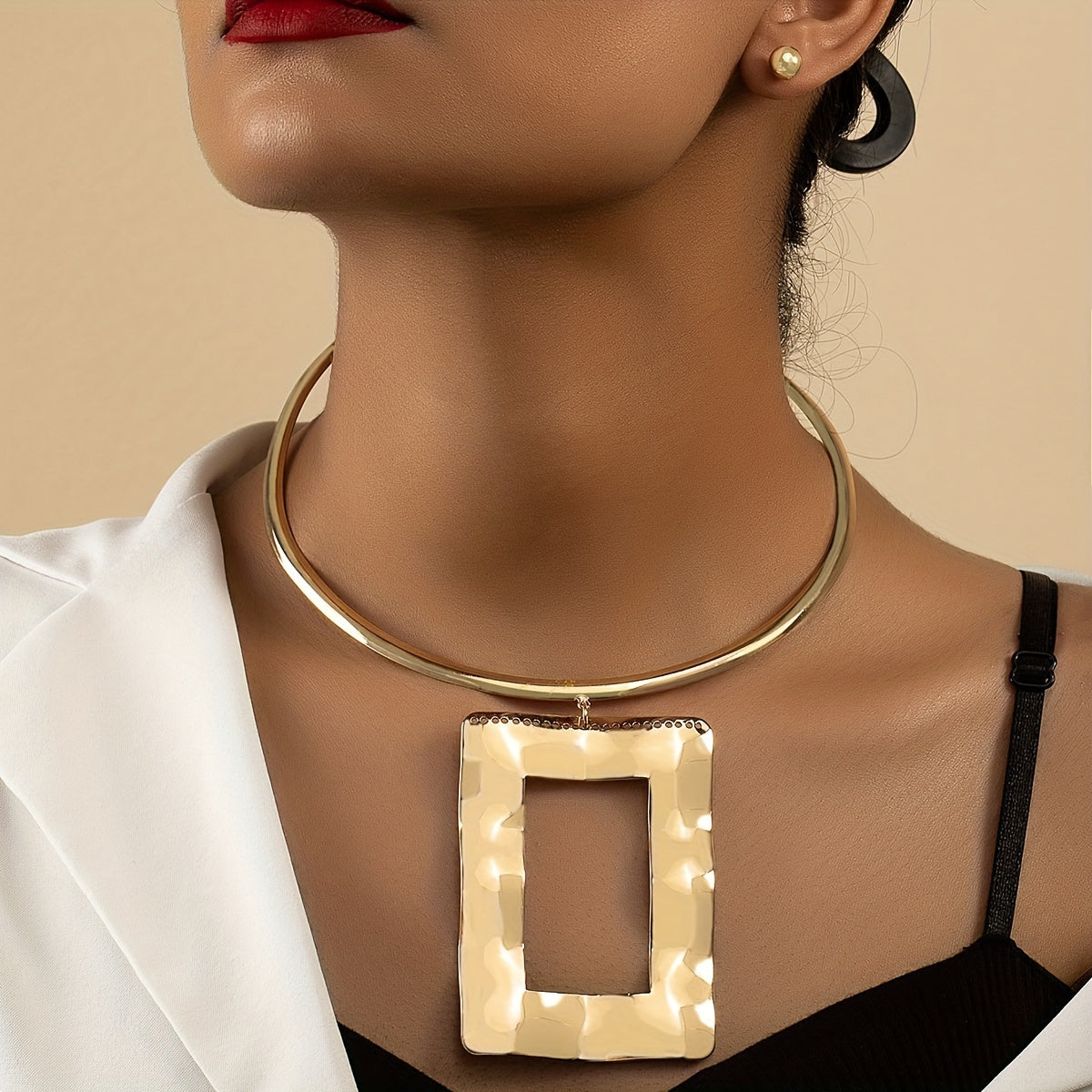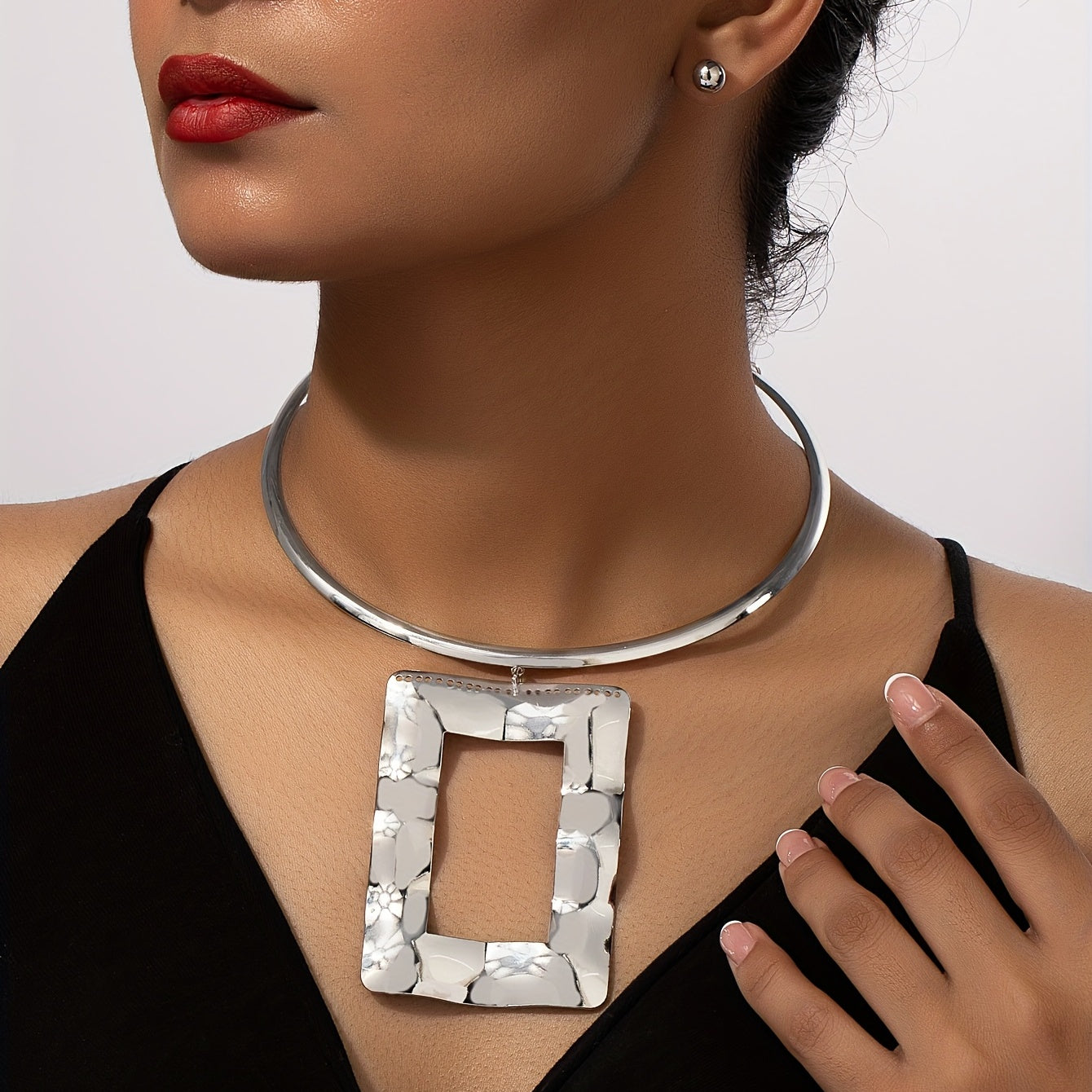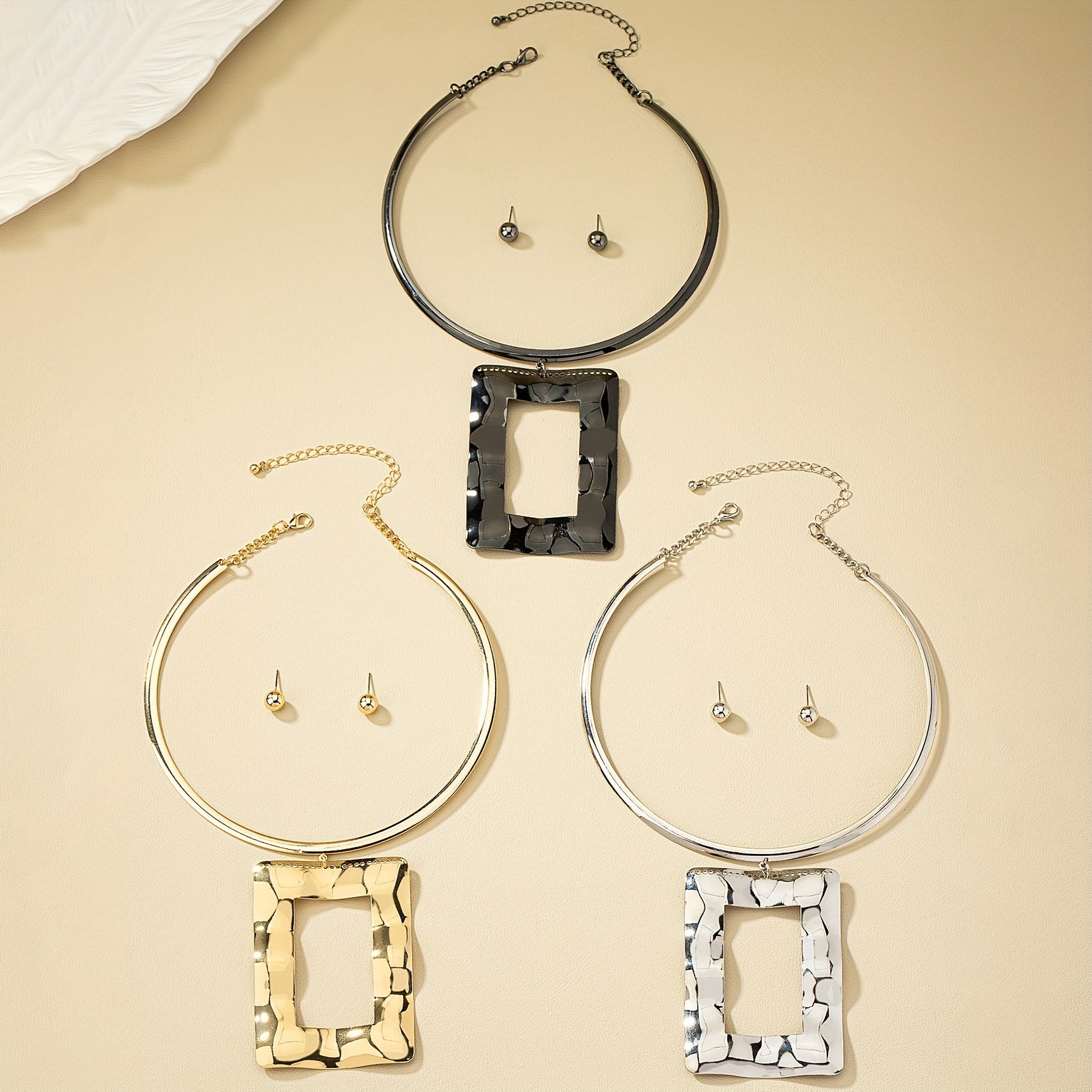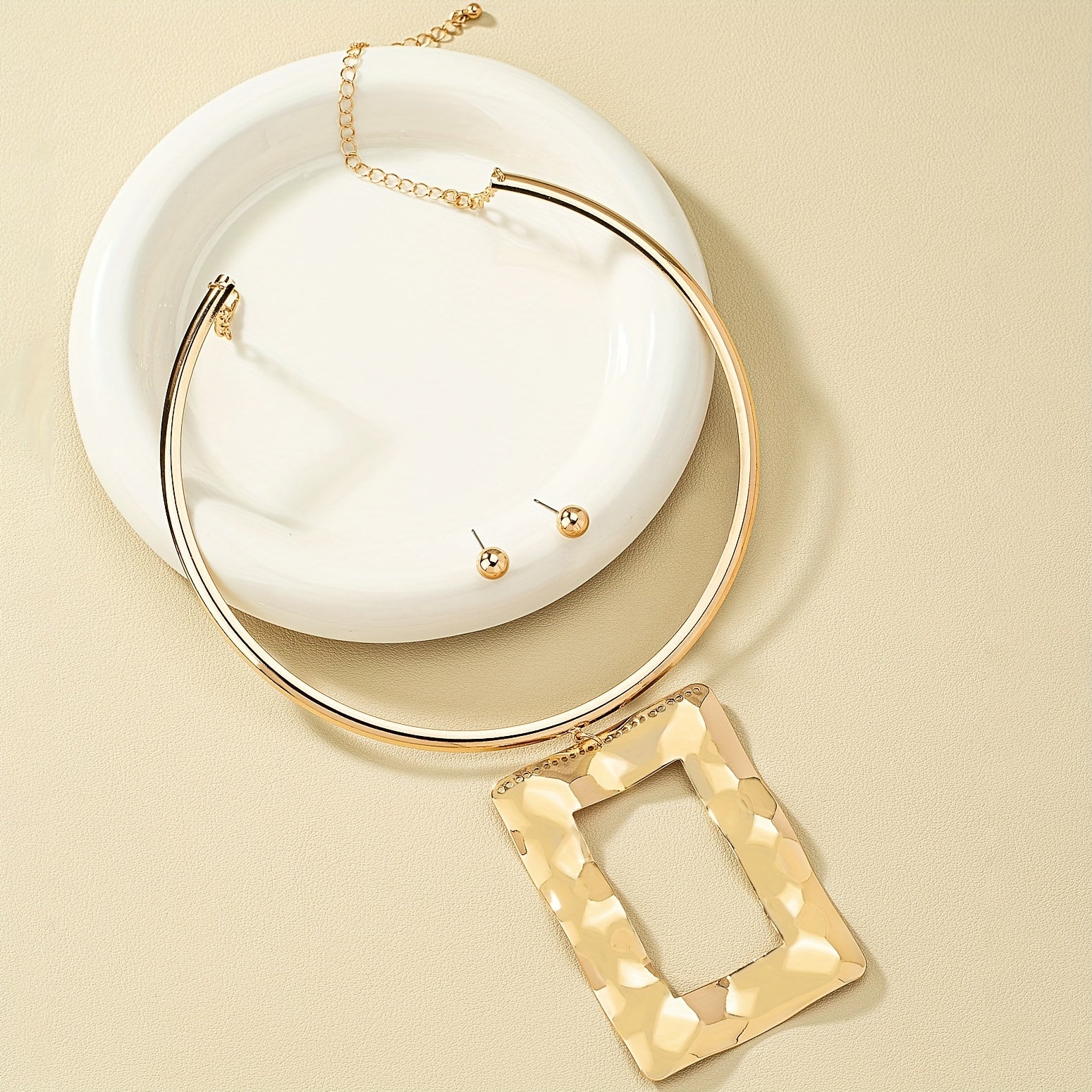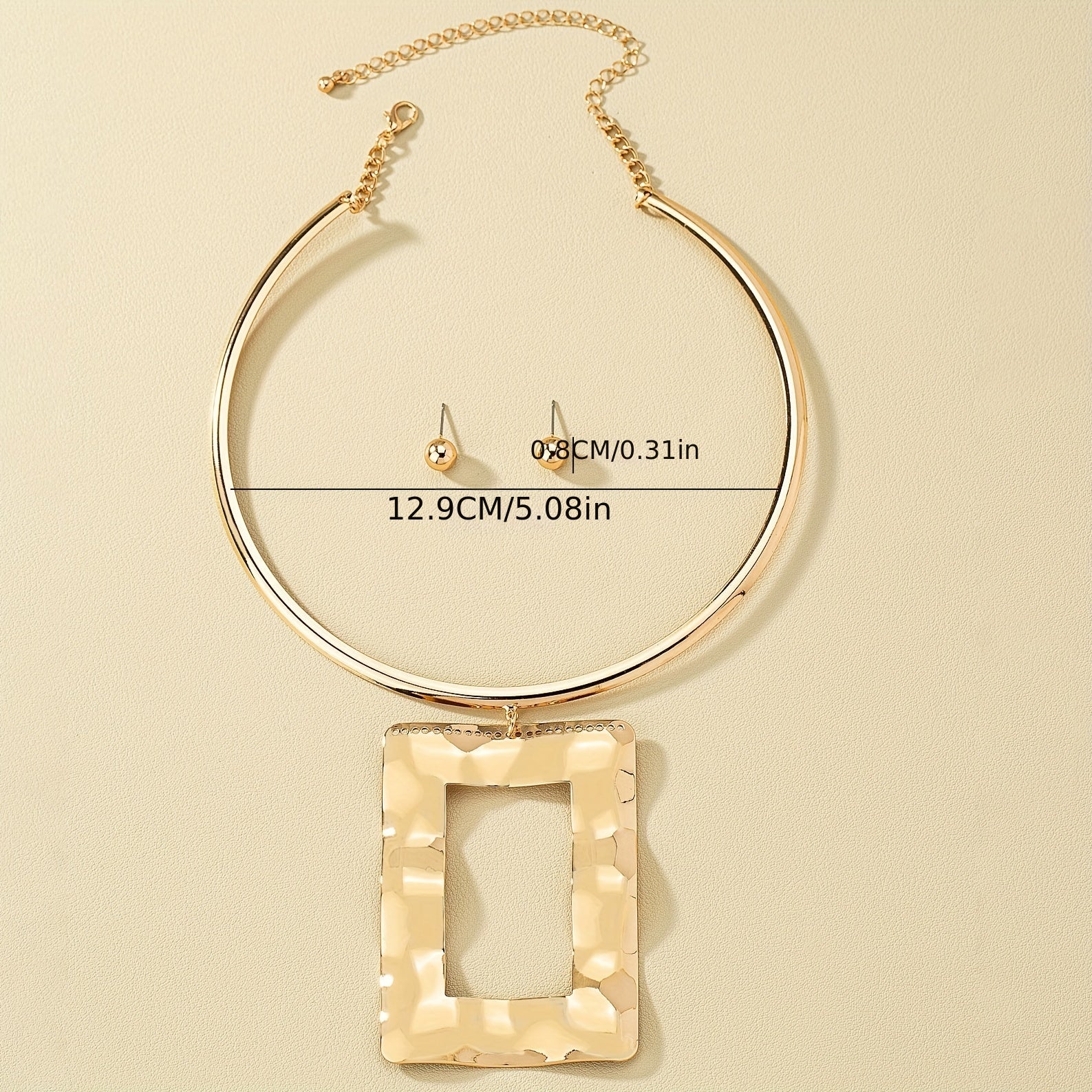Make a bold statement with this exaggerated geometric pendant choker necklace and stud earrings set. Perfect for adding a touch of hip hop style to your outfit.