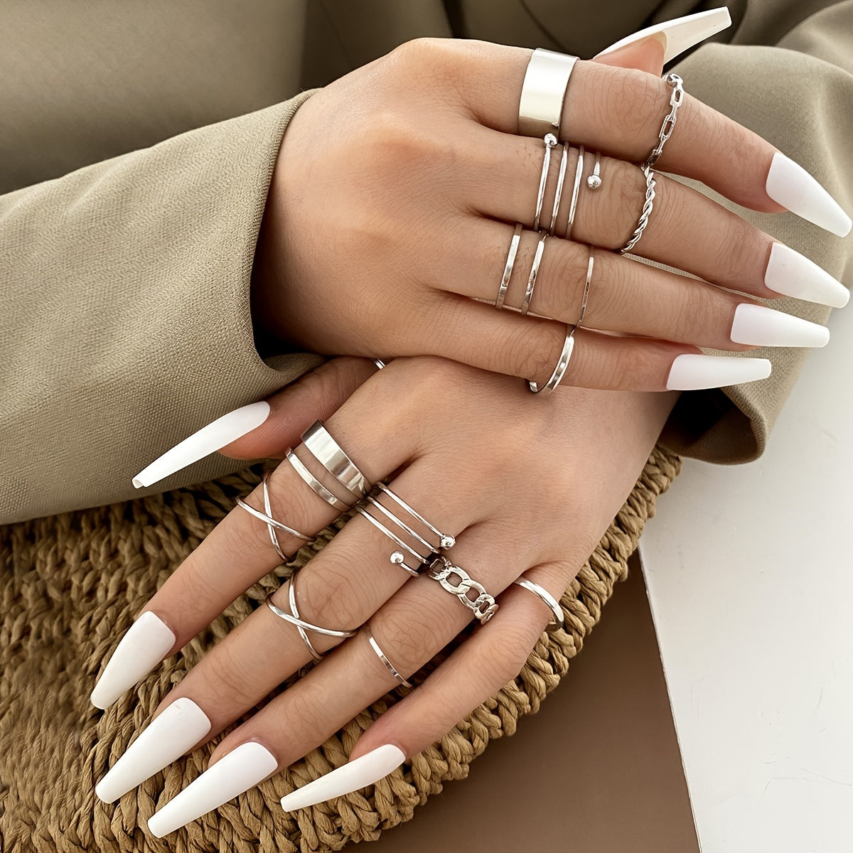 Elevate your style with this elegant 16-piece geometric surplice ring set. Crafted with attention to detail, these rings add a touch of sophistication to any outfit.