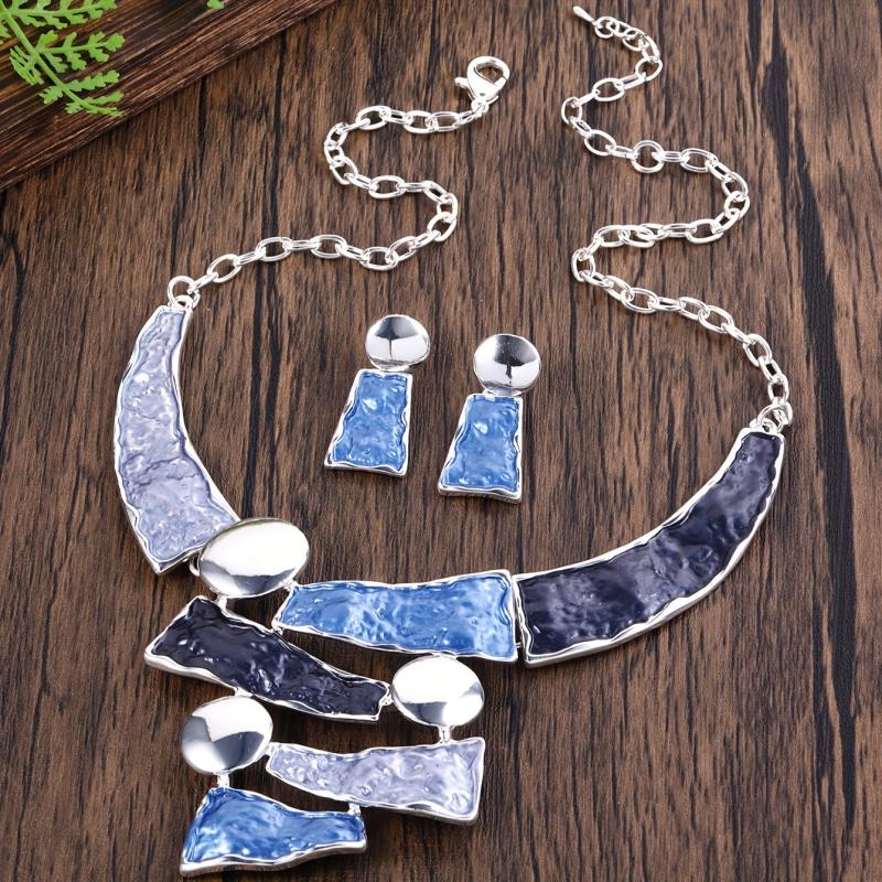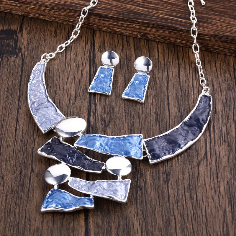 This creative jewelry set features a geometric design with a hollow out colorblock drip pattern. It is a versatile accessory for women that can be worn daily or for special occasions.