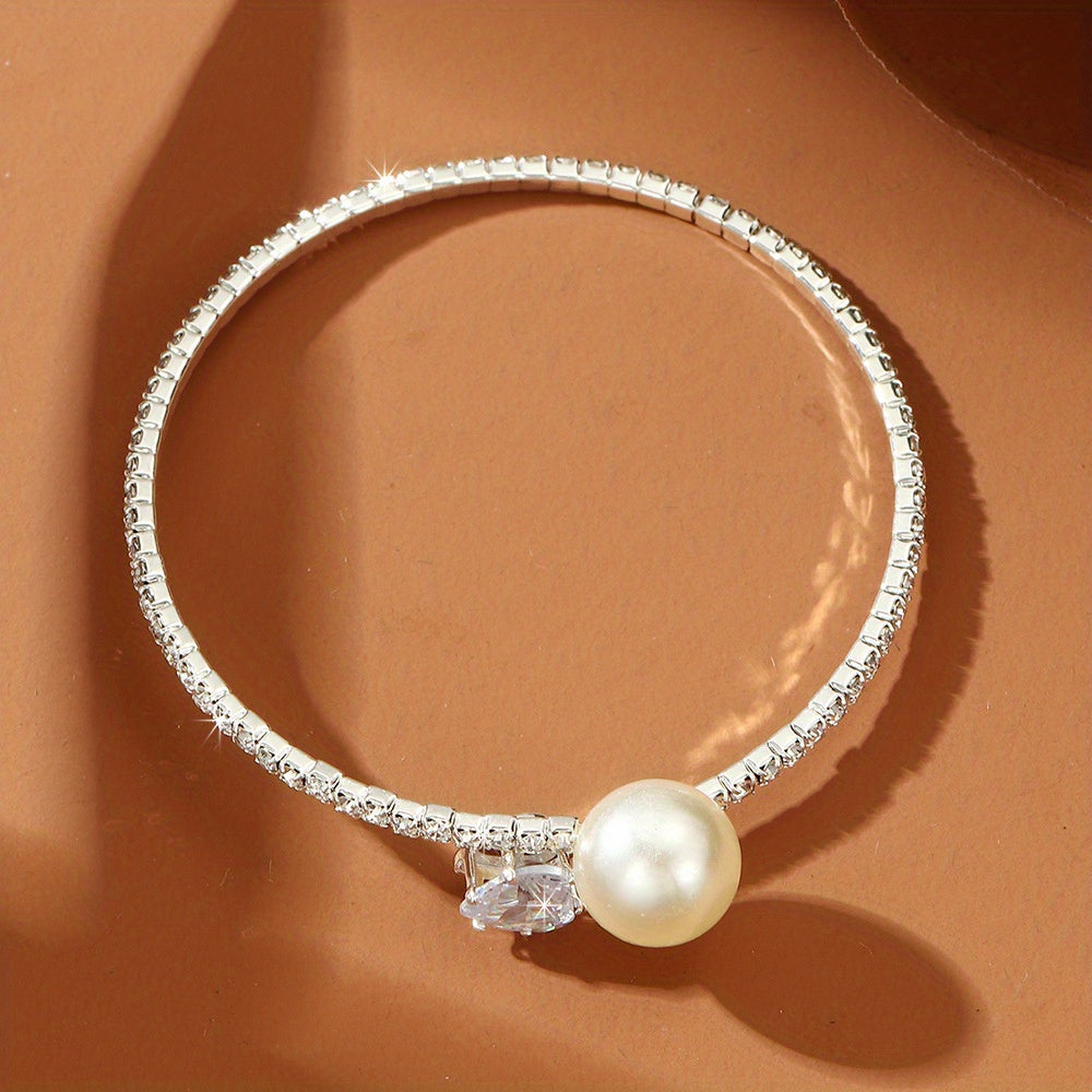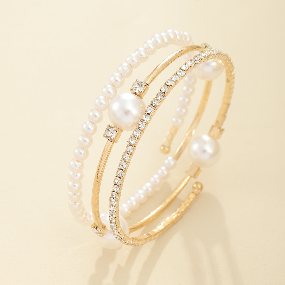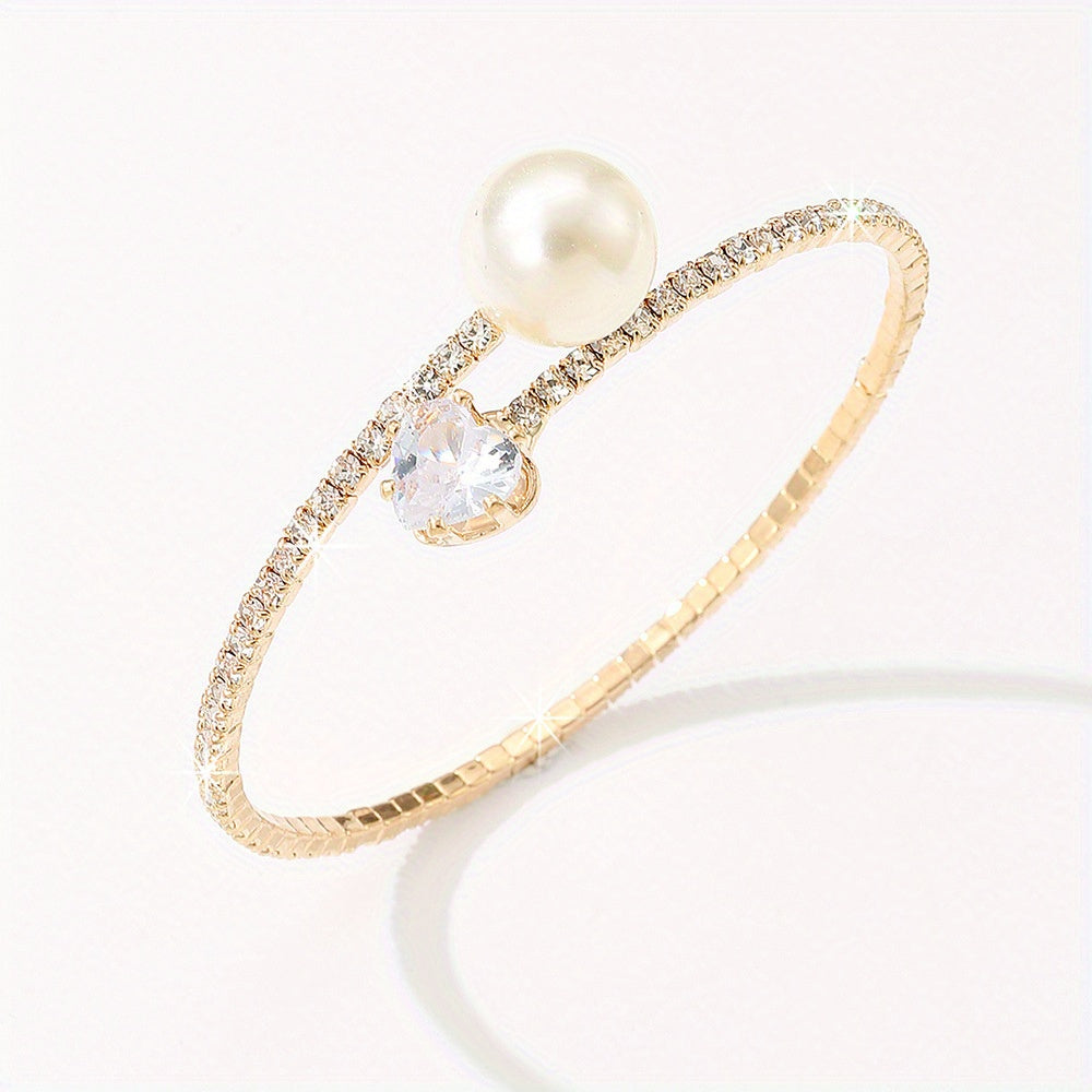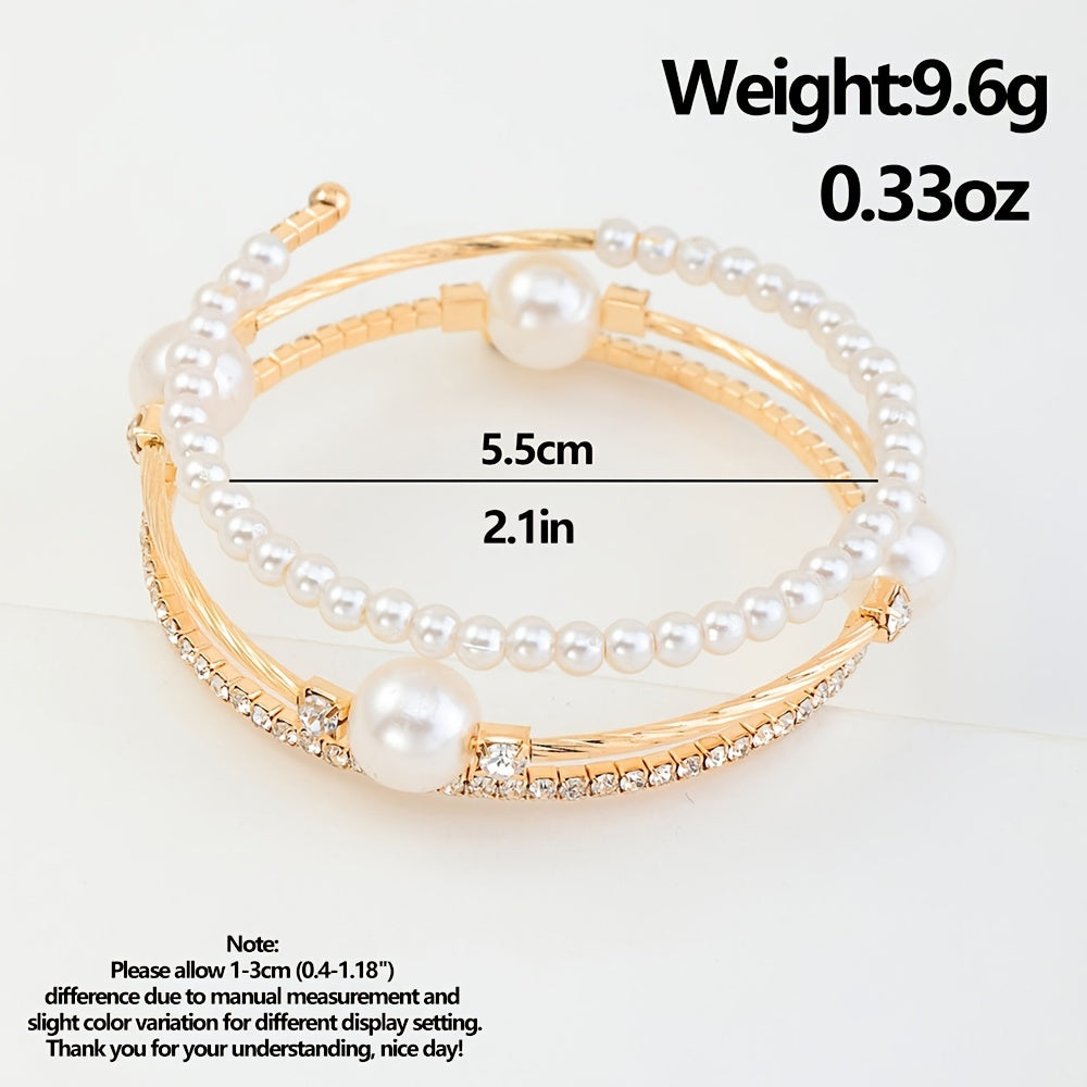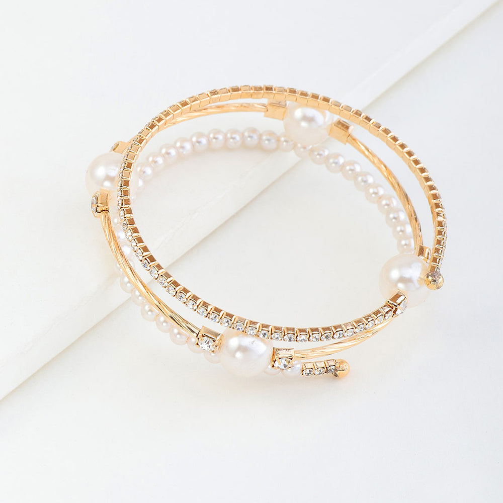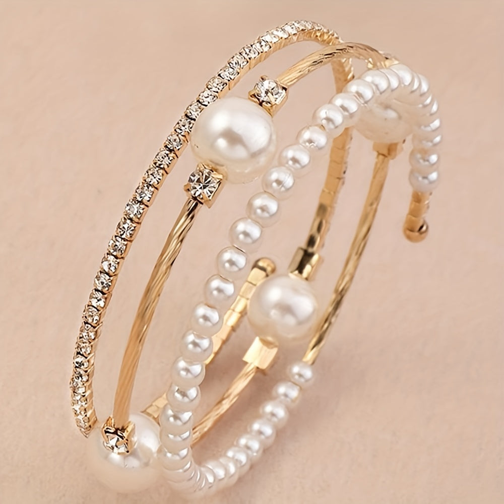 This bangle is adorned with faux pearls and rhinestones, adding a touch of elegance to any outfit.