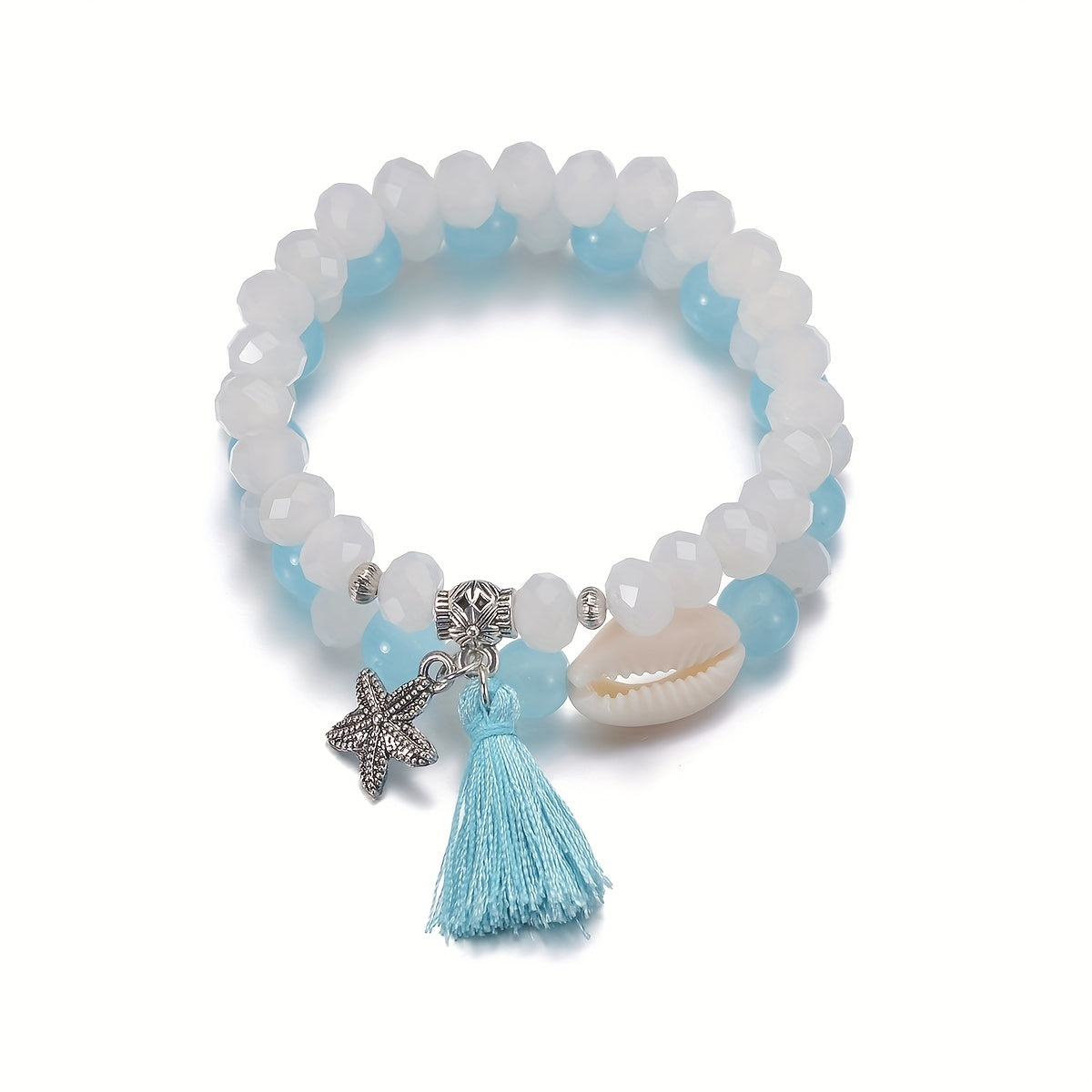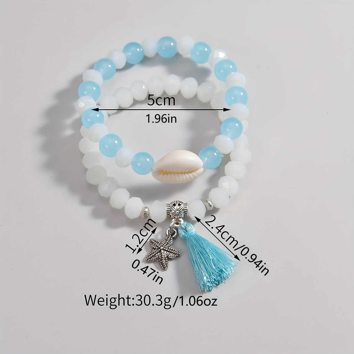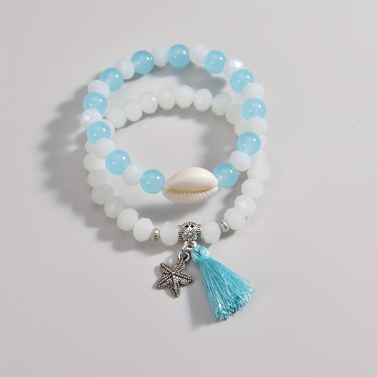 This set of 2 bracelets features glass beads, tassel, and alloy starfish pendant, perfect for summer beach decor or vacation ornament.