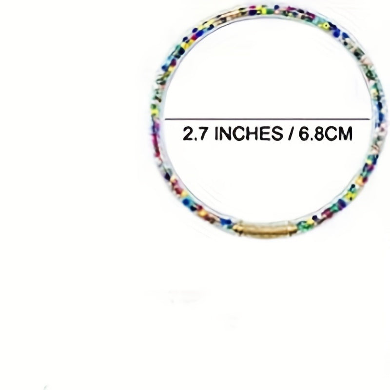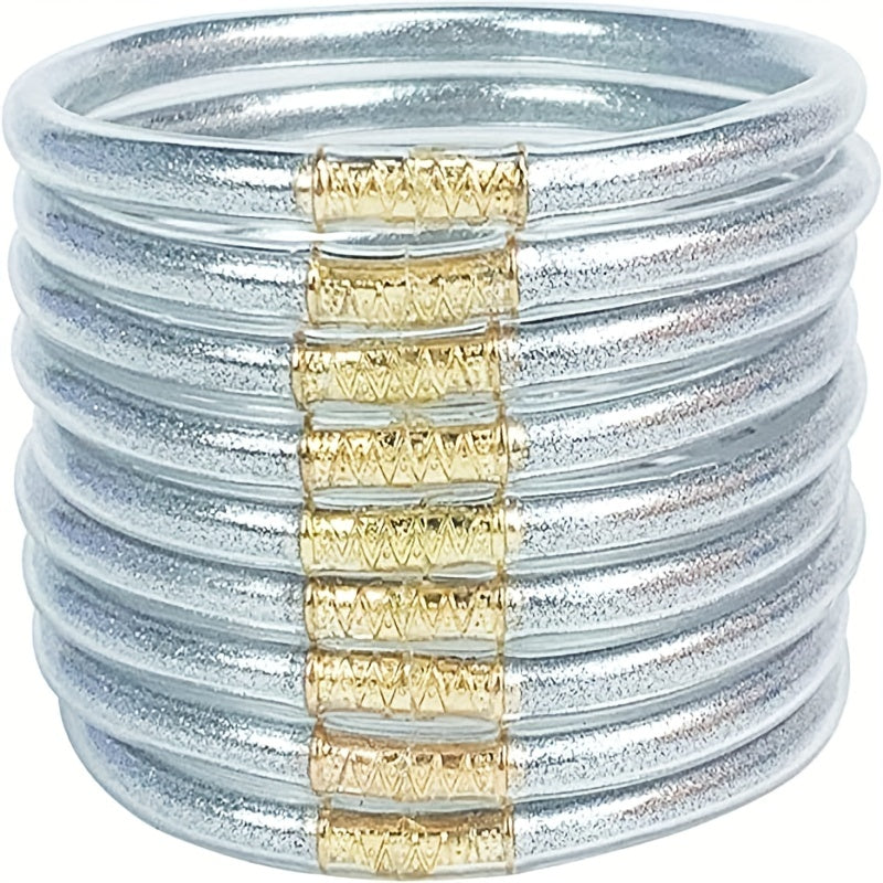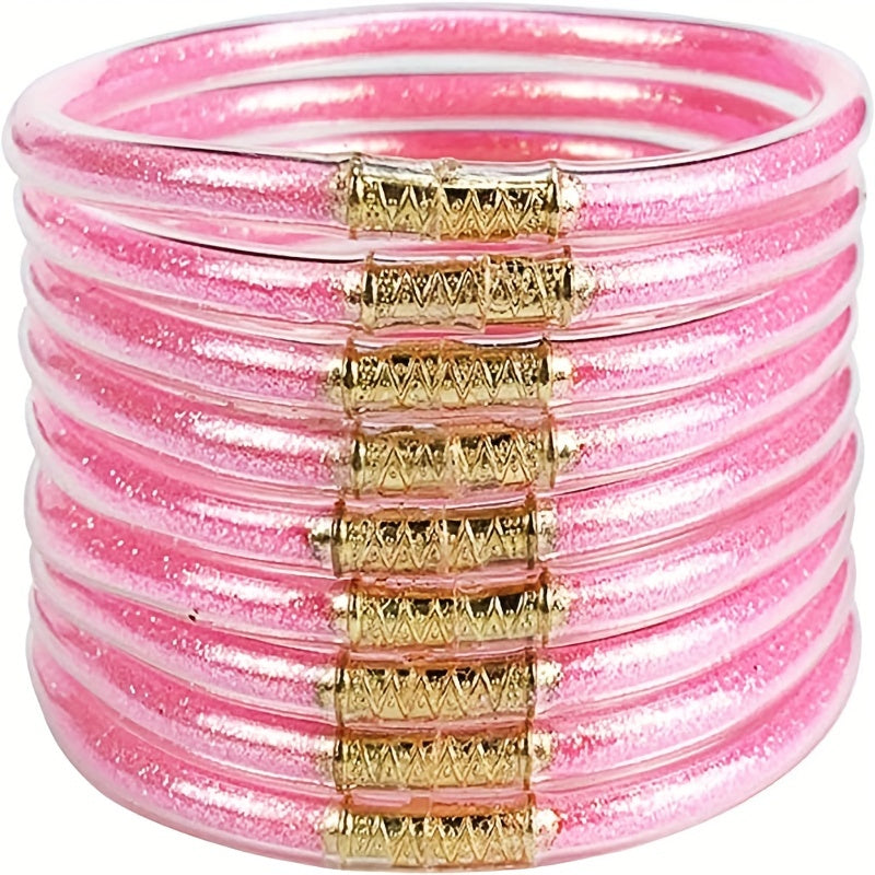 Add a touch of sparkle to your outfit with this set of 9 glitter-filled jelly bangles. Made of resin, these prayer bracelets are perfect for women and girls.