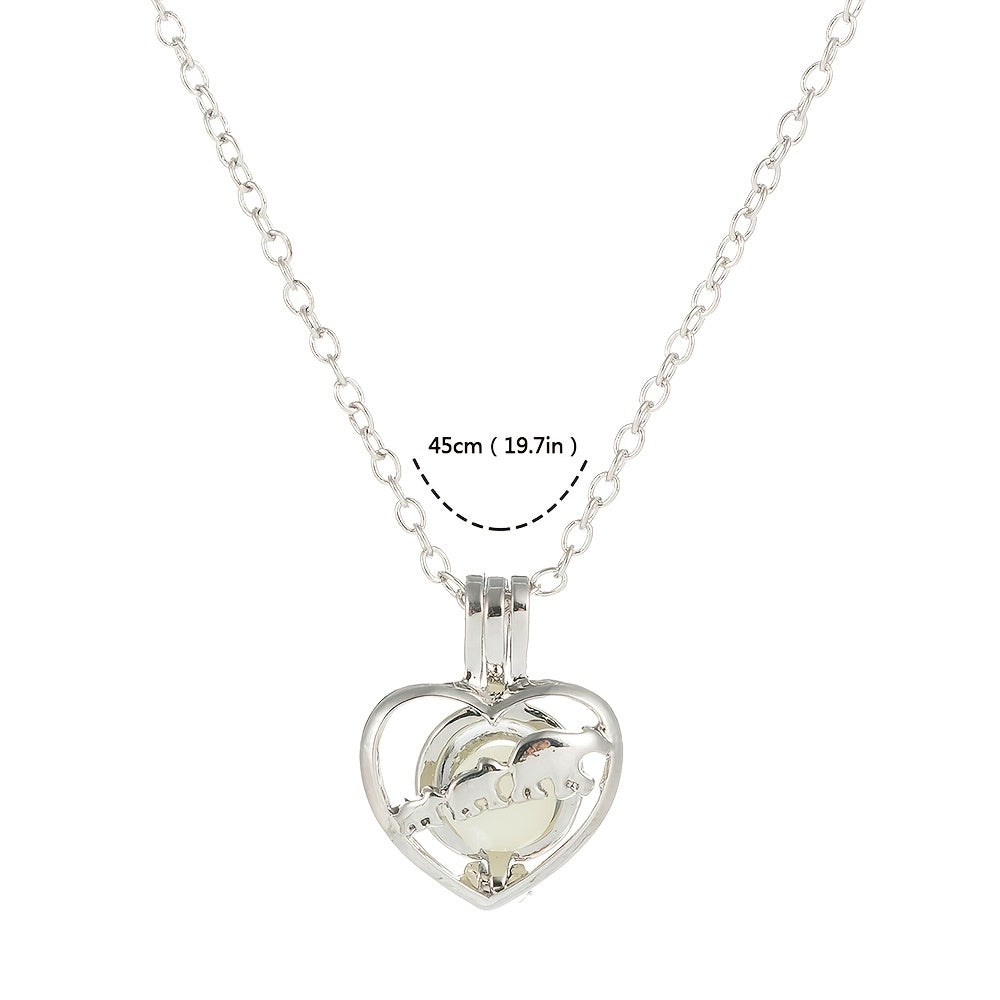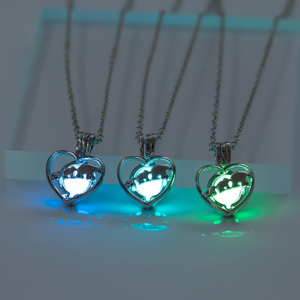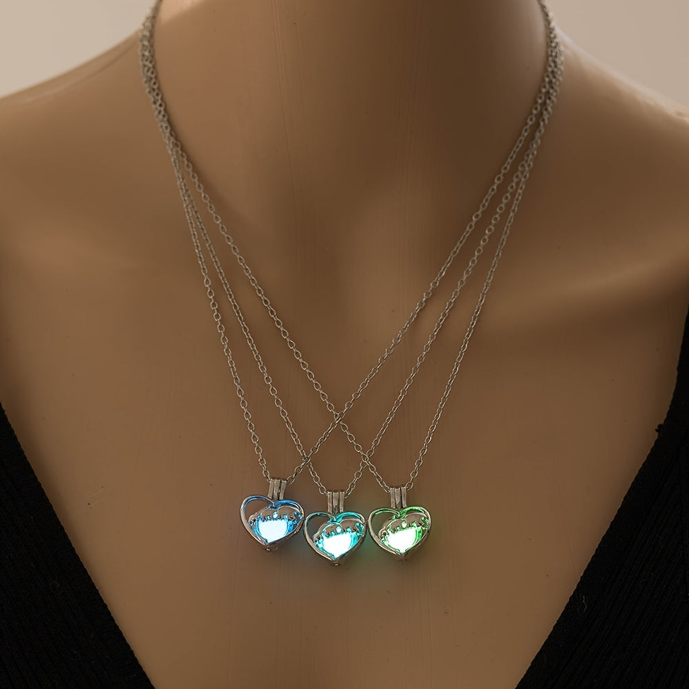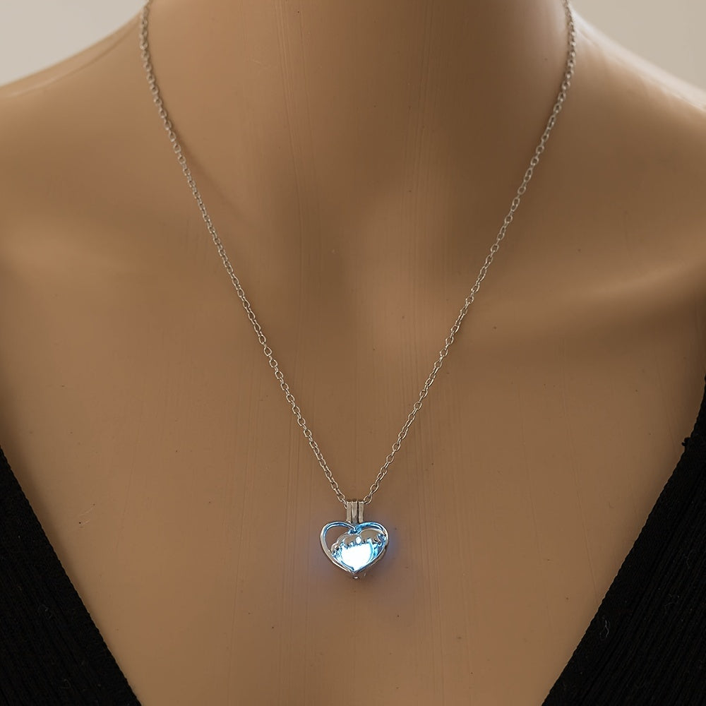 This necklace features a luminous hollow heart shape pendant with a bear pattern that glows in the dark. It is a unique and stylish piece of neck jewelry.