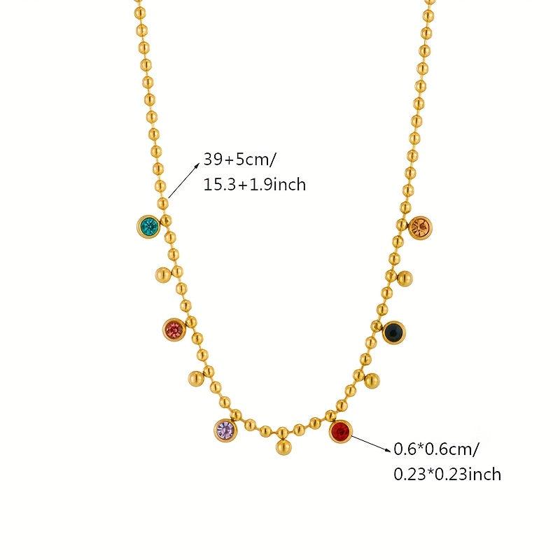 Add a touch of retro charm to your daily outfits with this golden beaded necklace featuring multicolor rhinestones. Perfect for adding a pop of color and sparkle!