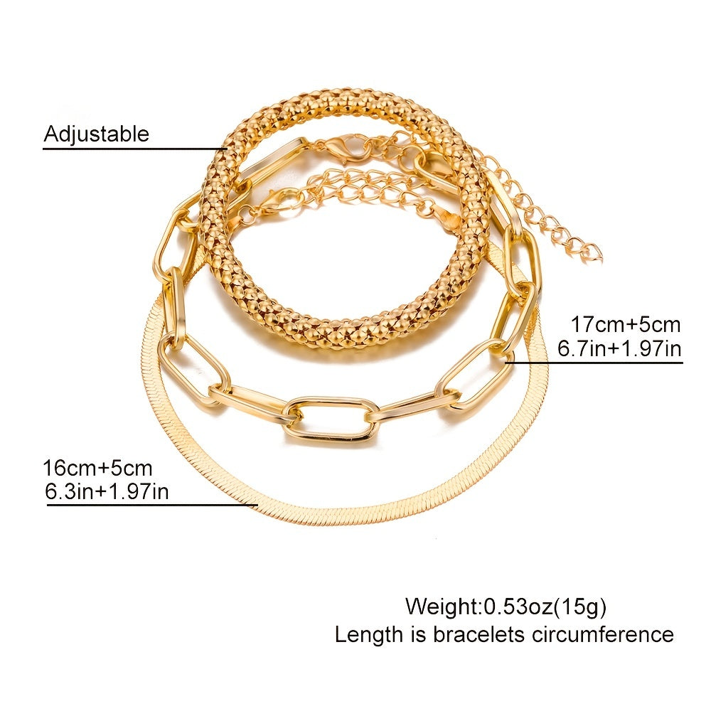 Elevate your style with this gorgeous set of three golden chain bracelets. Perfect for adding a touch of sophistication to any outfit.