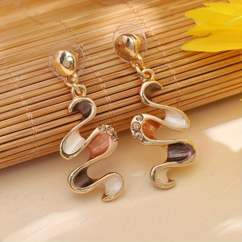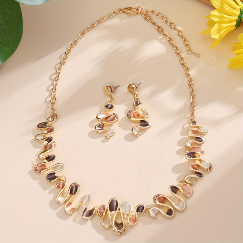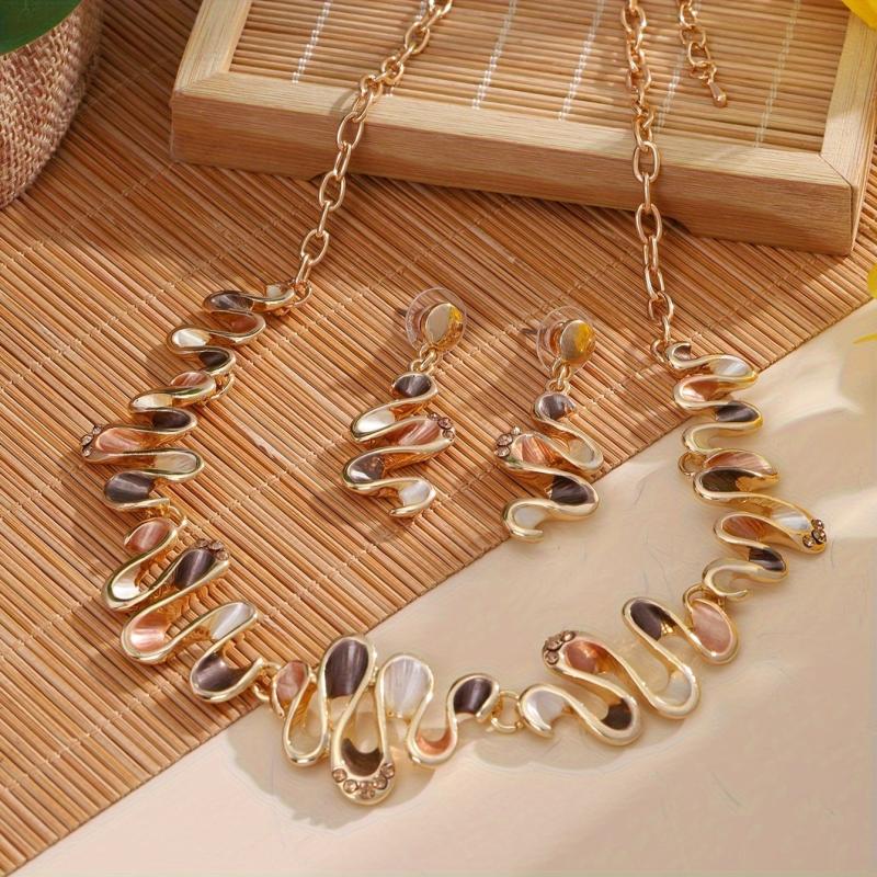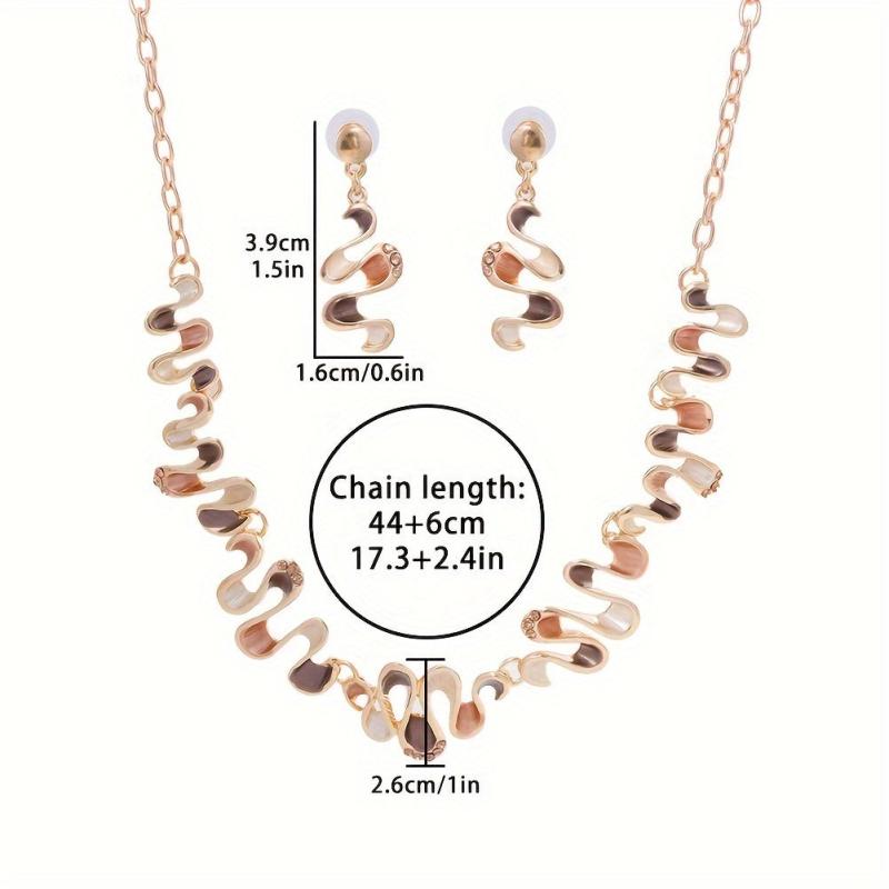 This elegant jewelry set includes 2 pairs of earrings and 1 necklace, made of zinc alloy with golden enamel inlaid with water drill in khaki and antique silvery retro geometric design.