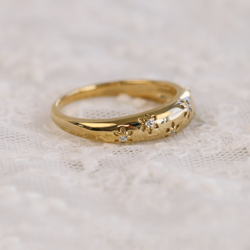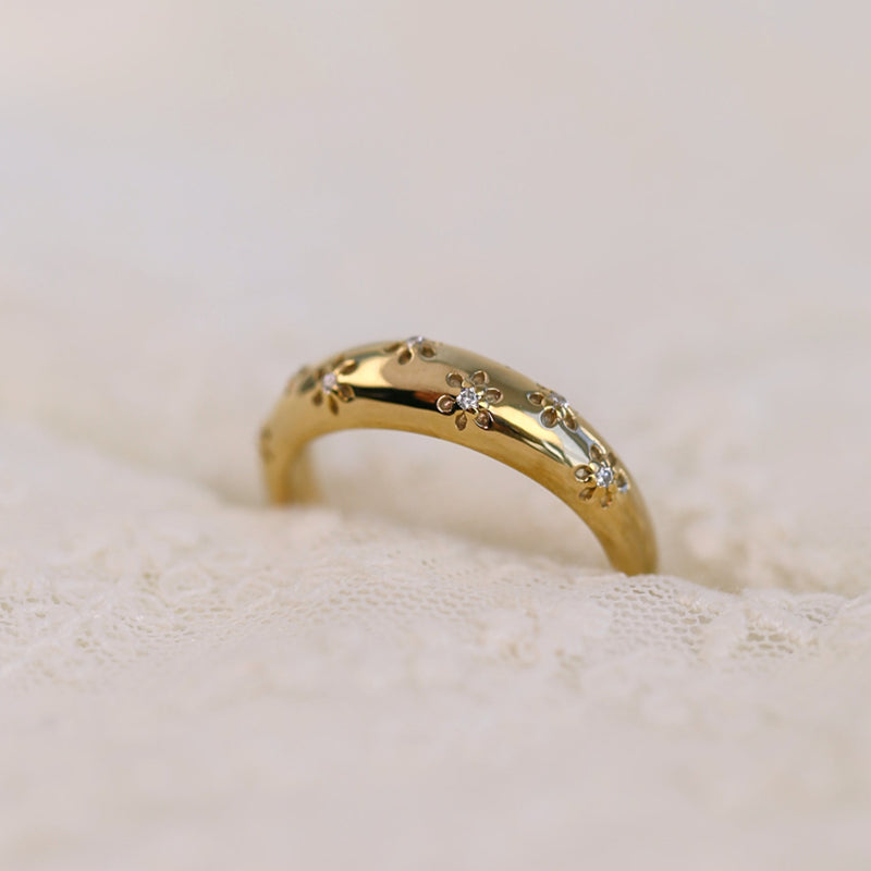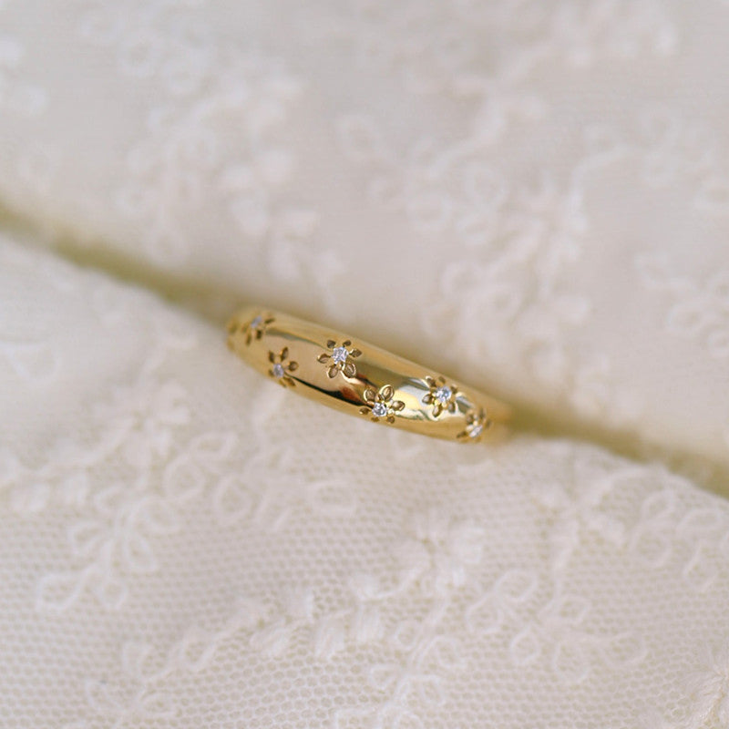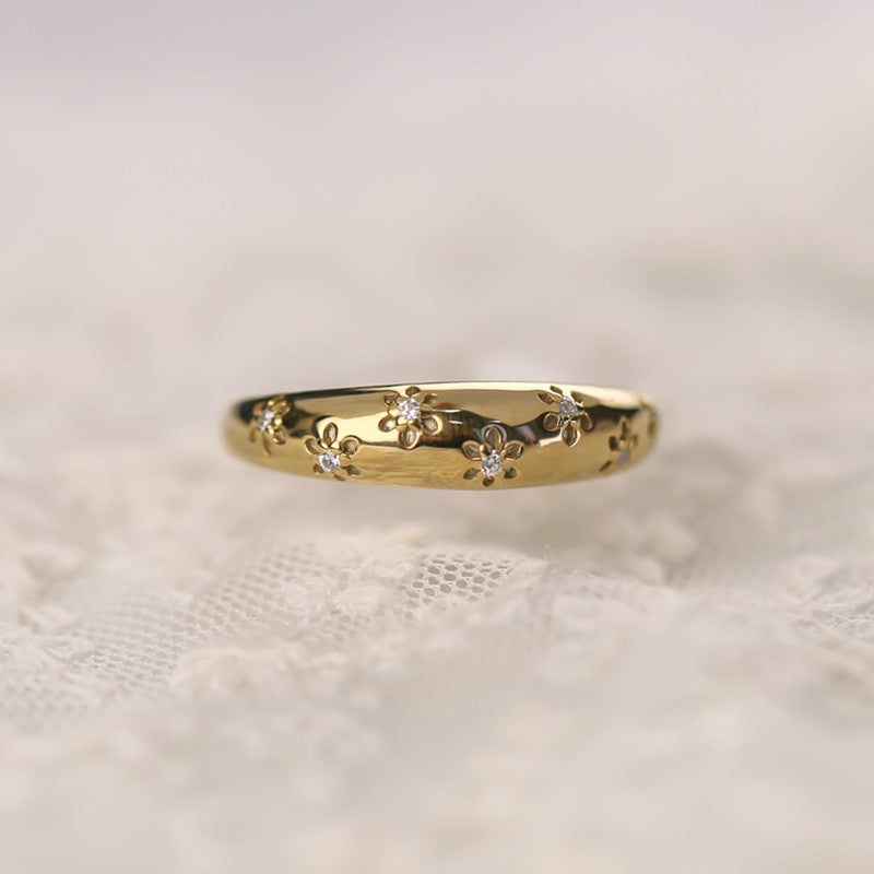 This delicate golden flower ring is a perfect accessory for birthdays, parties, weddings, engagements, and anniversaries. It is a stunning piece of jewelry that will add elegance to any outfit.