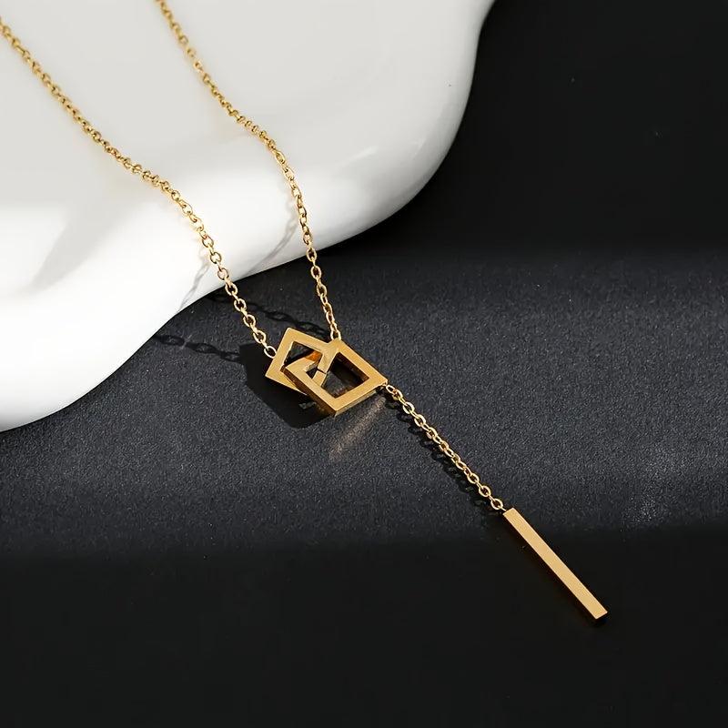 Elegant and versatile, this minimalist pendant necklace features a golden geometric square and bar design. It is perfect for both casual attire and special occasions, adding a touch of sophistication to your look.