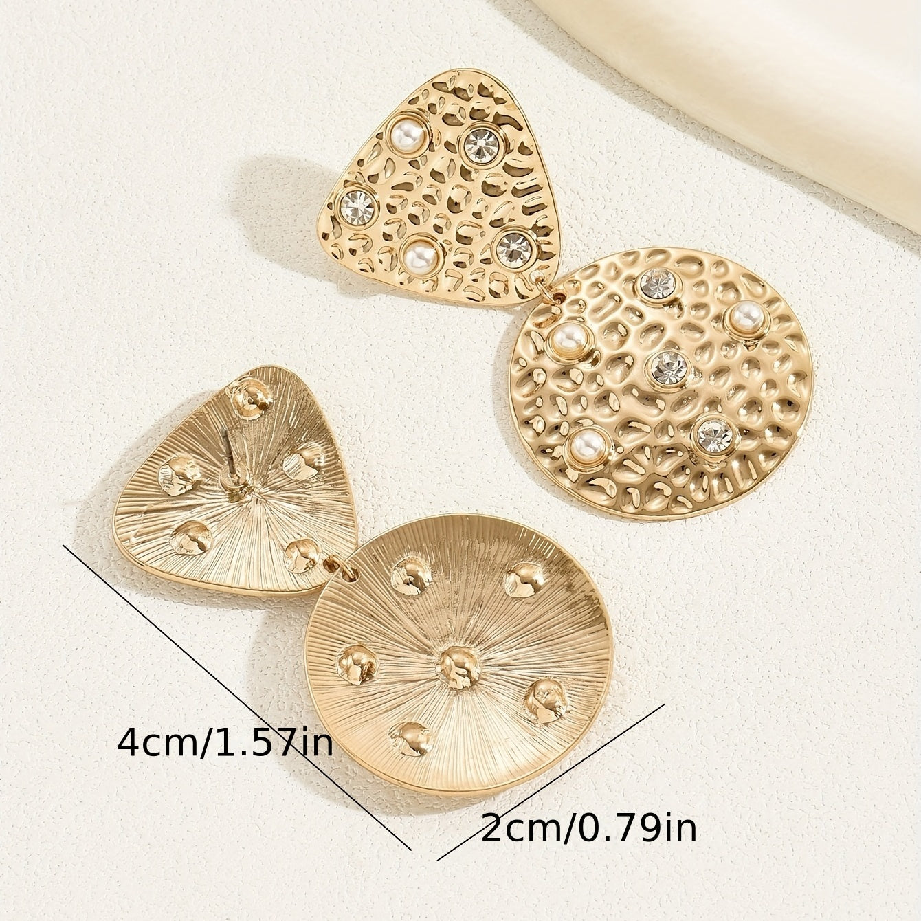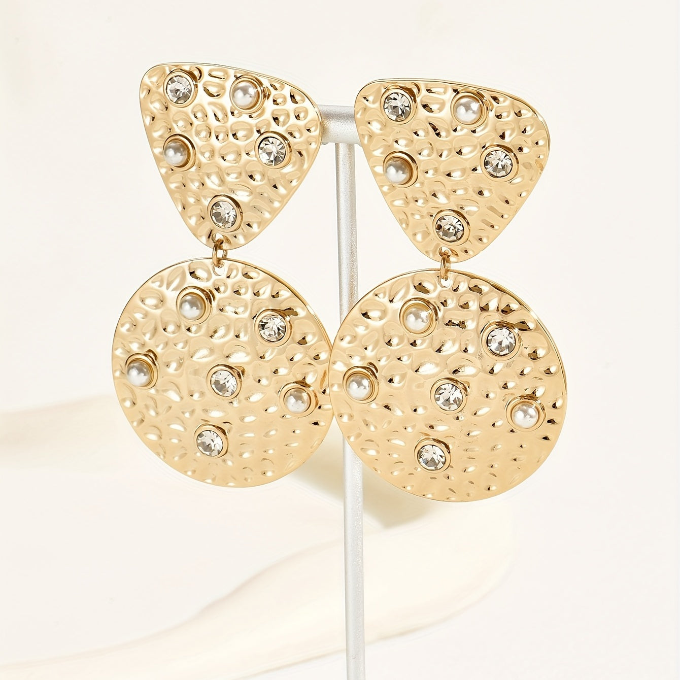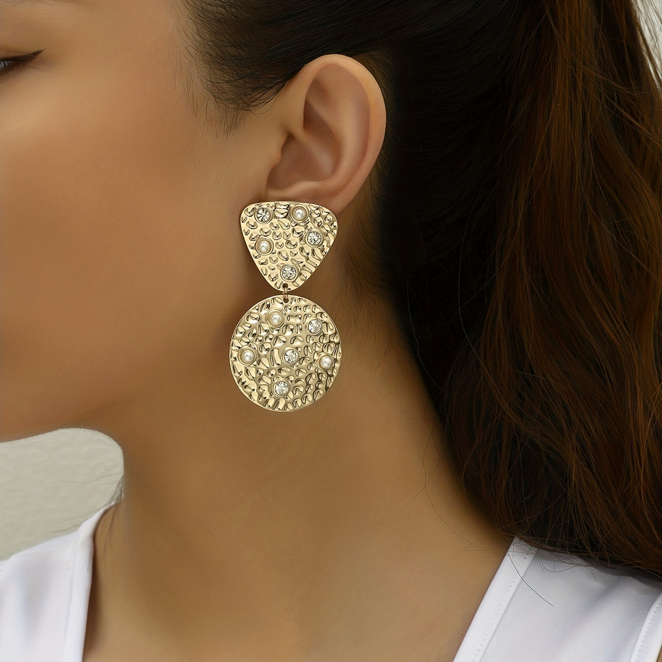 Add a touch of glamour to your daily look with these stylish alloy earrings featuring a golden hammer pattern and rhinestone faux pearl decoration.