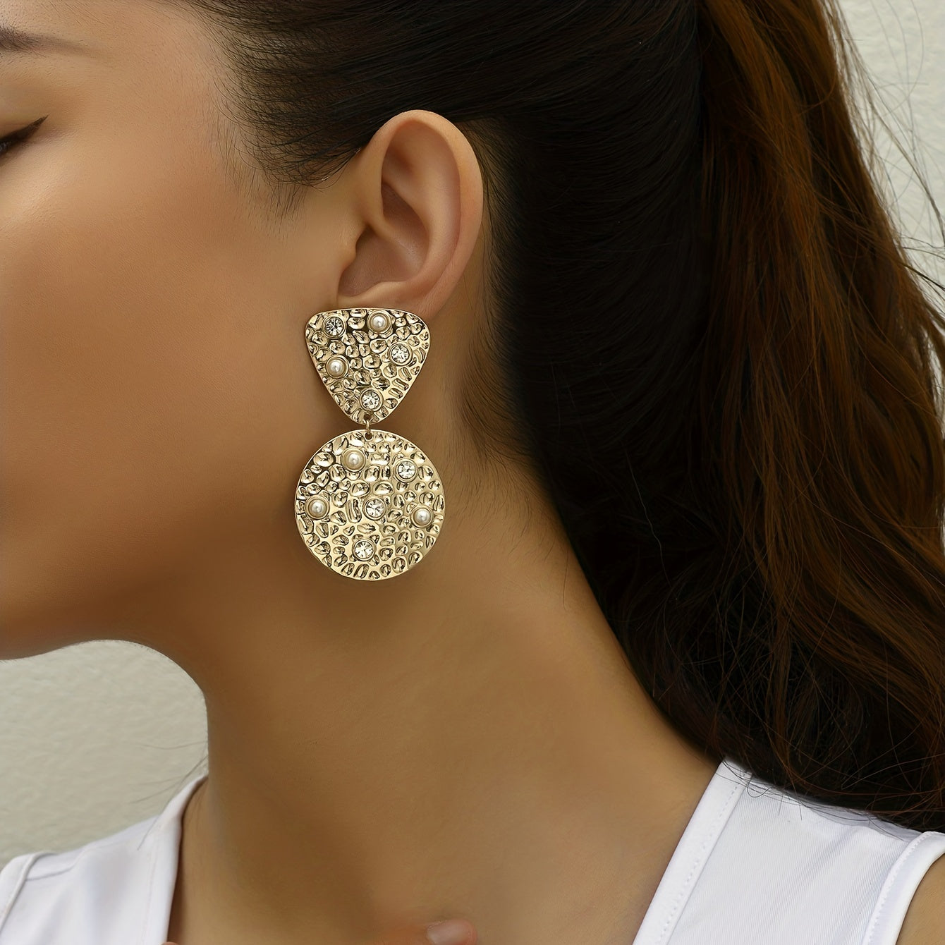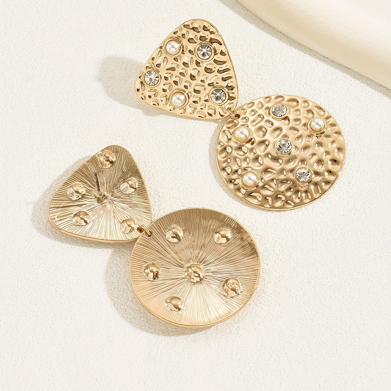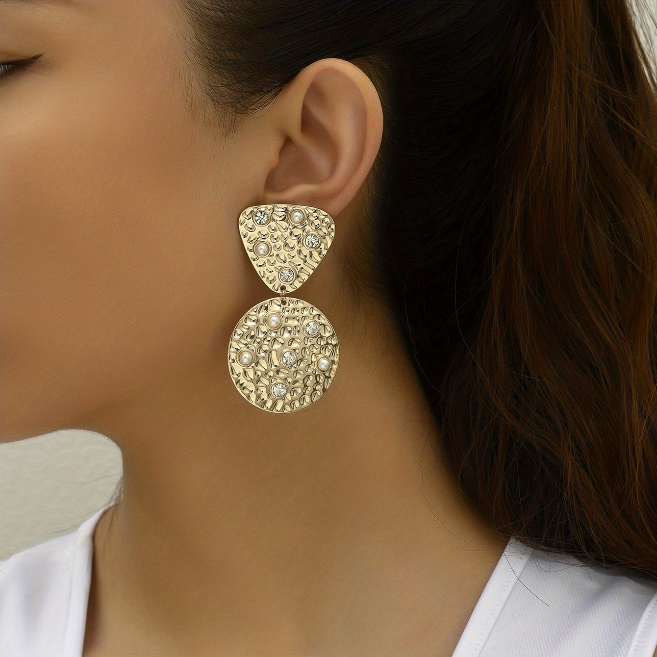 Add a touch of glamour to your daily look with these stylish alloy earrings featuring a golden hammer pattern and rhinestone faux pearl decoration.