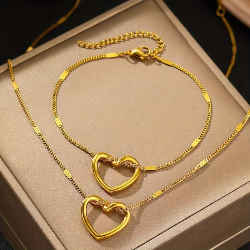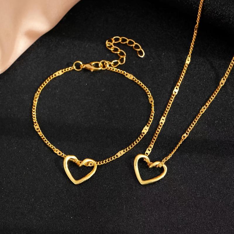 This set includes a golden heart pendant bracelet and necklace made of stainless steel and copper alloy. Perfect for daily wear and holiday occasions, this set complements casual attire effortlessly.