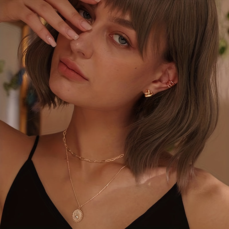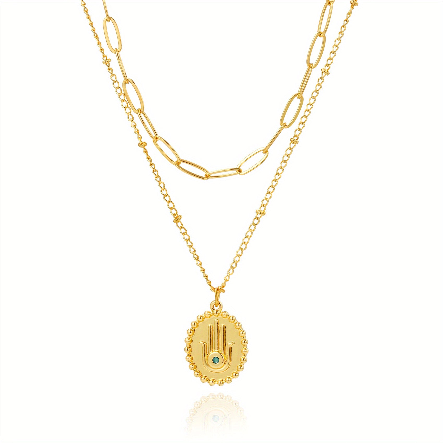 Golden Paperclip Chain Necklace with Hamsa Hand Eye Pendant
