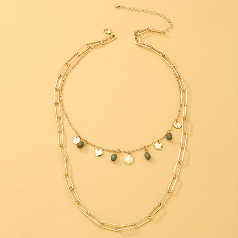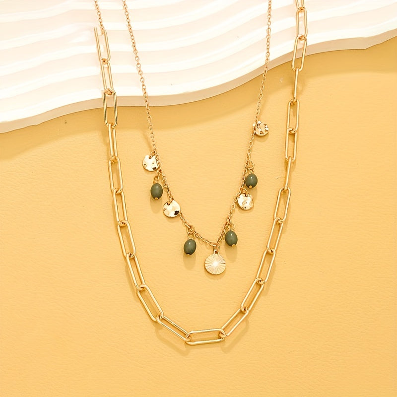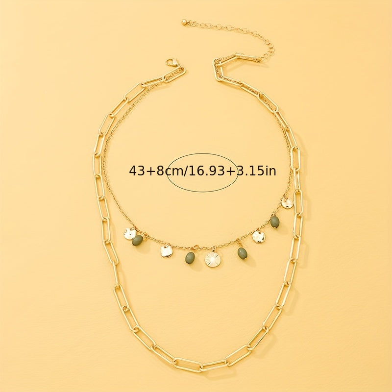 Add a touch of elegance to your outfit with this stylish double layer necklace featuring a golden paperclip chain and round pendant. Perfect for parties and holiday gatherings.
