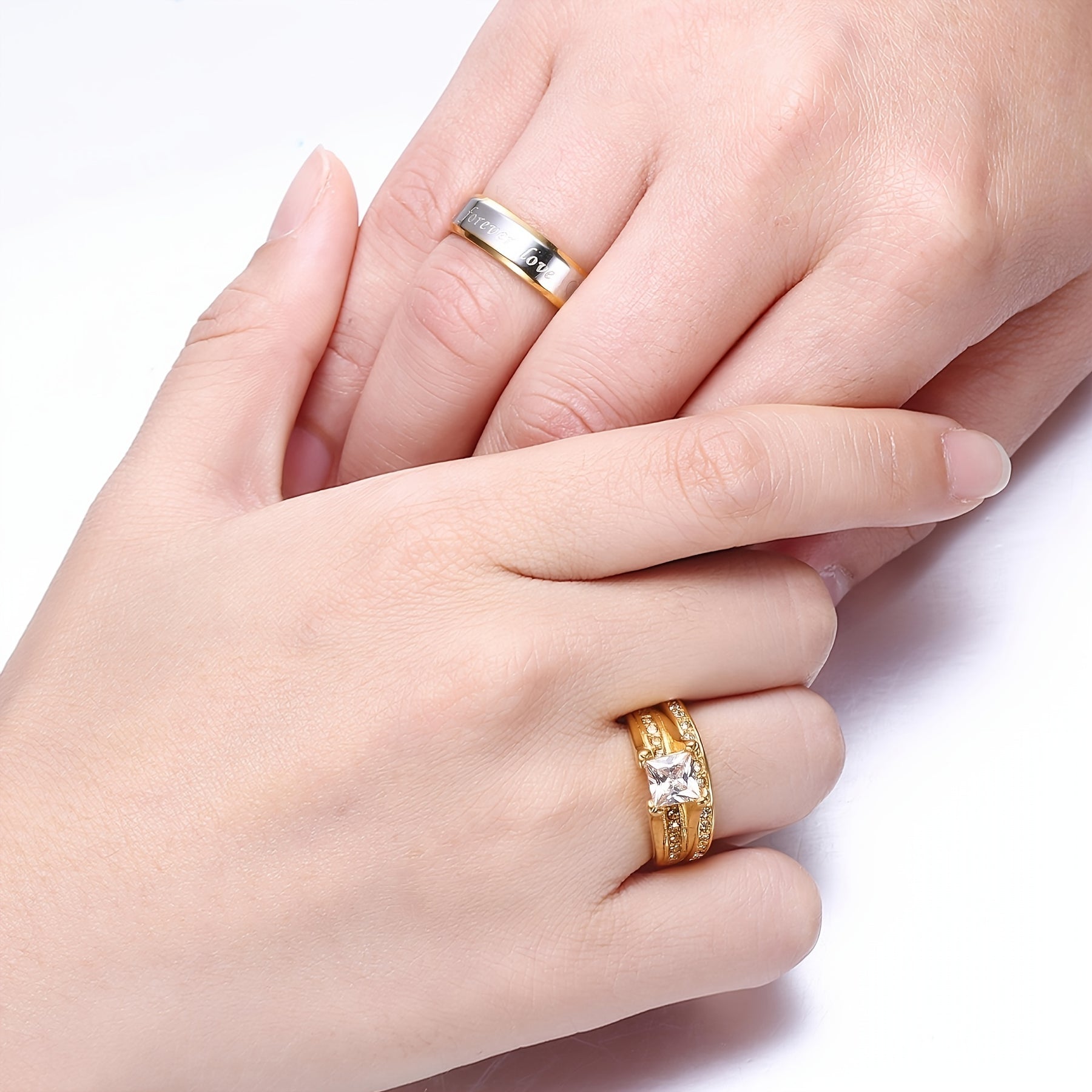 This stainless steel ring is a perfect promise or wedding ring. The design features alphabets with hearts and arrows, suitable for both men and women.