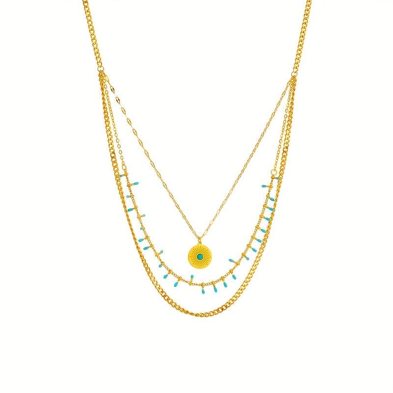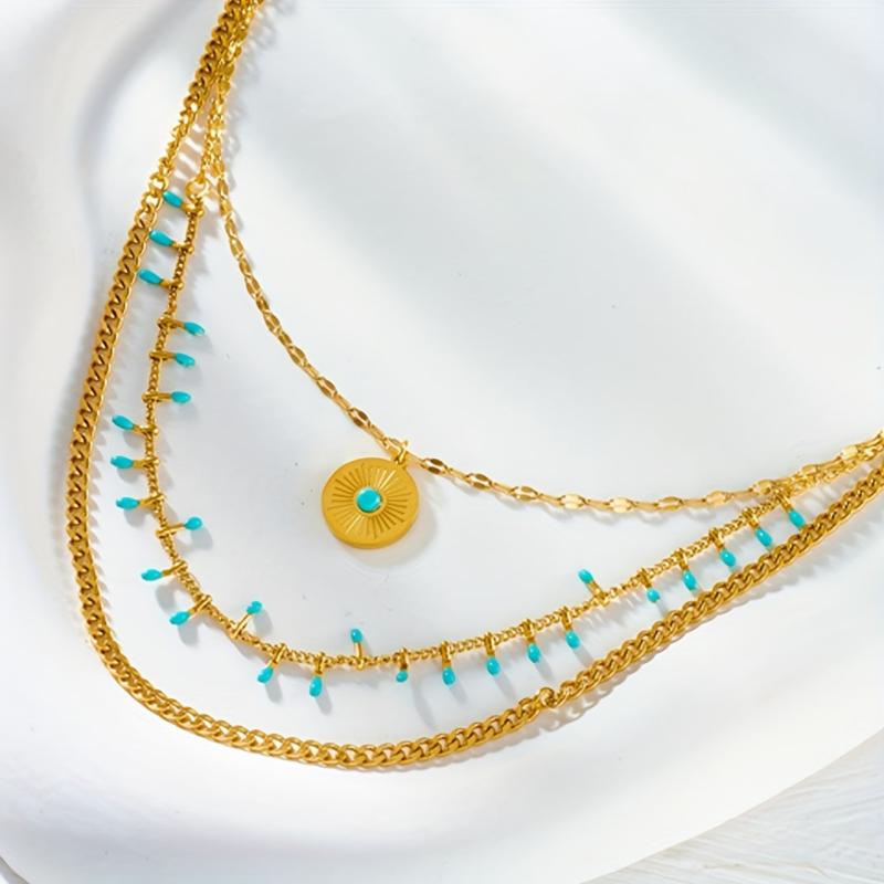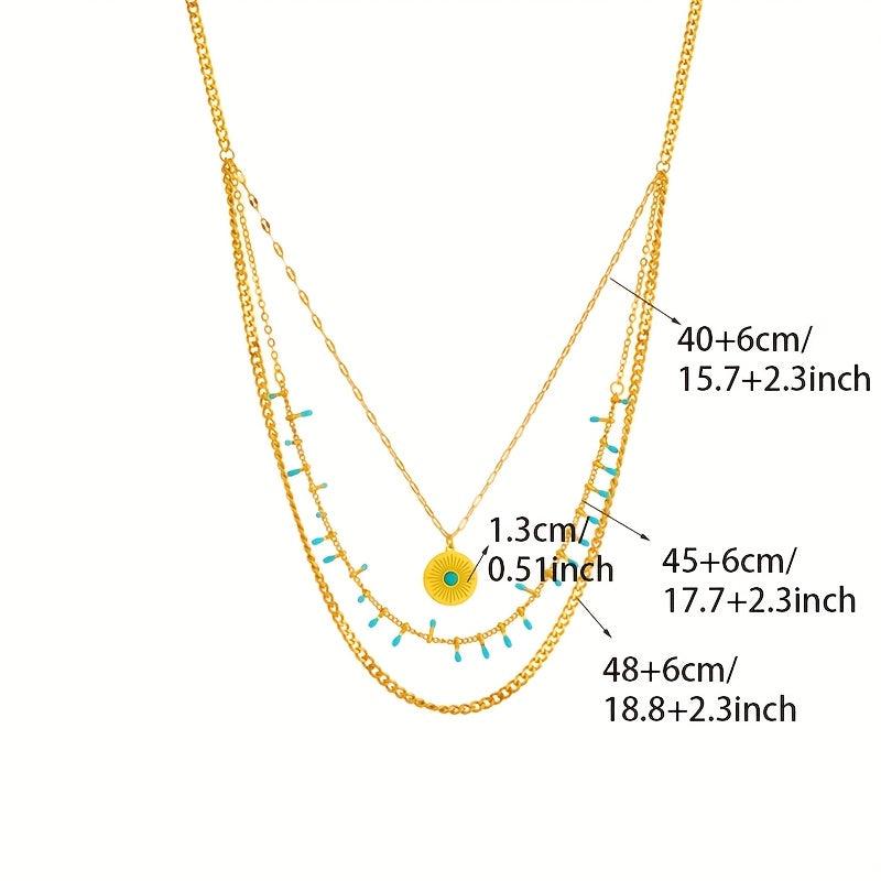This fashionable classic layer necklace features a golden stainless steel design with a creative retro circular pendant. It is suitable for both men and women to wear and can also be used as a stylish accessory.