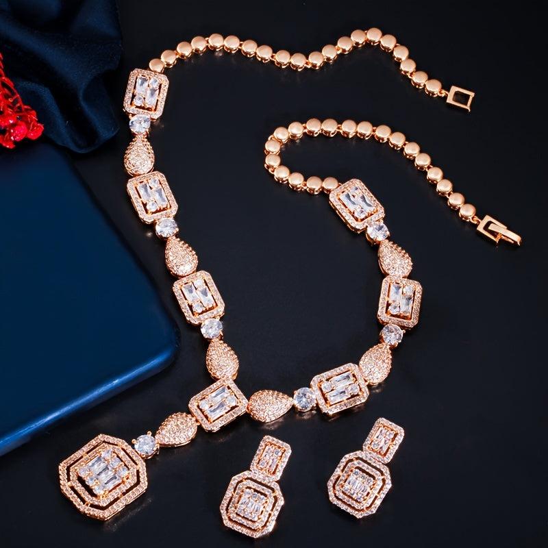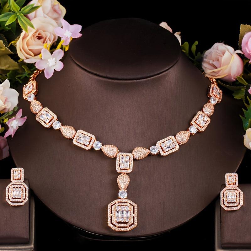 Elegant set with waterdrop & rectangle pendants, made with synthetic zirconia in a paved setting. Perfect for special occasions or daily wear.