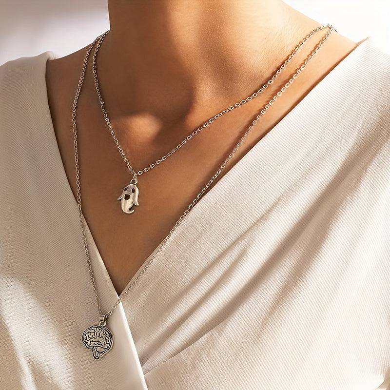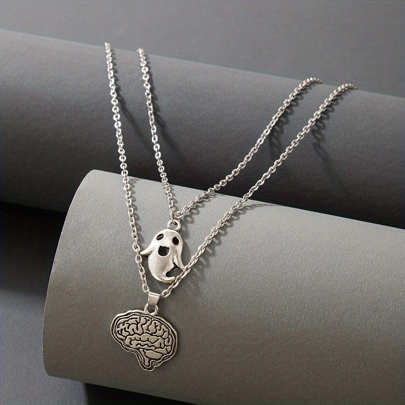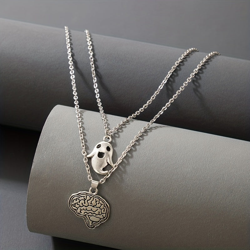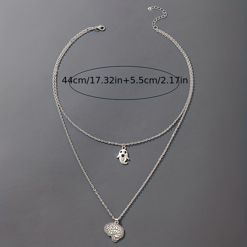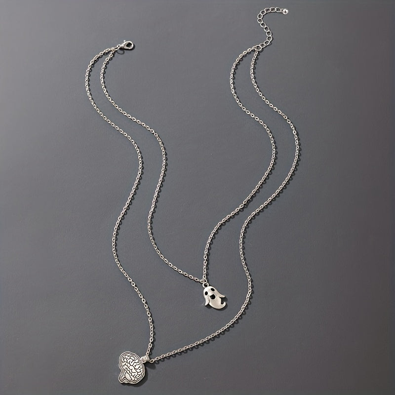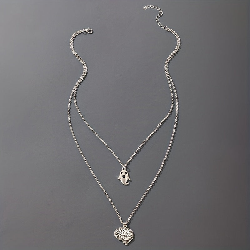 This exaggerated double layer necklace is perfect for Halloween with its spooky ghost and brain pendant design.