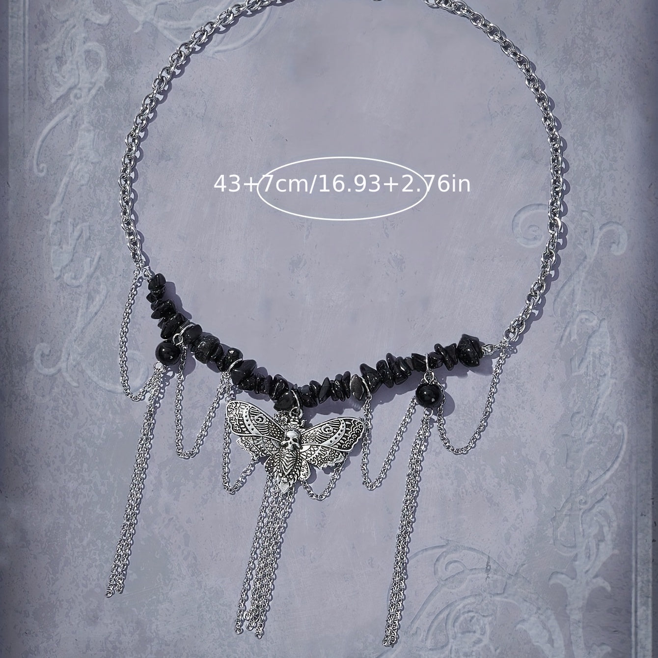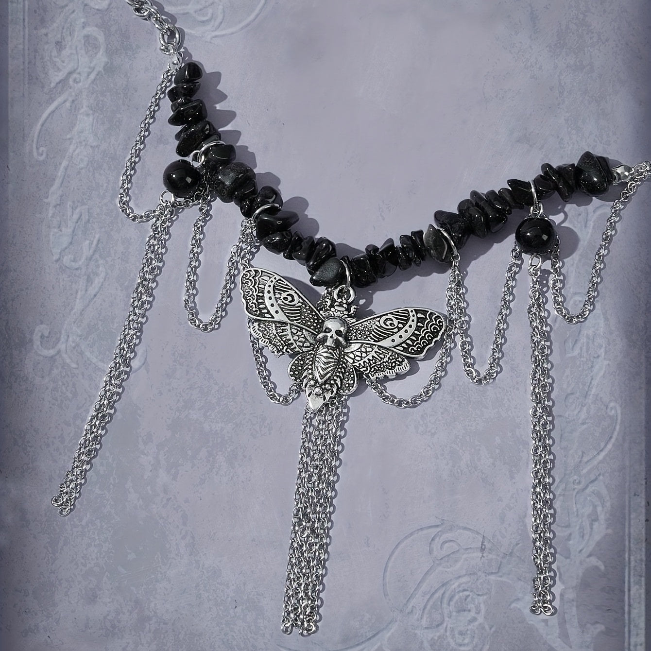 Elegant and edgy, this necklace features a gothic moth element pendant with broken stone tassel design. Perfect for parties or punk style.