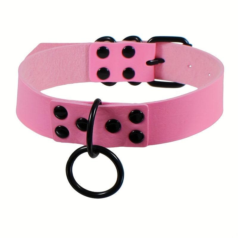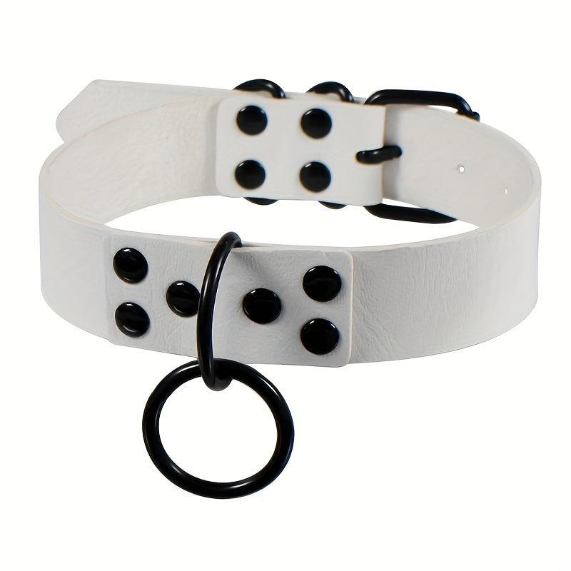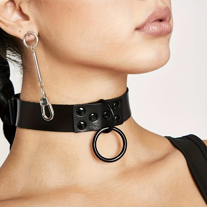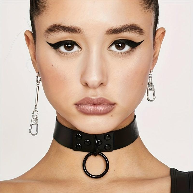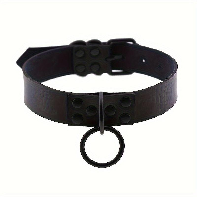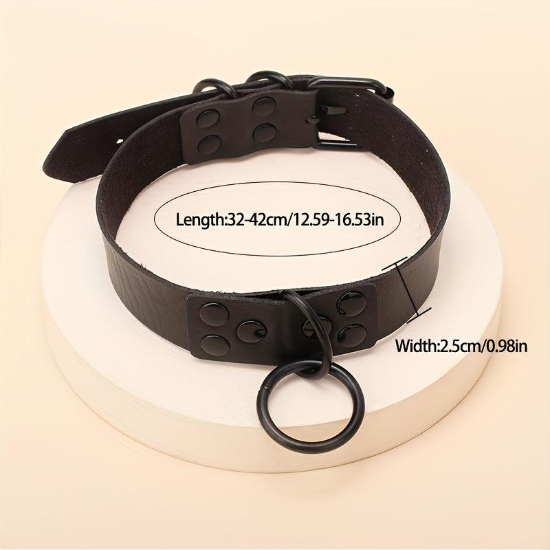 This trendy Gothic Punk Choker Necklace features a round ring pendant made of PU leather, perfect for a Y2K aesthetic.