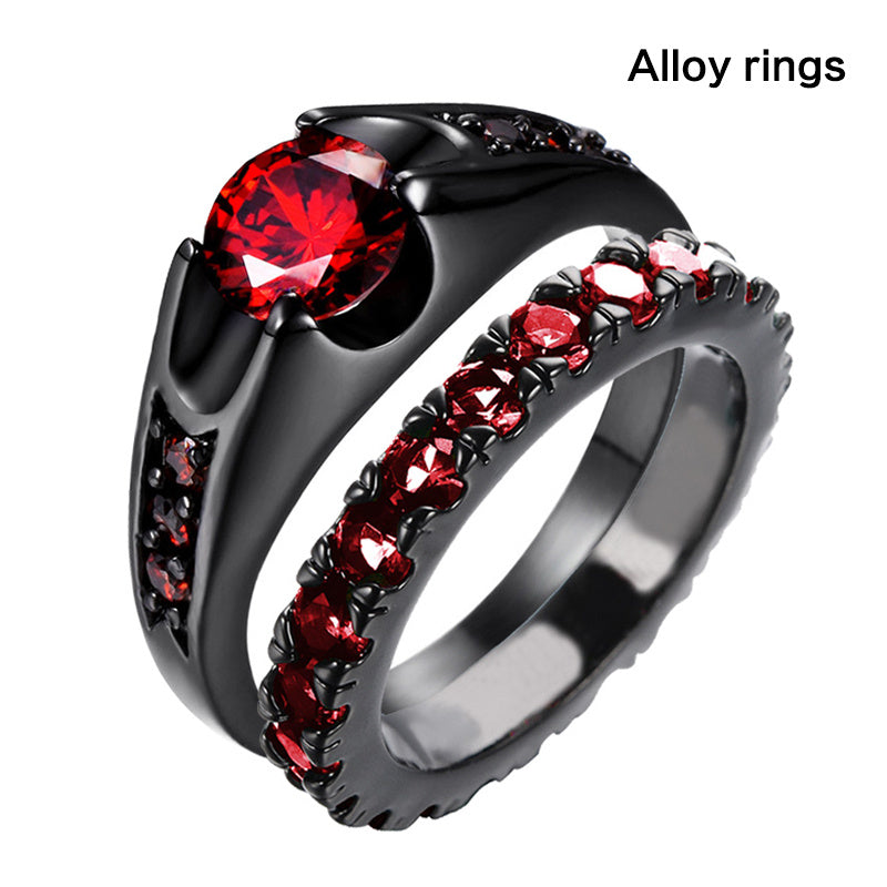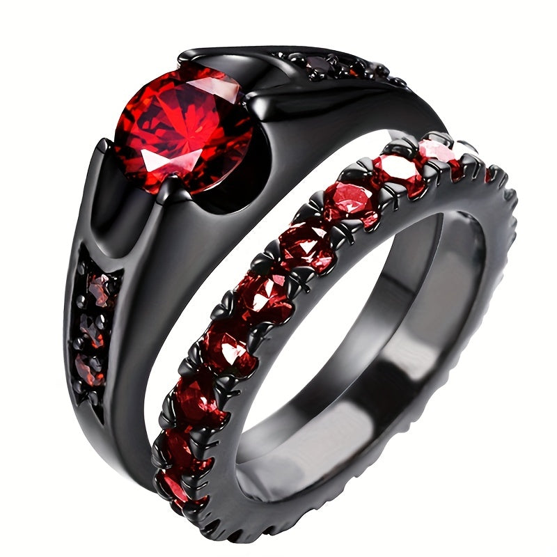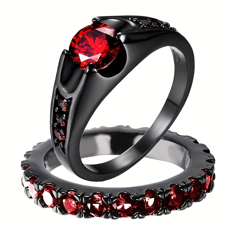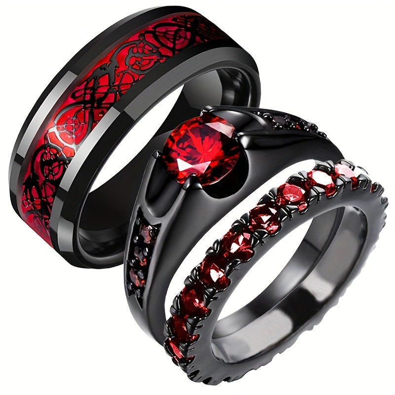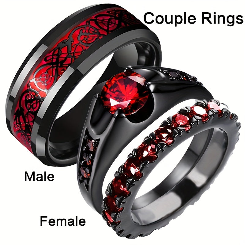 This Gothic Punk Couple Ring Set features red zircon gemstones, perfect for engagement or wedding. The women's ring is elegant and stylish, while the men's ring adds a touch of punk flair to the couple's look.