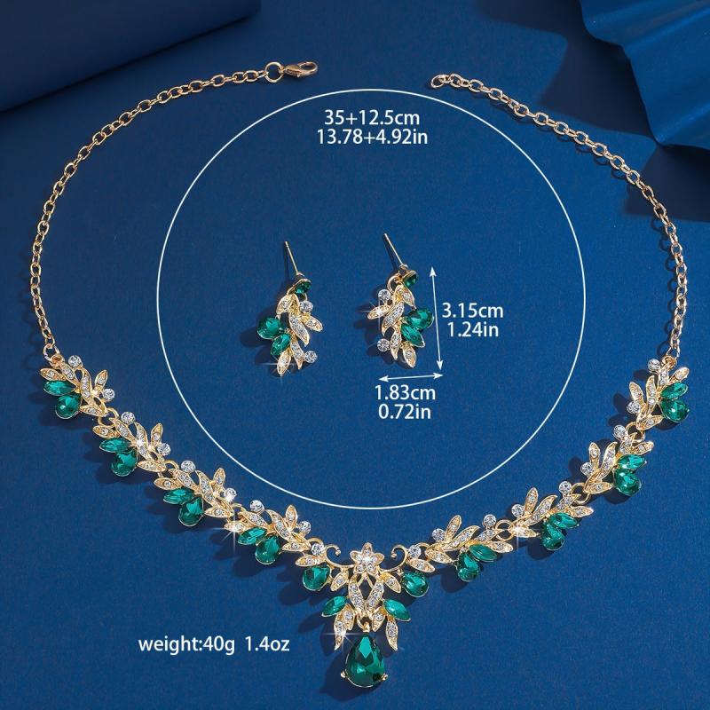 This dazzling green rhinestone jewelry set features an exaggerated metal flower design, perfect for weddings and parties.