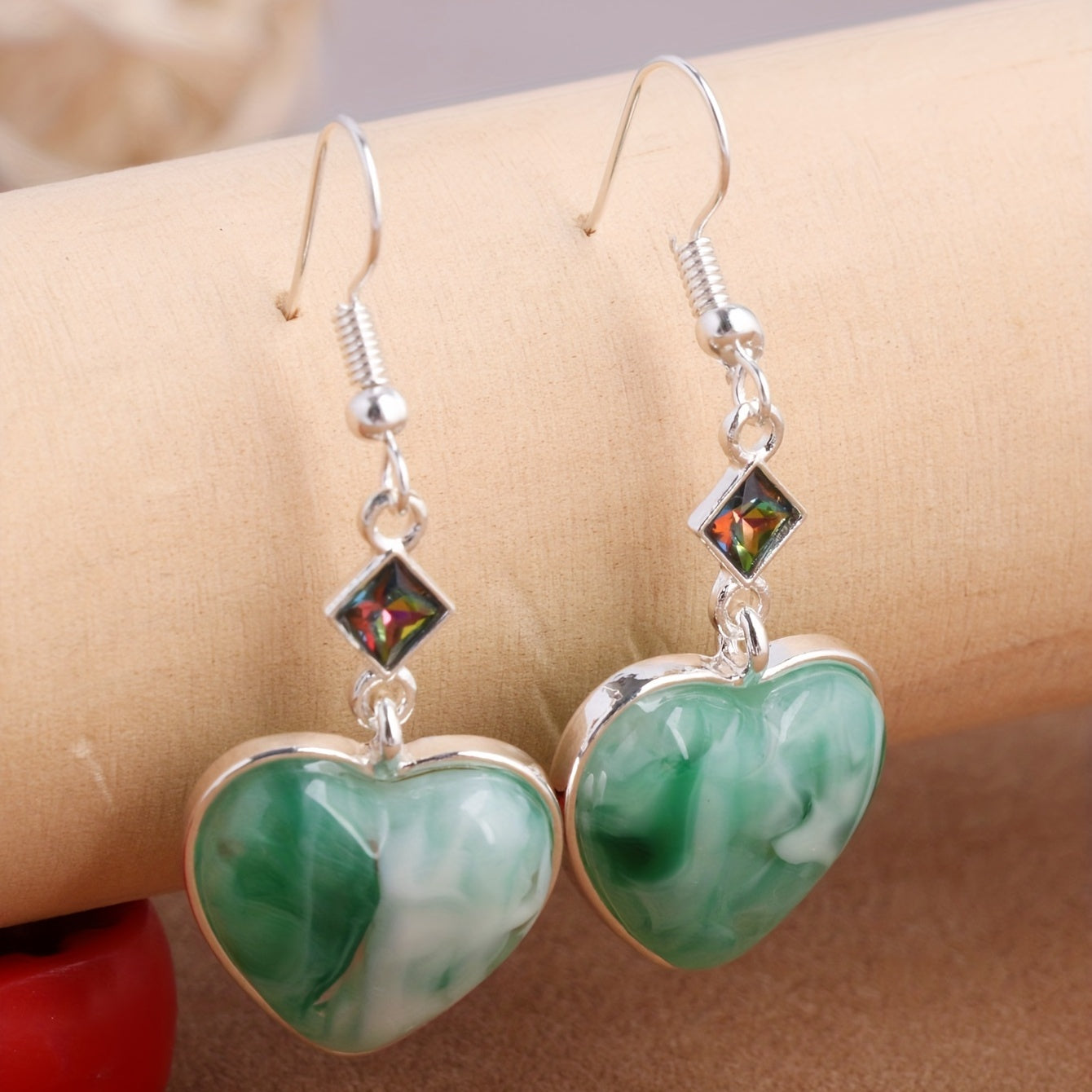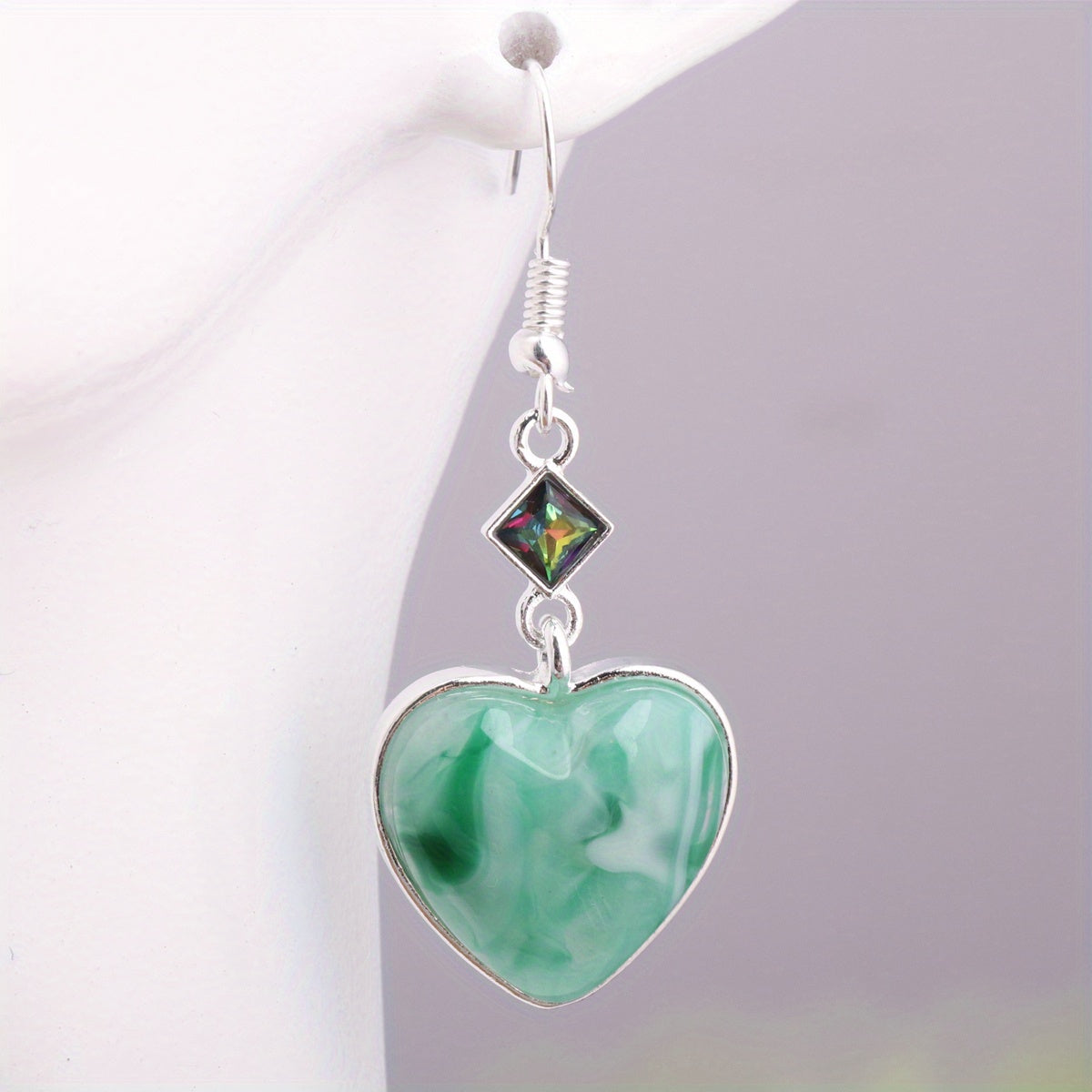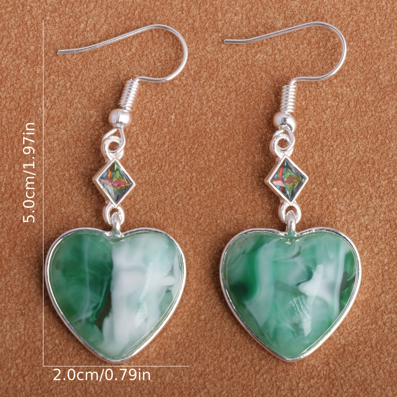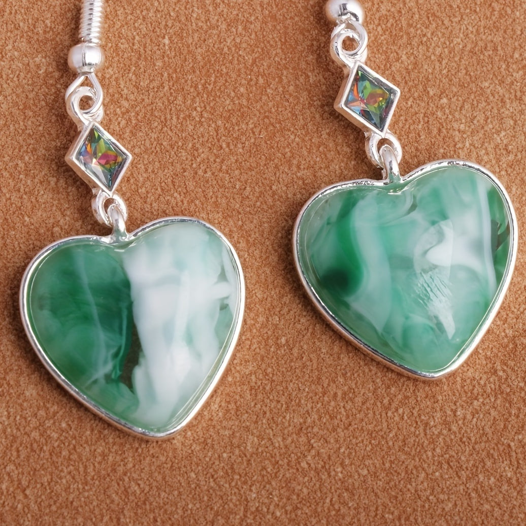 These heart-shaped green synthetic gems dangle earrings are a perfect bohemian ethnic style accessory. Made of zinc alloy, they make a great gift for any occasion.