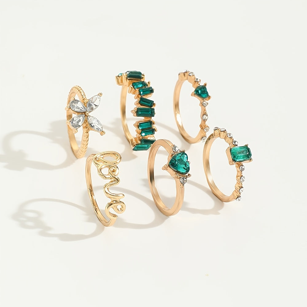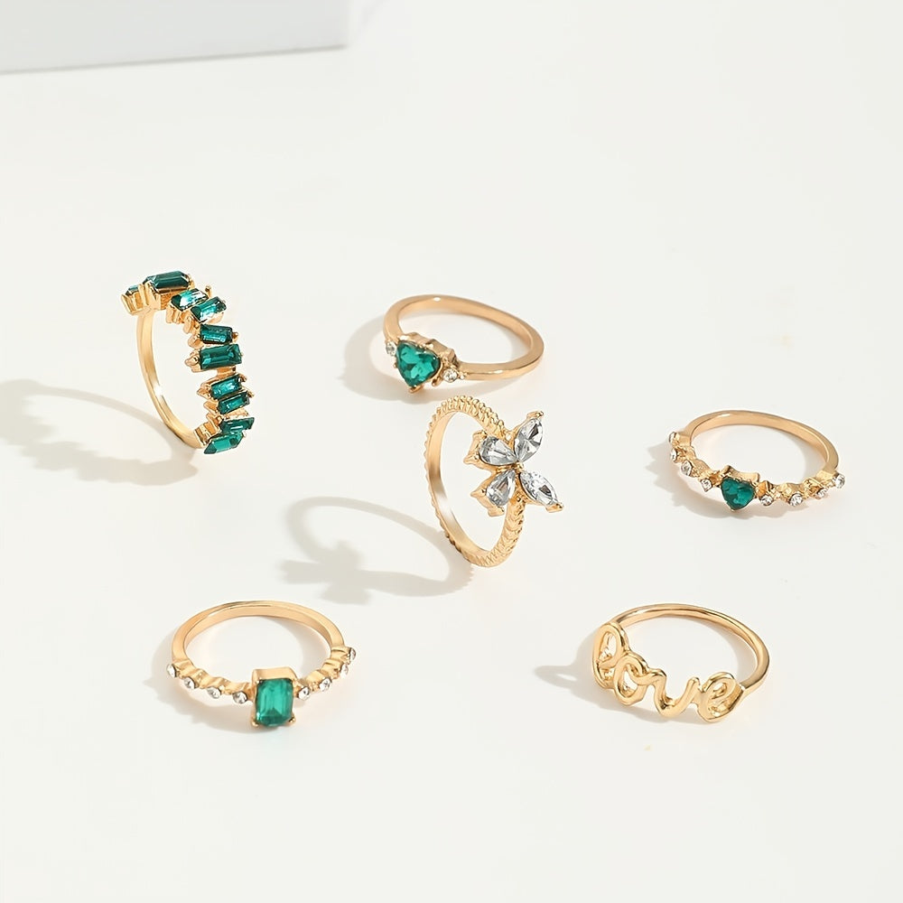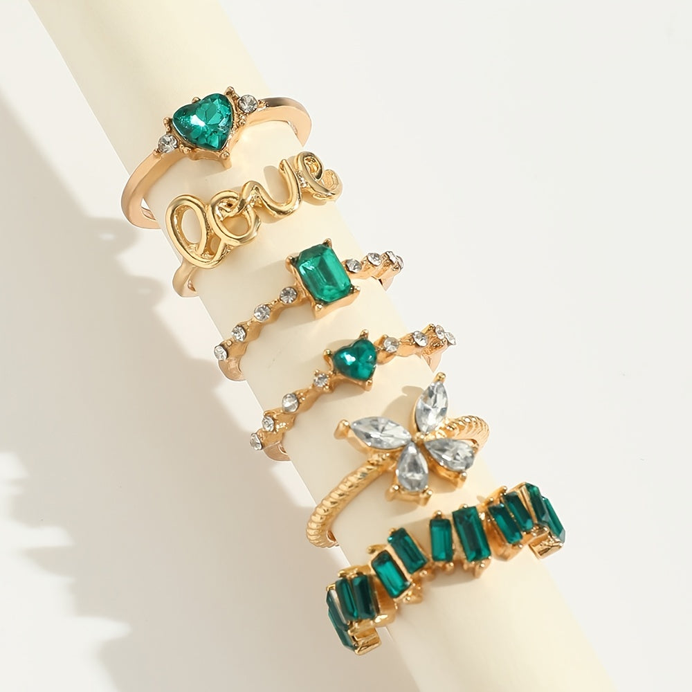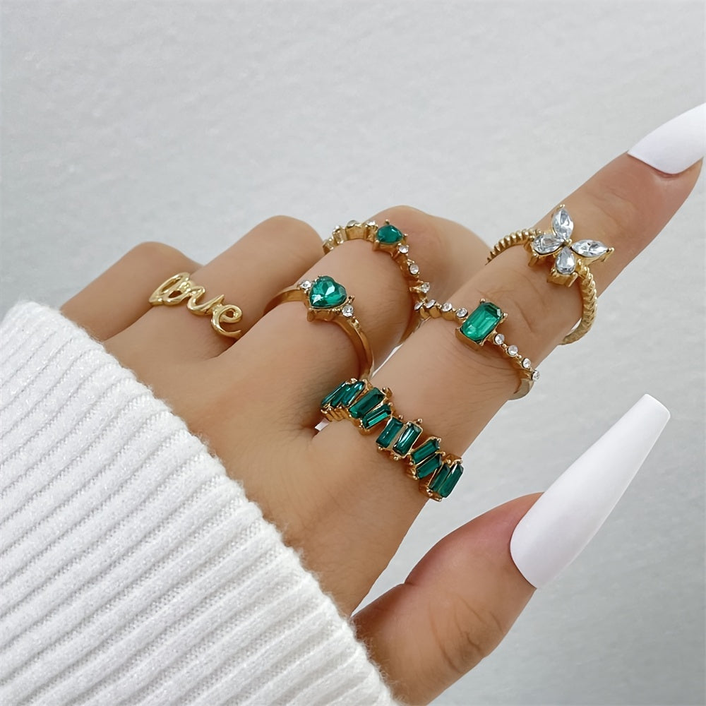 This set of 6 rings features a green vintage emerald heart, love alphabet, and butterfly designs in a geometric style. Perfect for adding a touch of elegance and charm to your outfits.