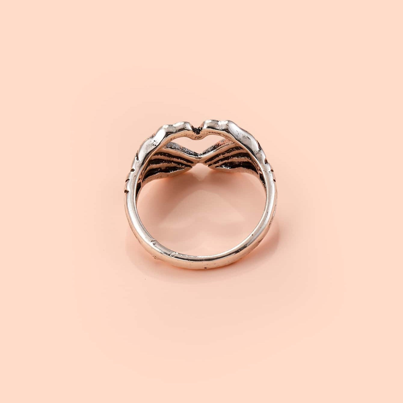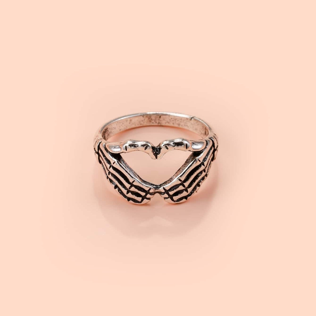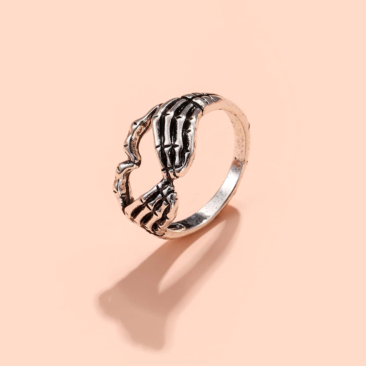 Add a spooky touch to your Halloween outfit with this Skull Heart Gesture Ring. The ring features a detailed skull design with a heart-shaped eye socket and skeleton hand gesture.
