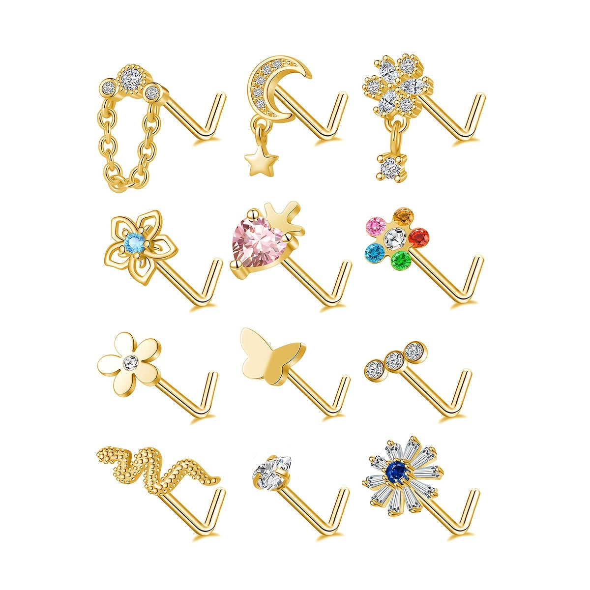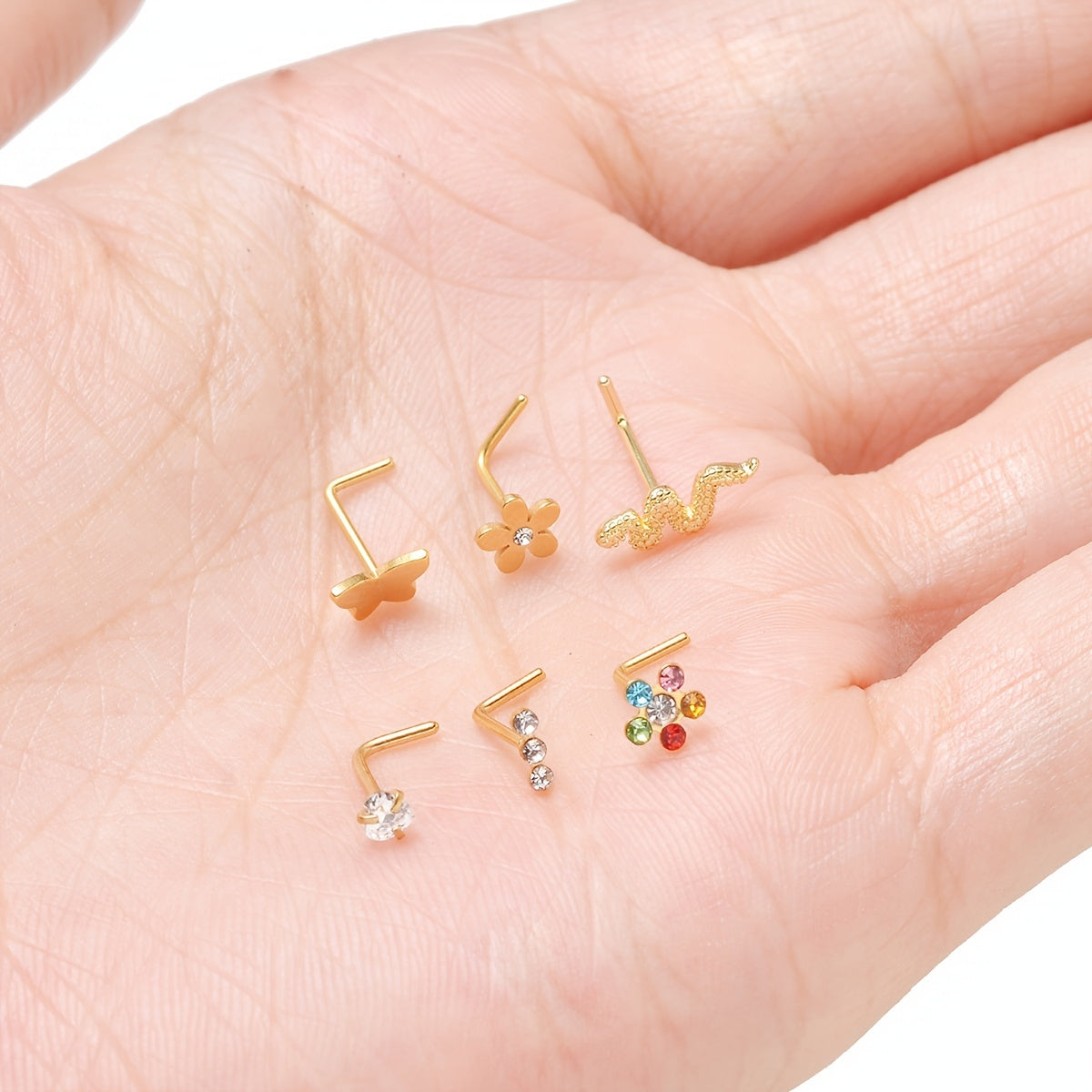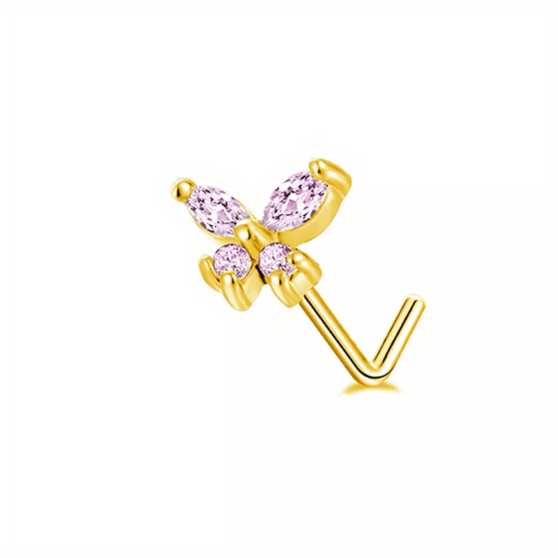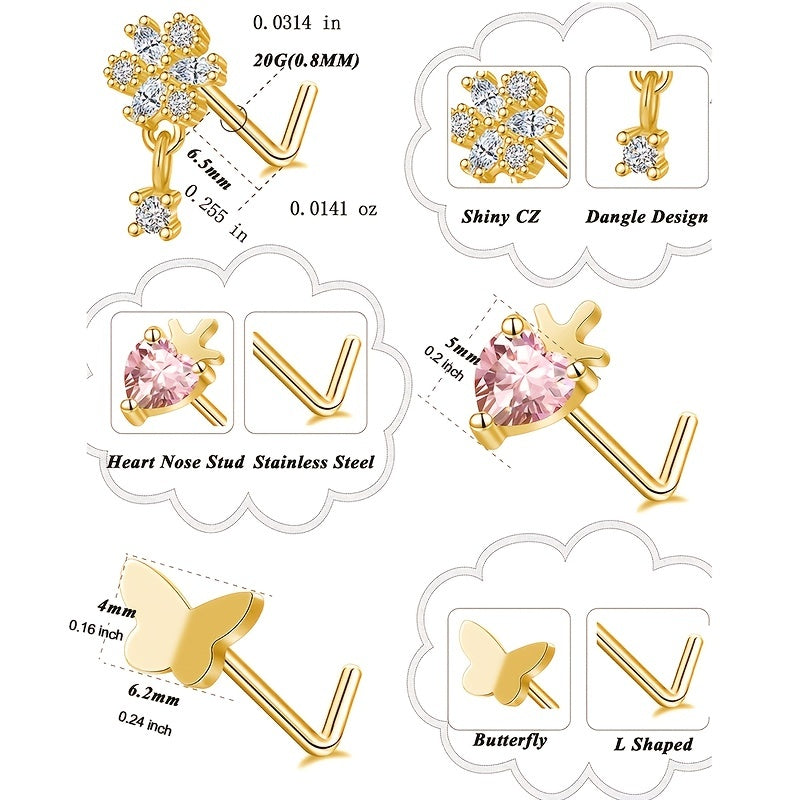 Elevate your style with these trendy nose rings studs made of stainless steel with 18K plating. Featuring CZ heart, moon, and butterfly designs, this set is perfect for adding a touch of edginess to your look.