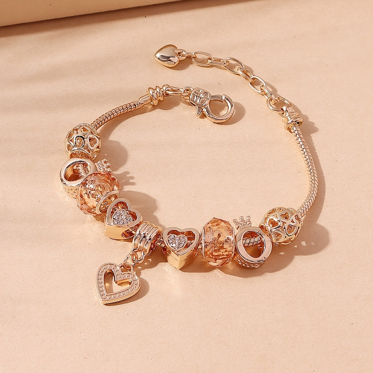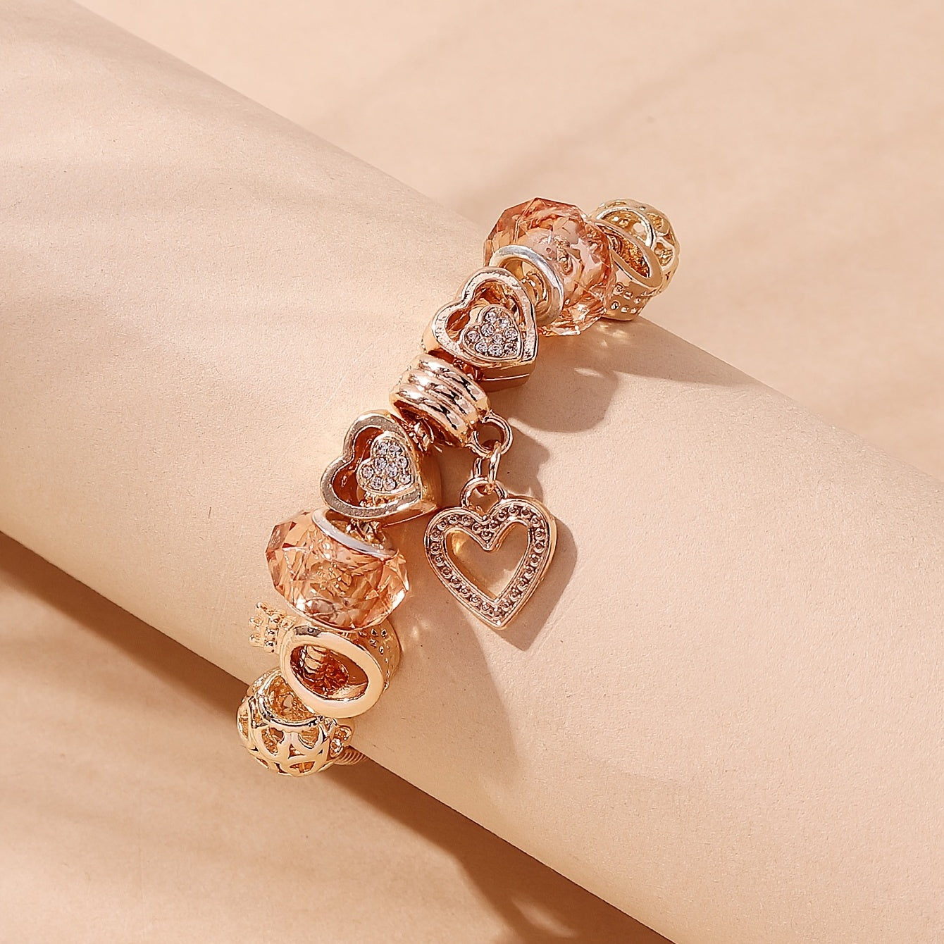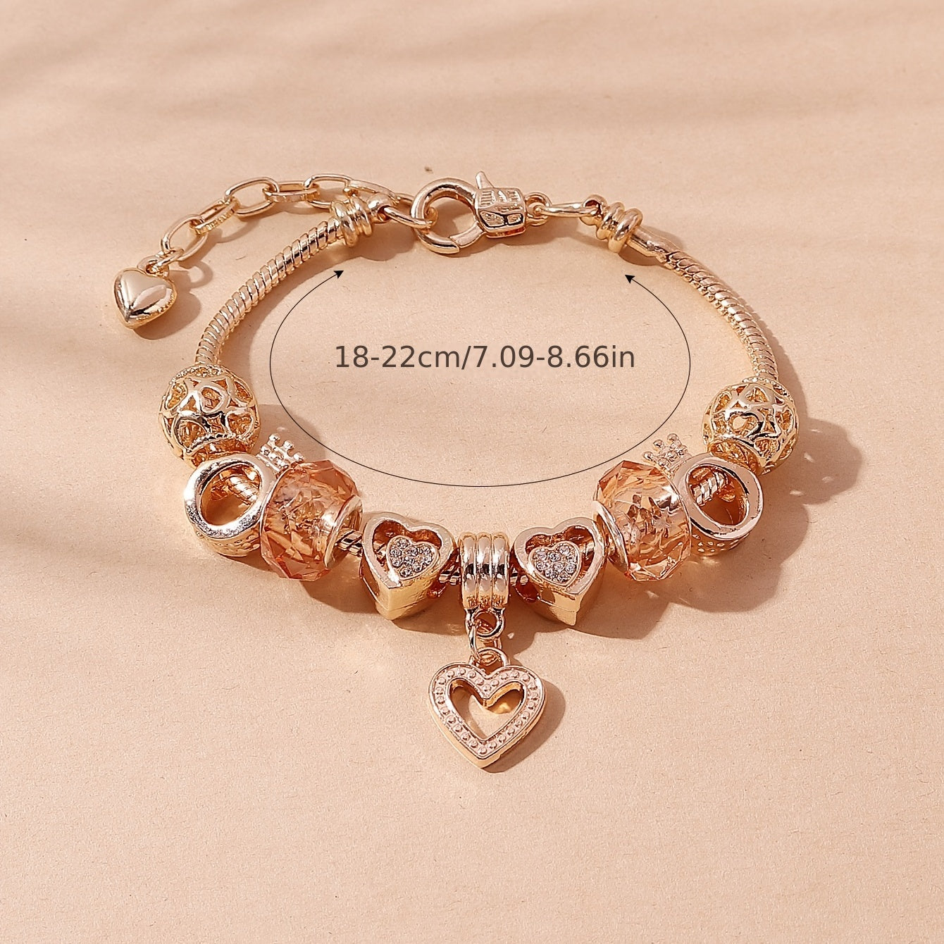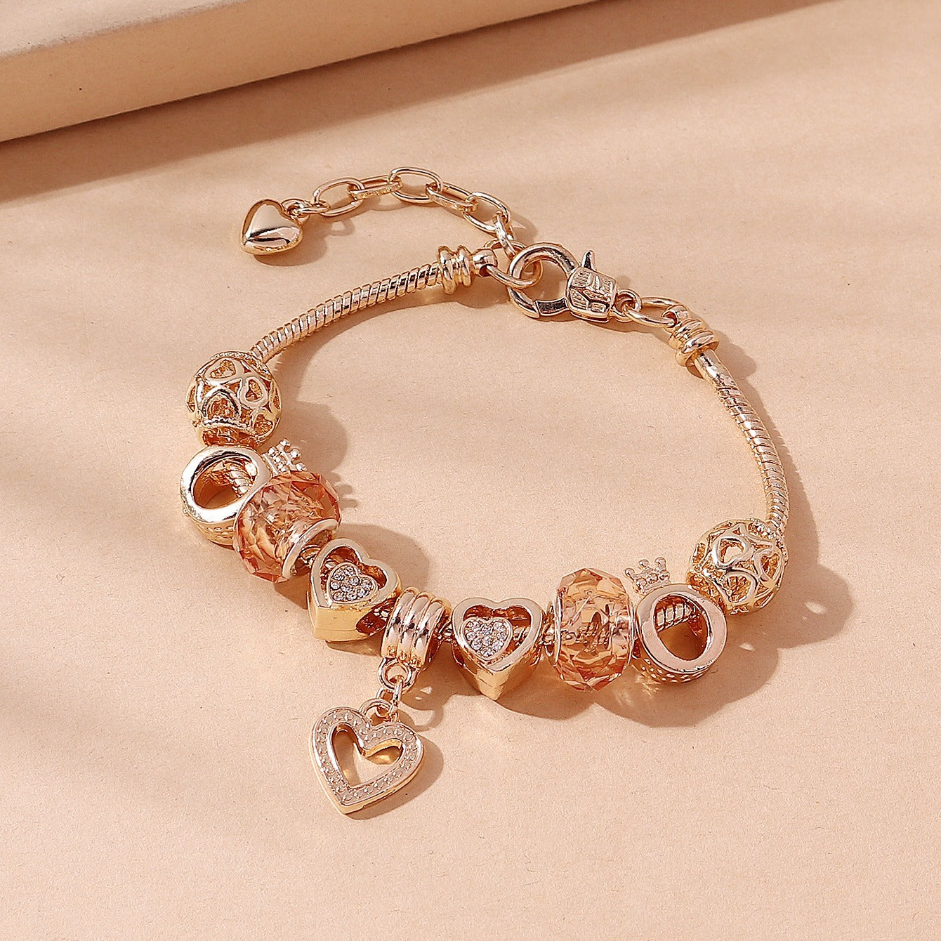 This charming bracelet features a hollow heart shape pendant with mixed heart shape beads and crystals on a snake chain. It's a delightful accessory for women and girls.