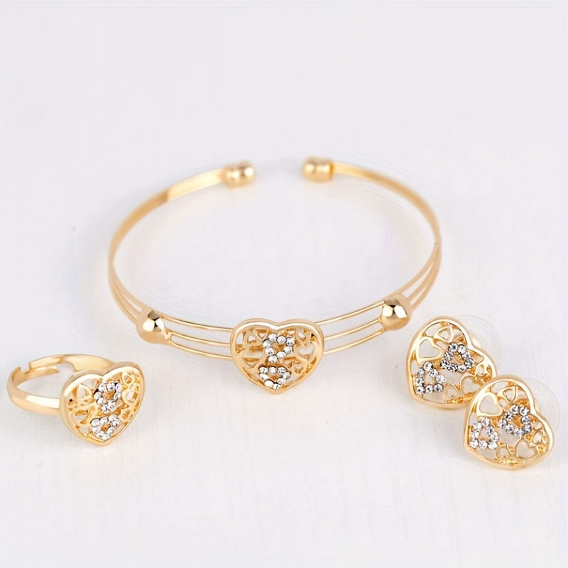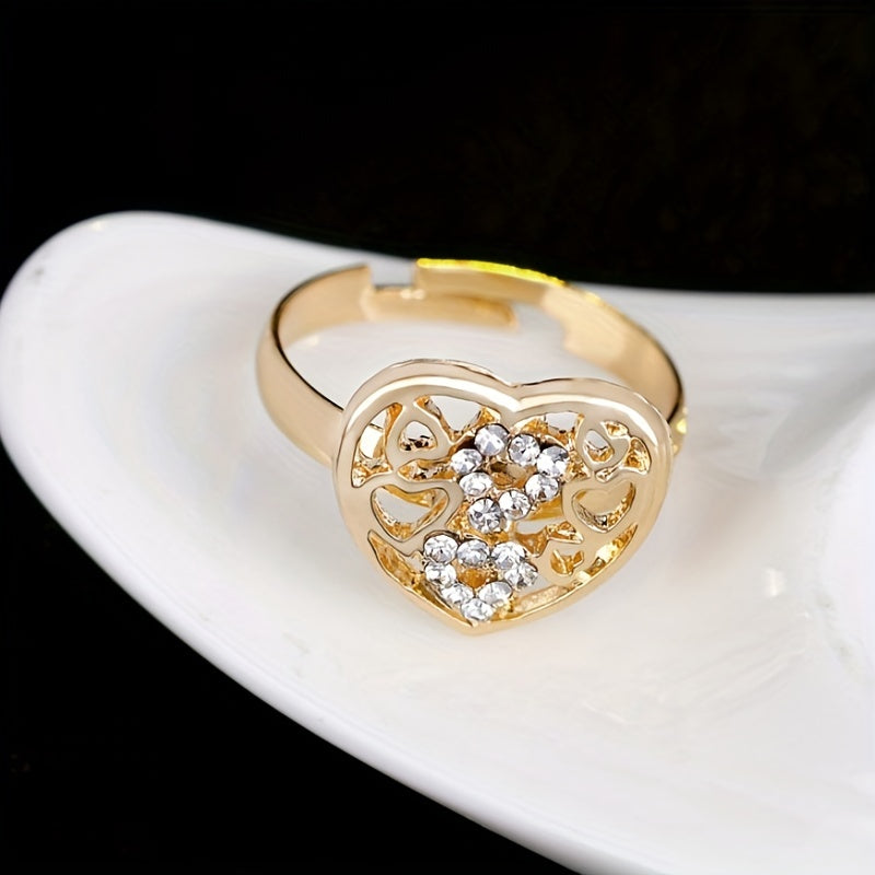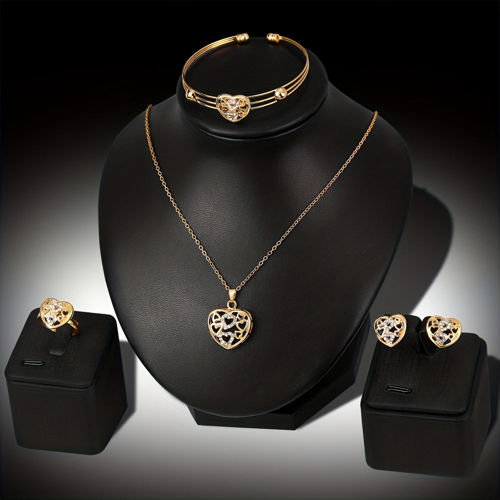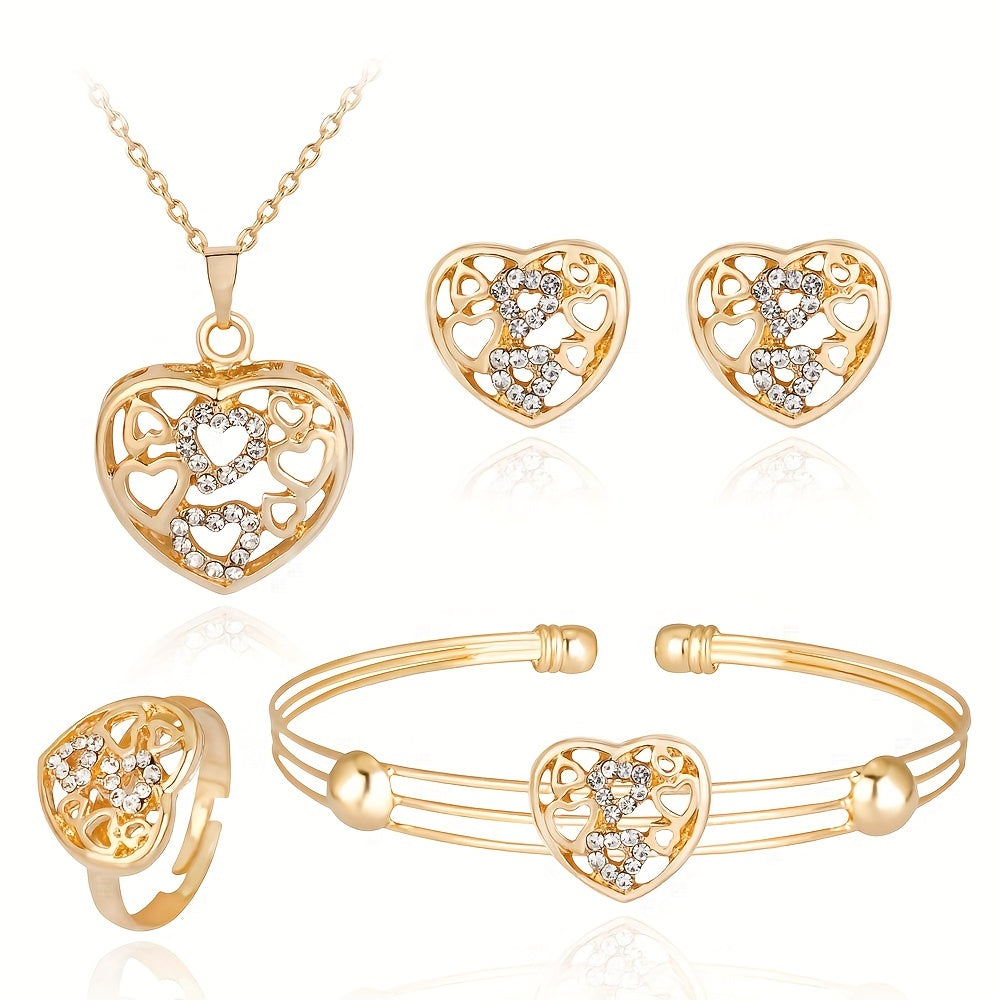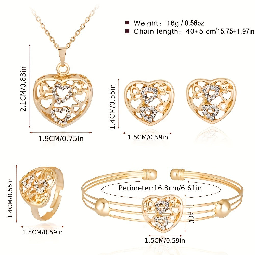 Complete your daily outfits with this stunning 5-piece jewelry set featuring earrings, necklace, bracelet, and ring. Hollow heart design with inlaid rhinestones. Perfect Christmas gift for girls.