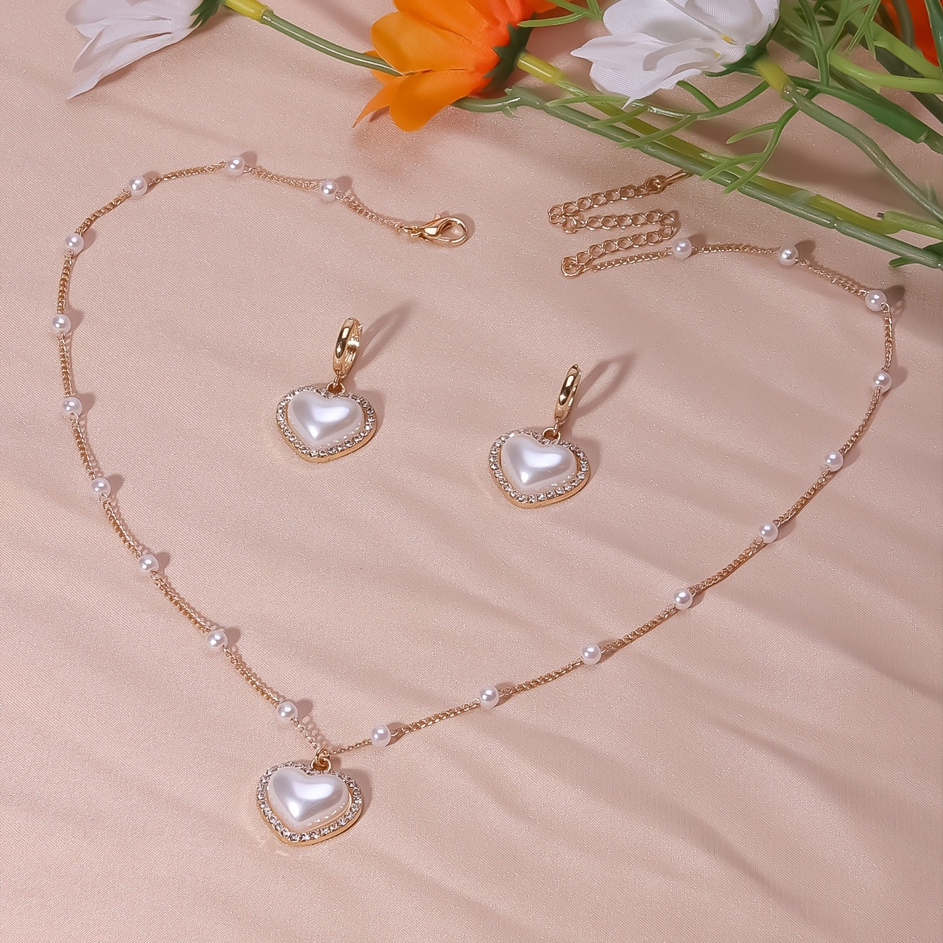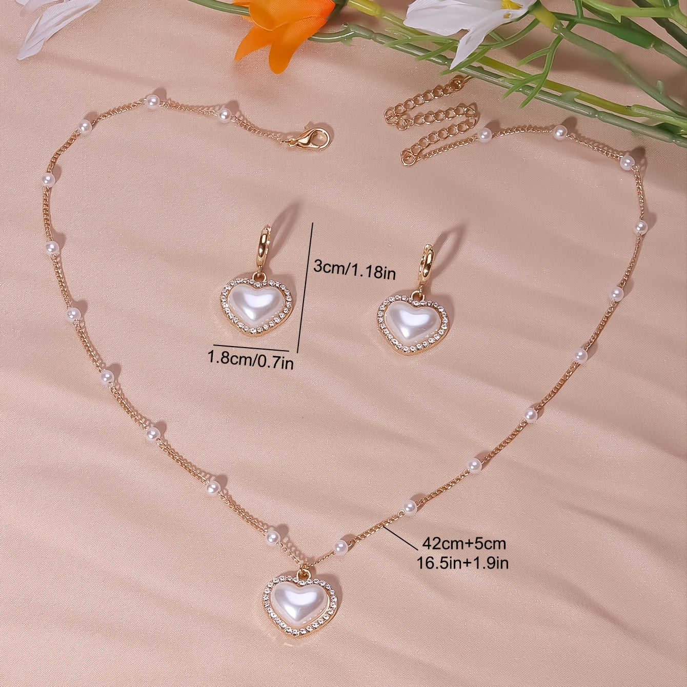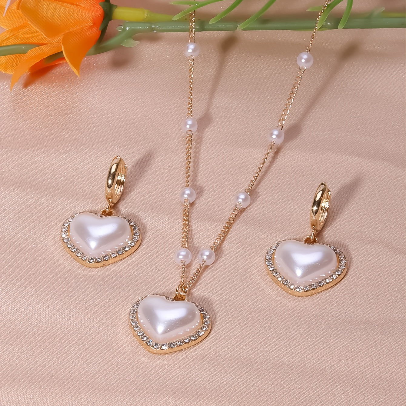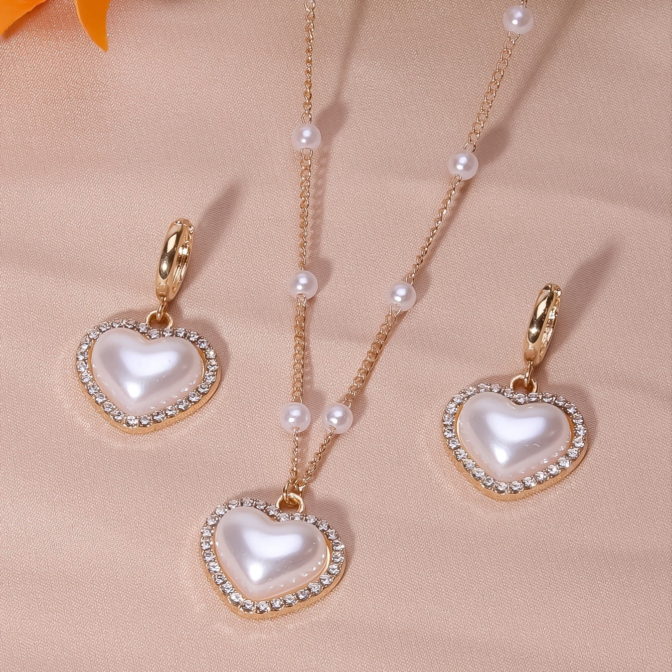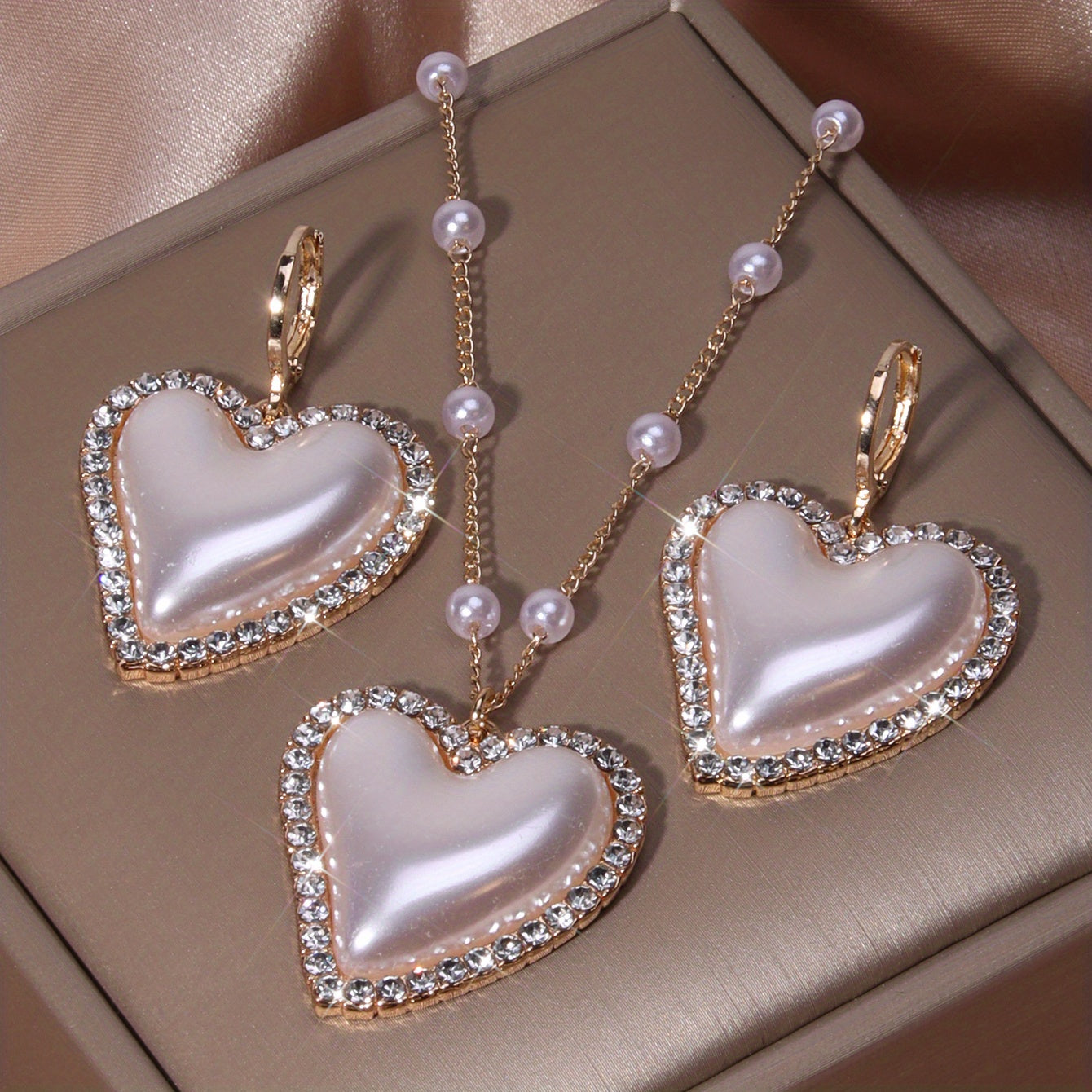 This elegant jewelry set includes a heart shape pendant necklace and drop earrings, featuring faux pearls and inlaid rhinestones. Perfect for adding a touch of glamour to any outfit.