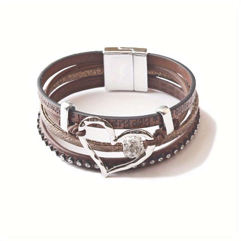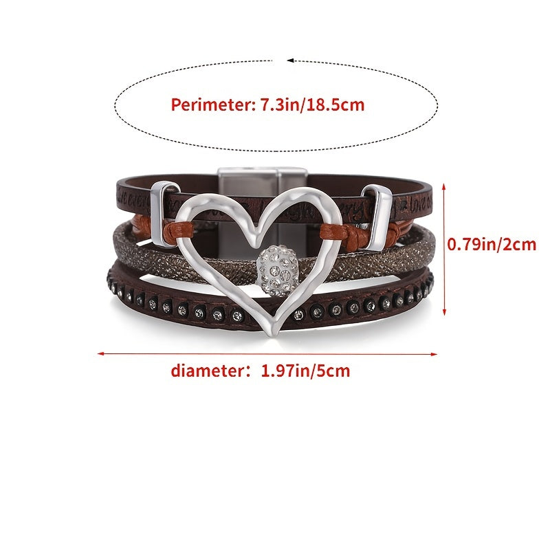 Add a touch of vintage charm to your look with this multilayer wrap bracelet. Made of PU leather with hollow heart shape design and magnetic buckle closure.