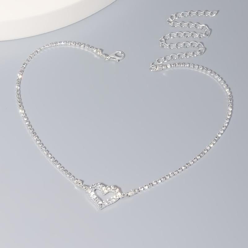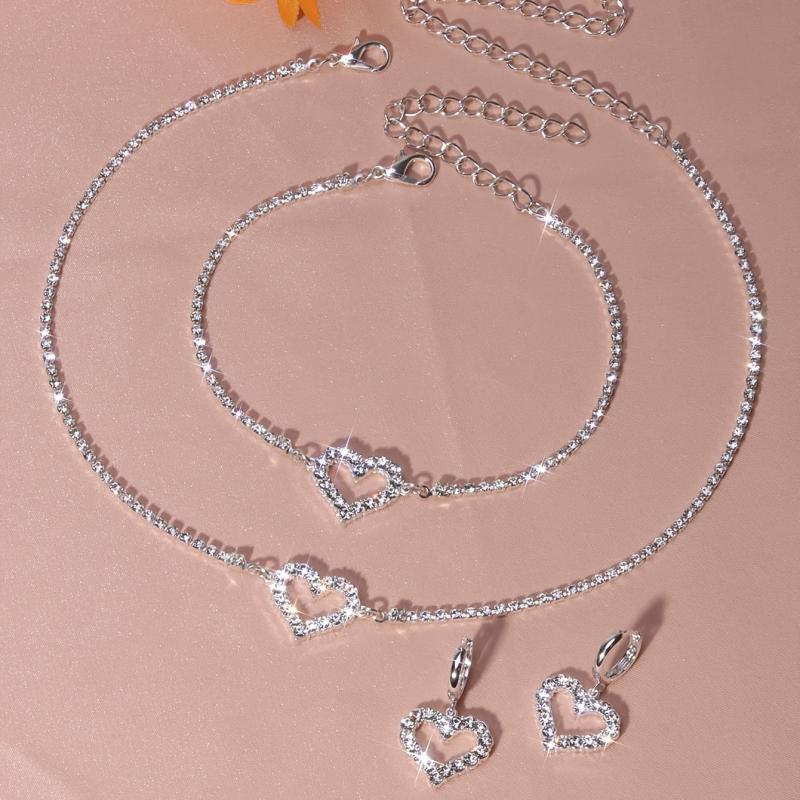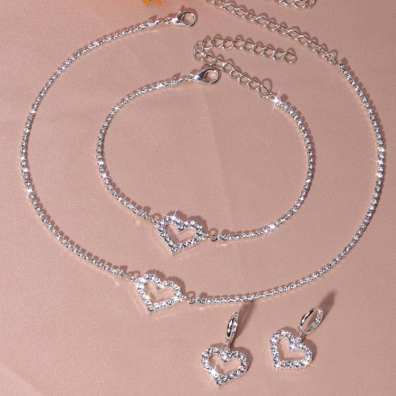 Elevate your style with this exquisite jewelry set featuring a heart-shaped design adorned with rhinestones. The set includes a choker necklace, chain bracelet, and dangle earrings, perfect for adding a touch of elegance to any outfit.