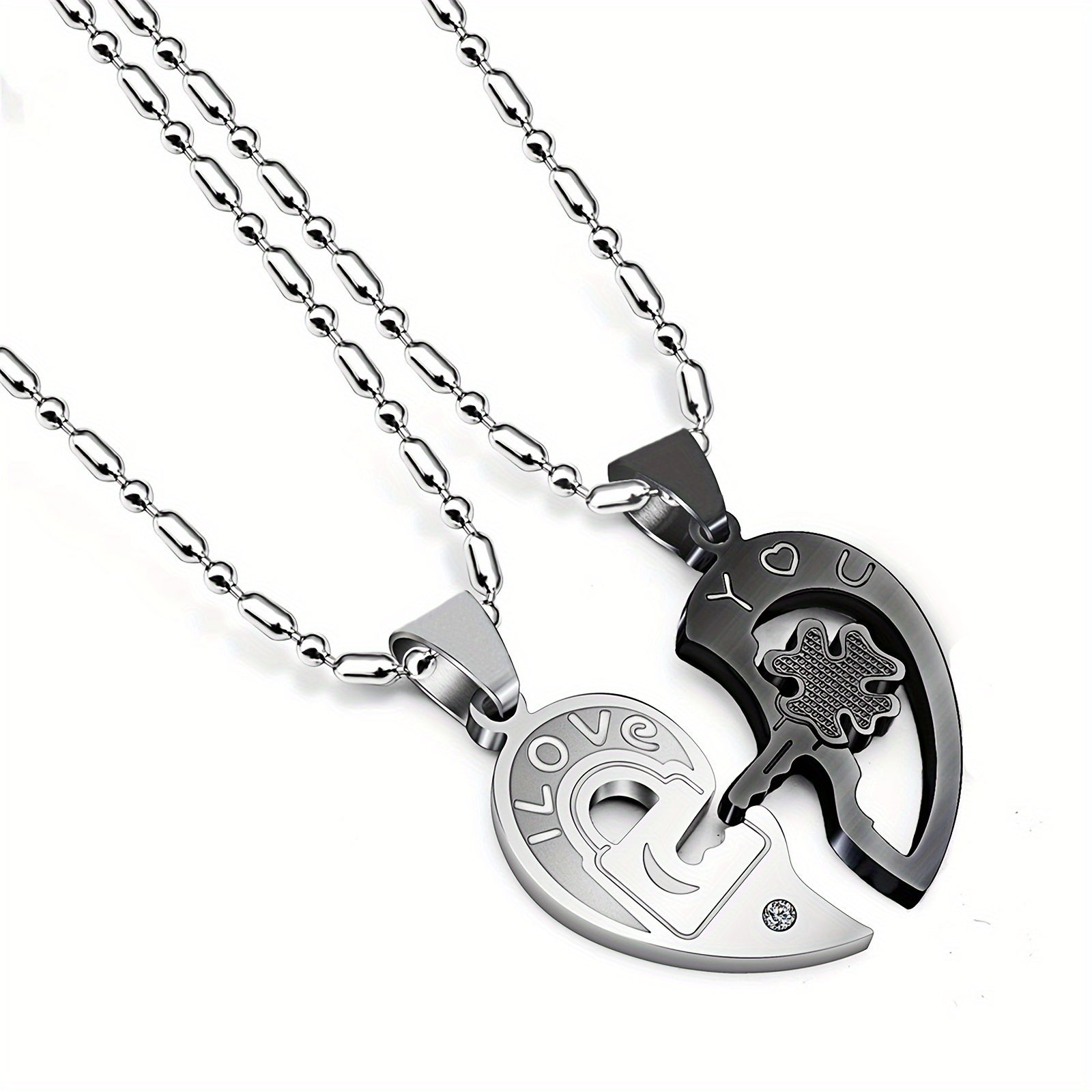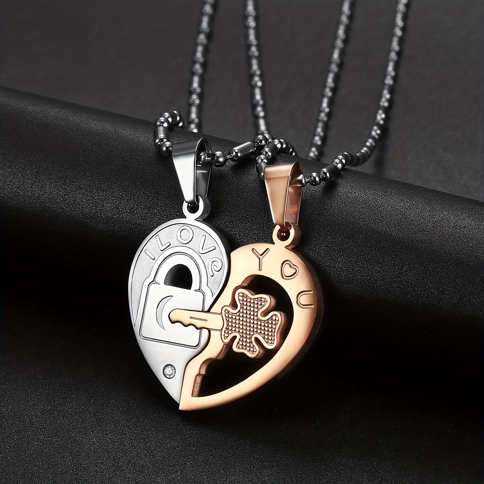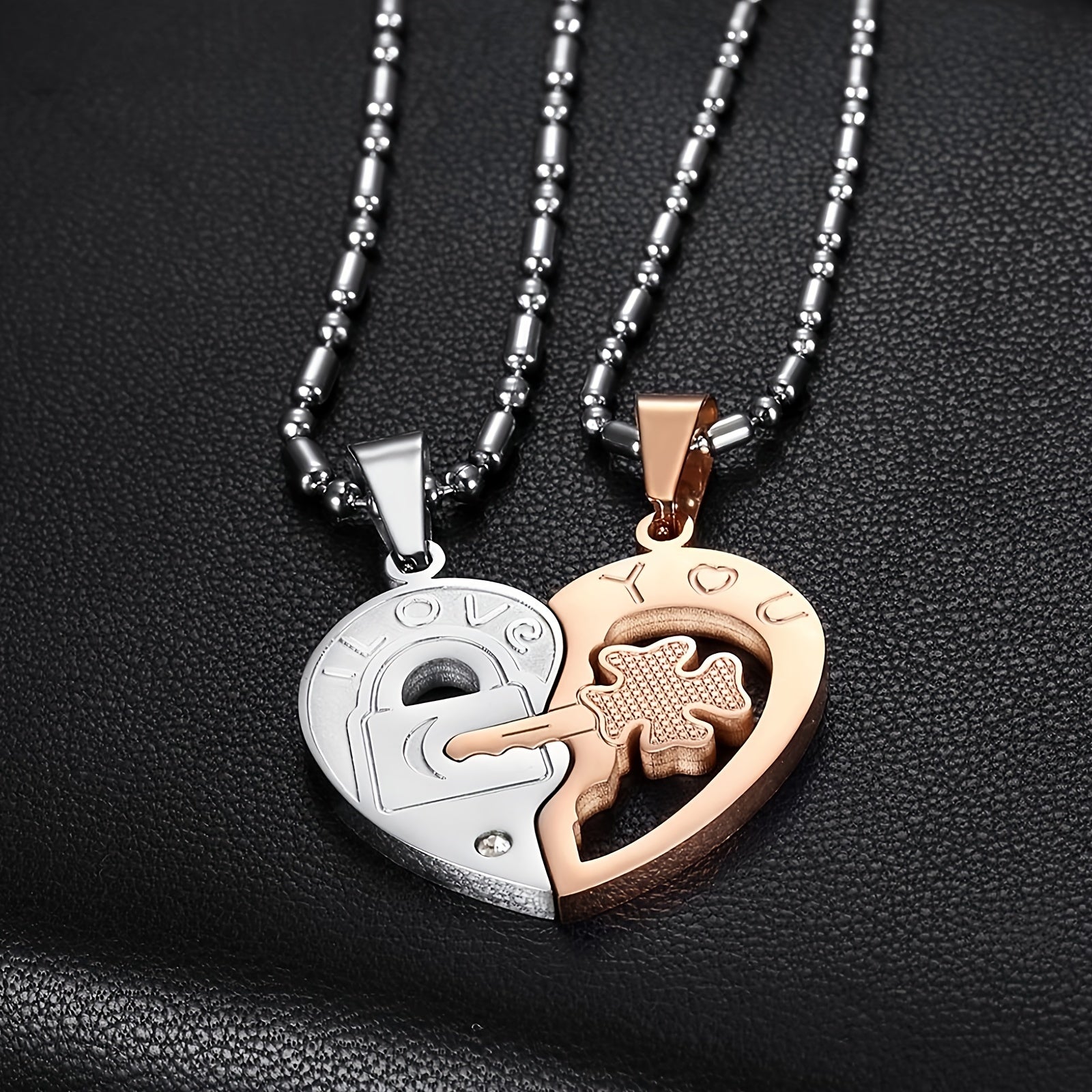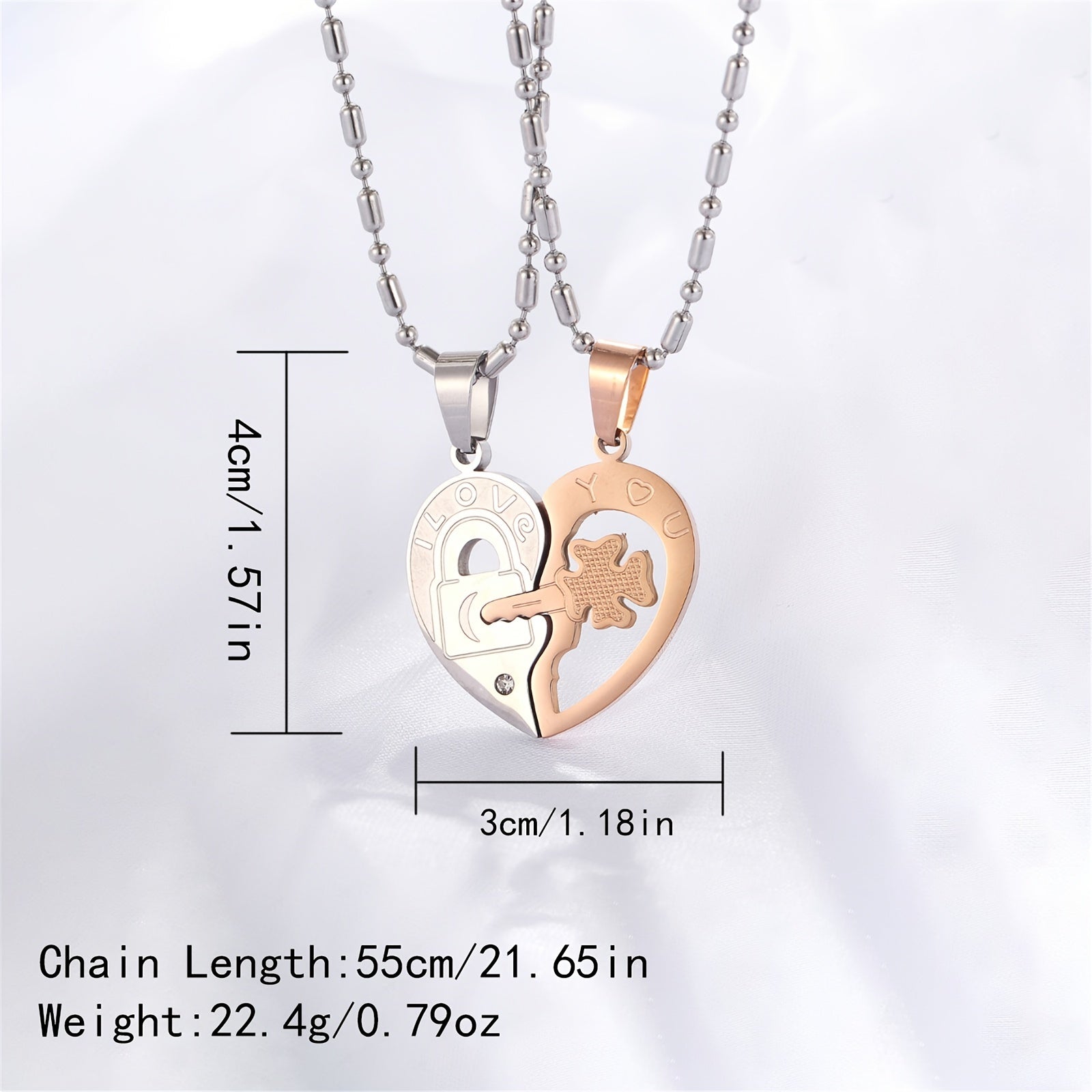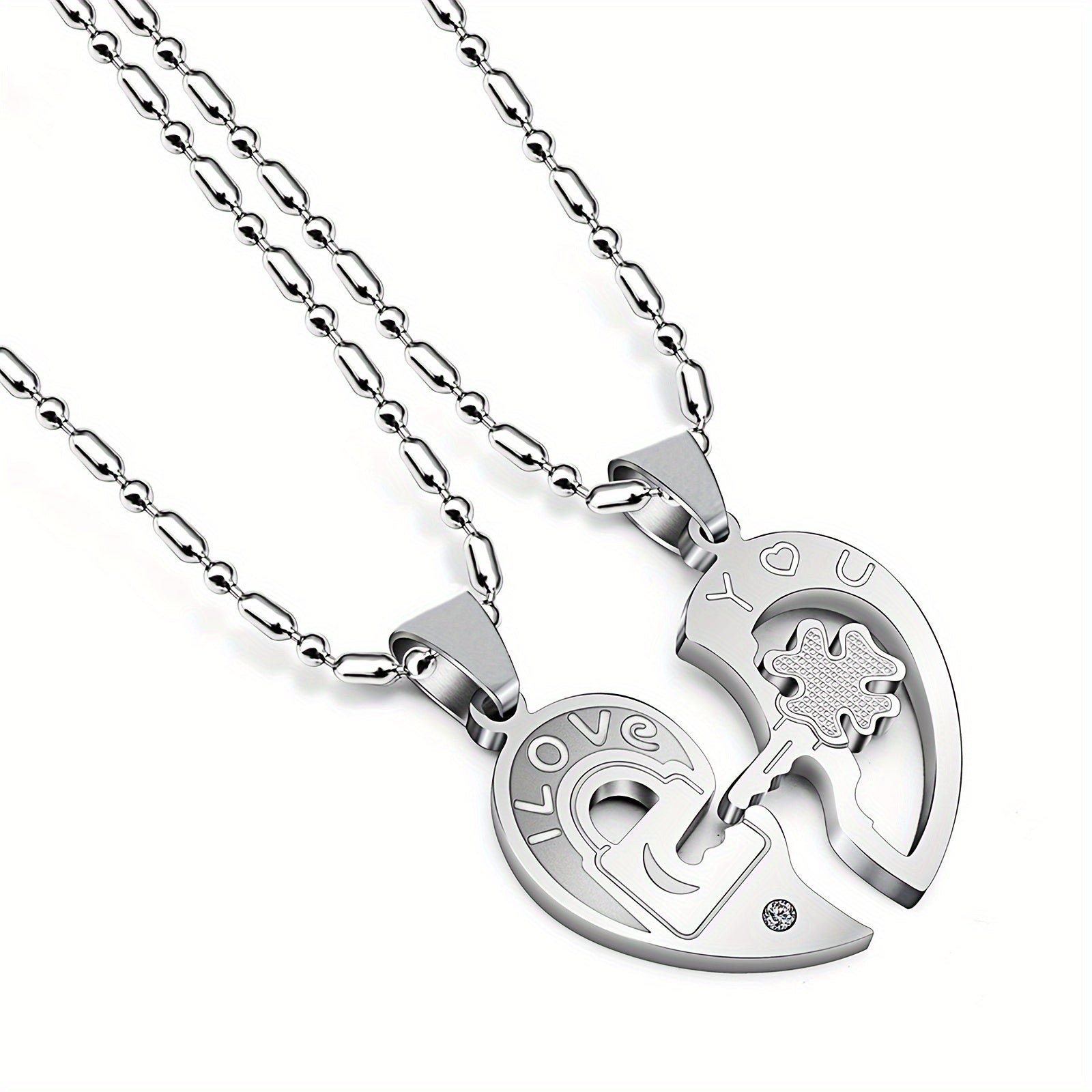This stainless steel pendant necklace features a heart shaped key design with zircon accents, making it a perfect gift for couples.