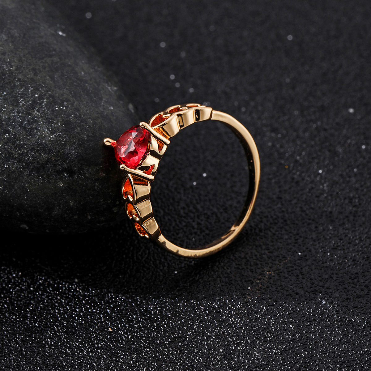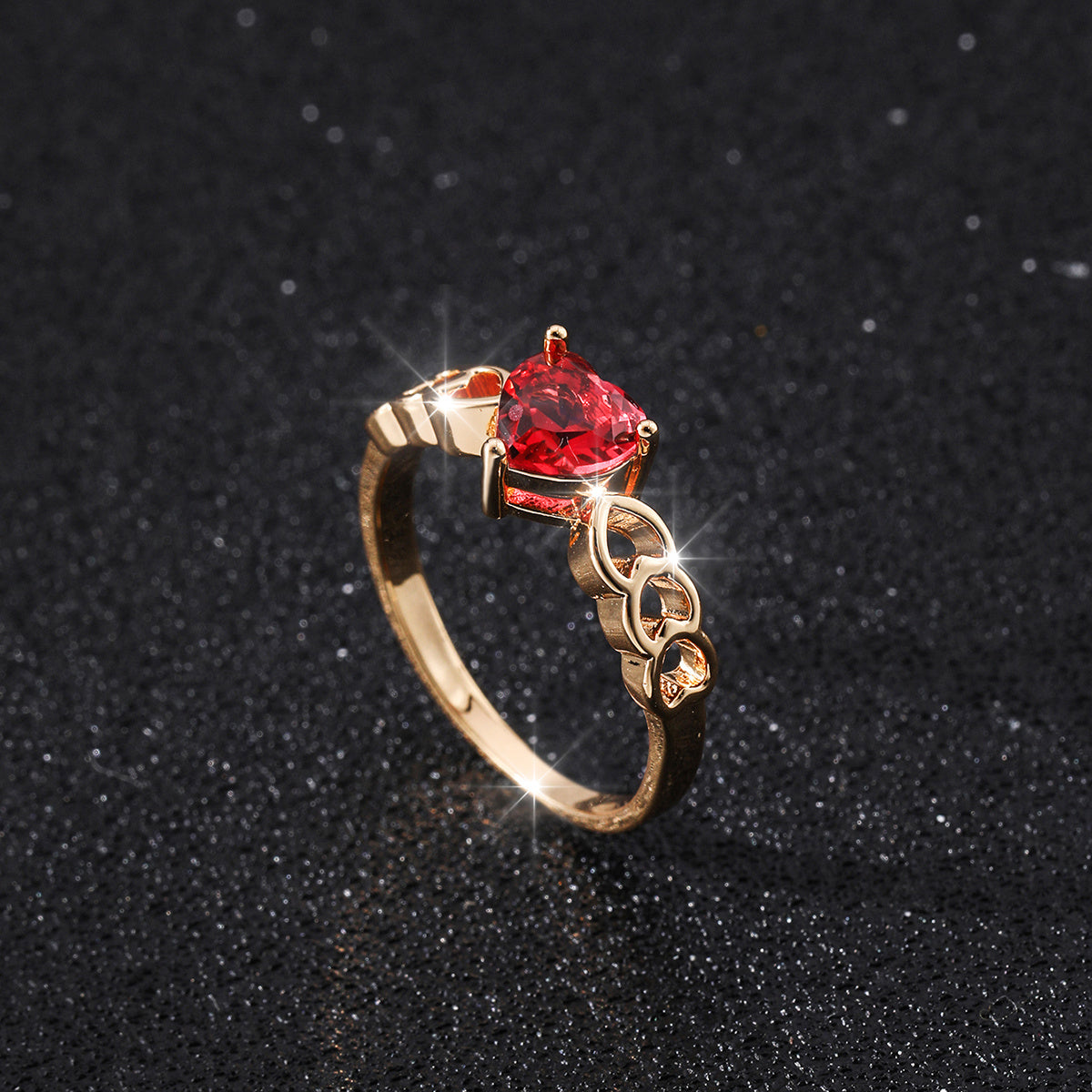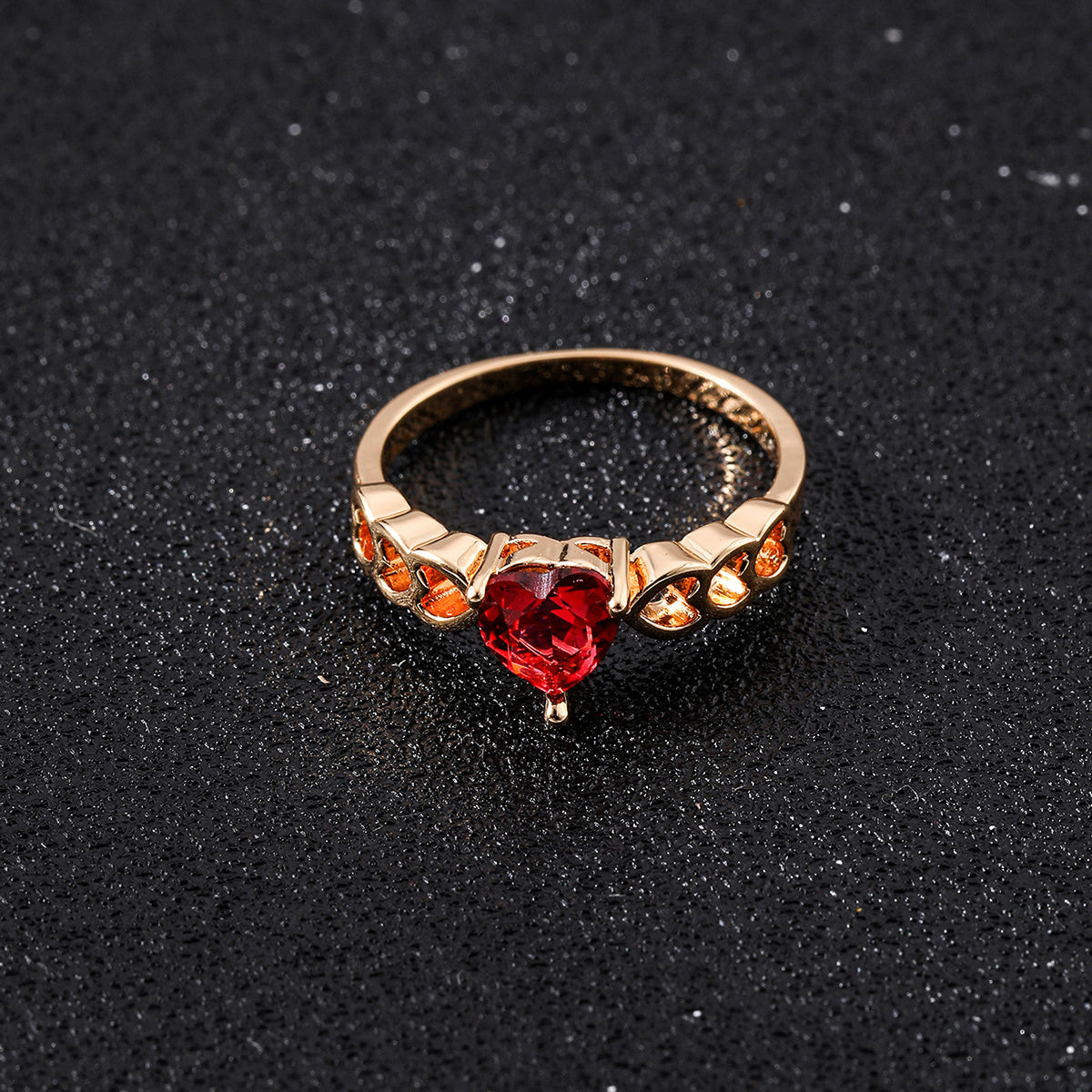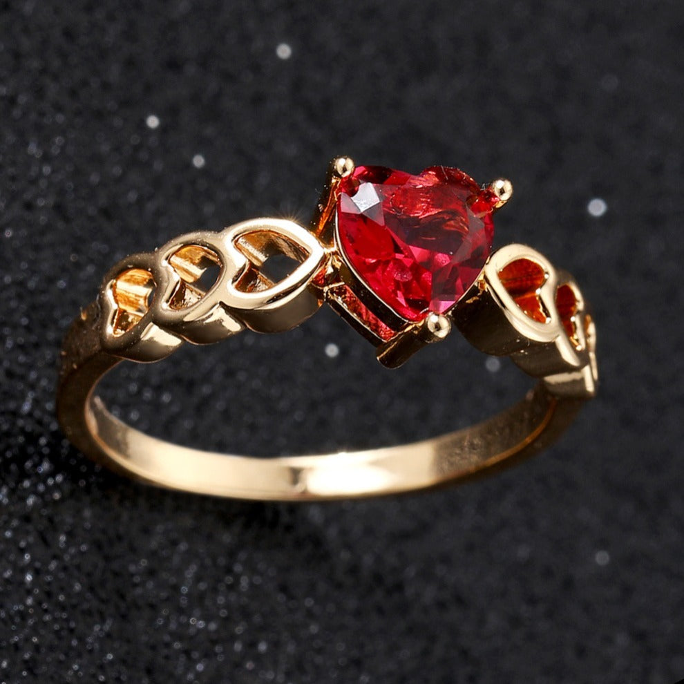 Add a touch of romance to your special day with this stunning heart-shaped wedding ring. Made of high-quality 18K plated material and adorned with a vibrant red faux diamond, this ring is sure to make a statement.