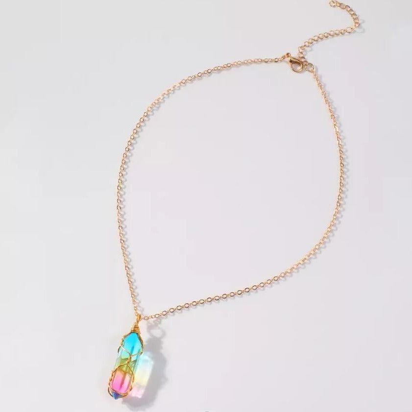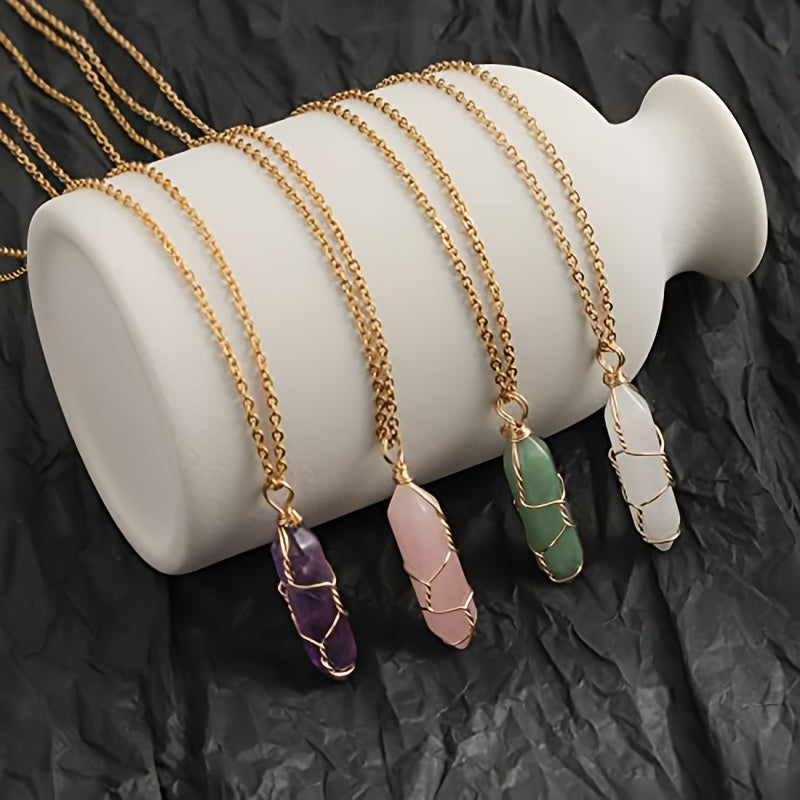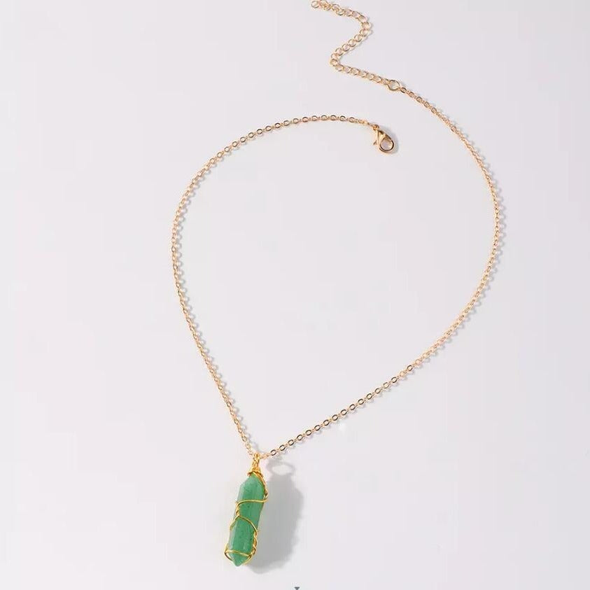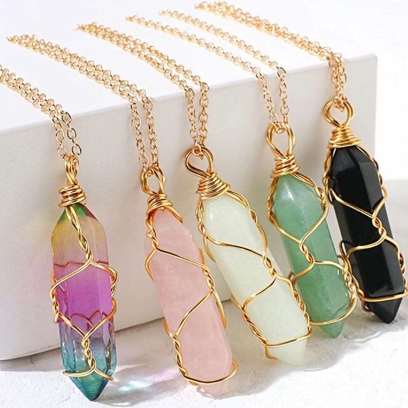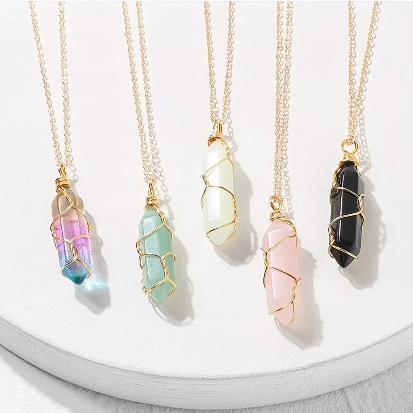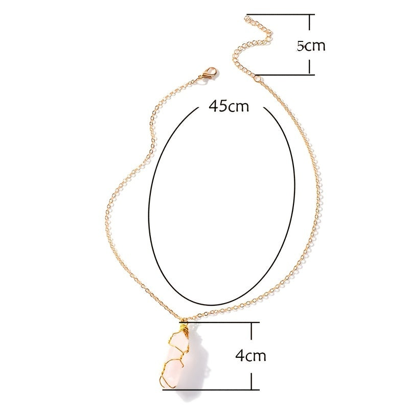 This hexagon pendant necklace features a natural stone crystal that brings positive energy and luck. It is a stylish accessory that complements any outfit.