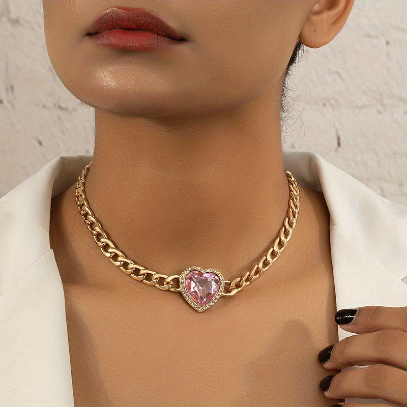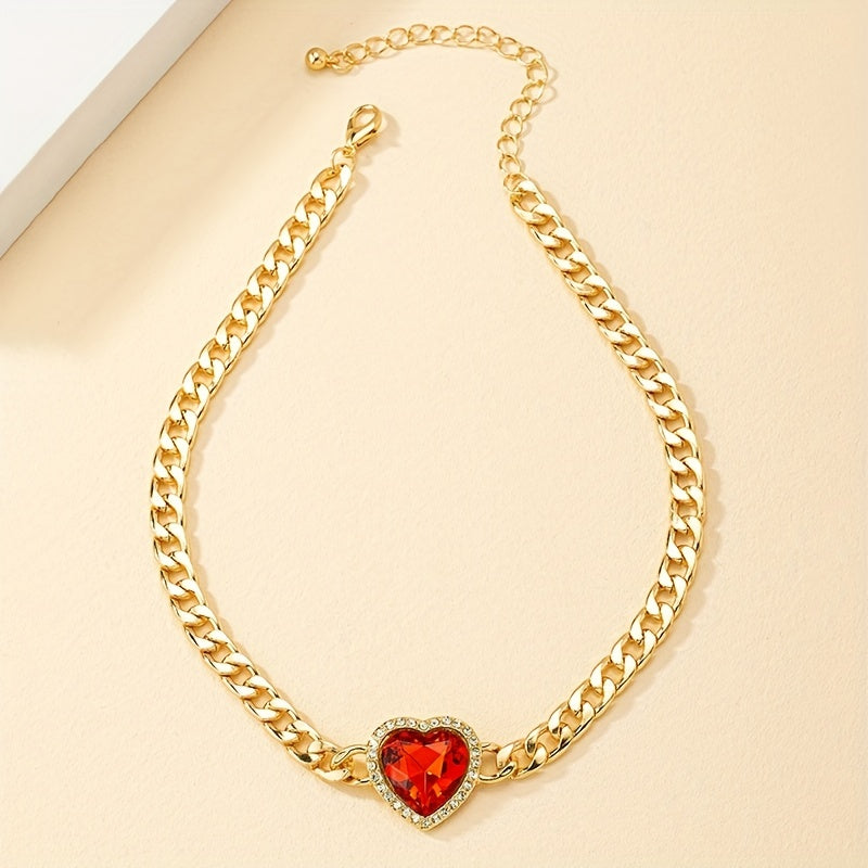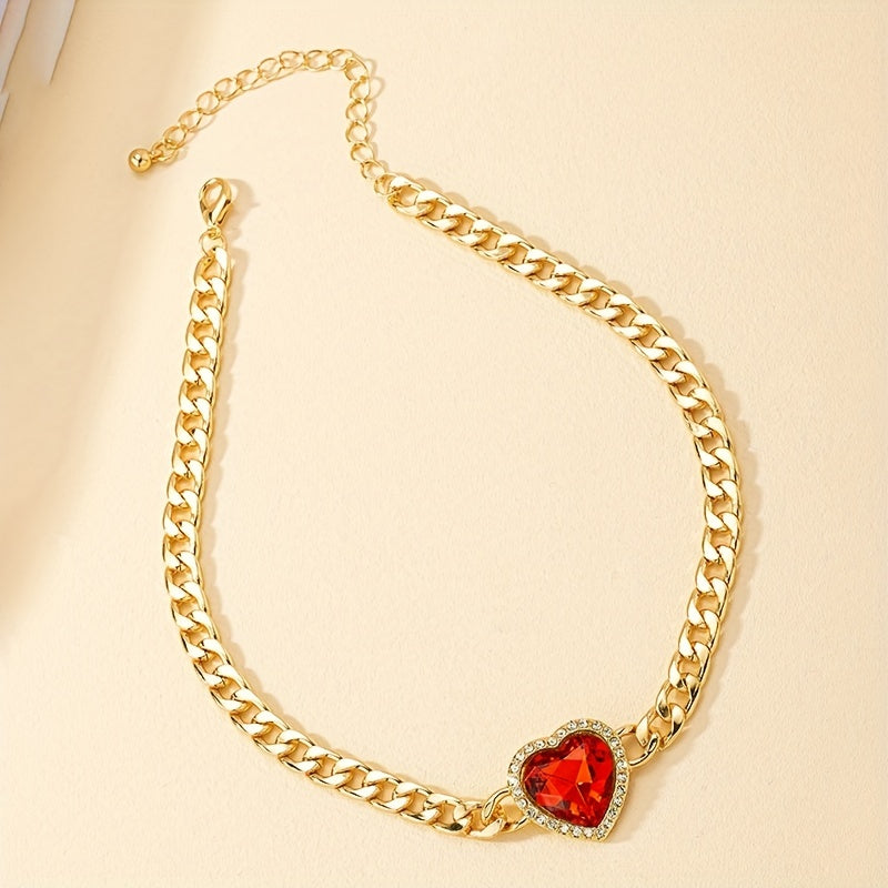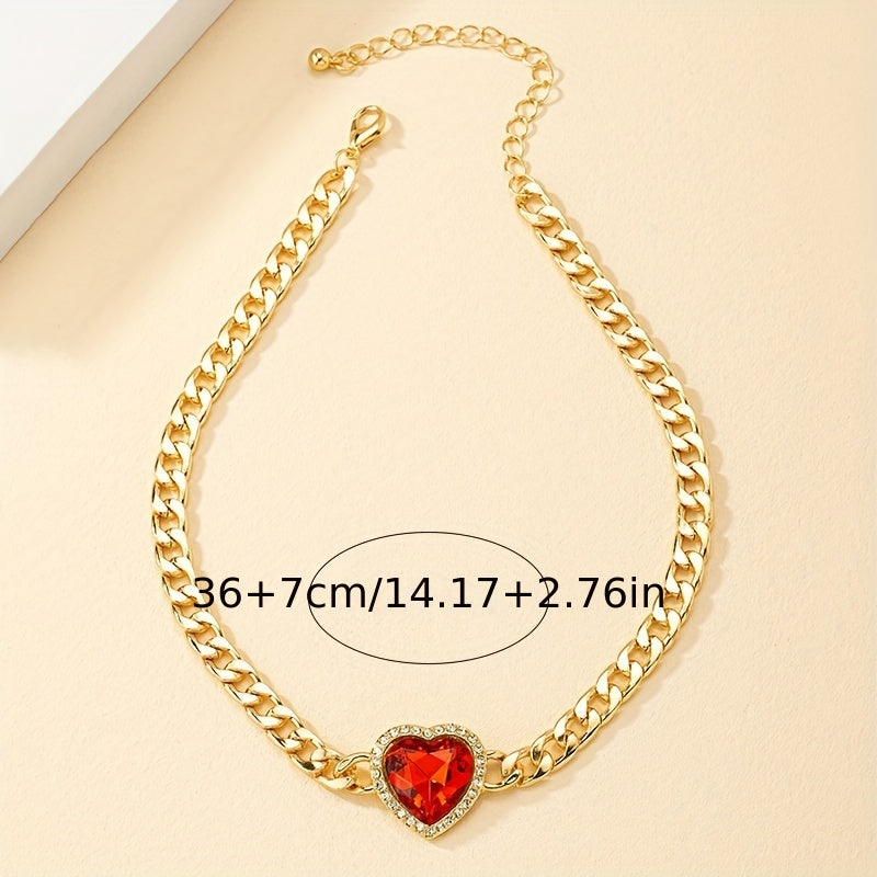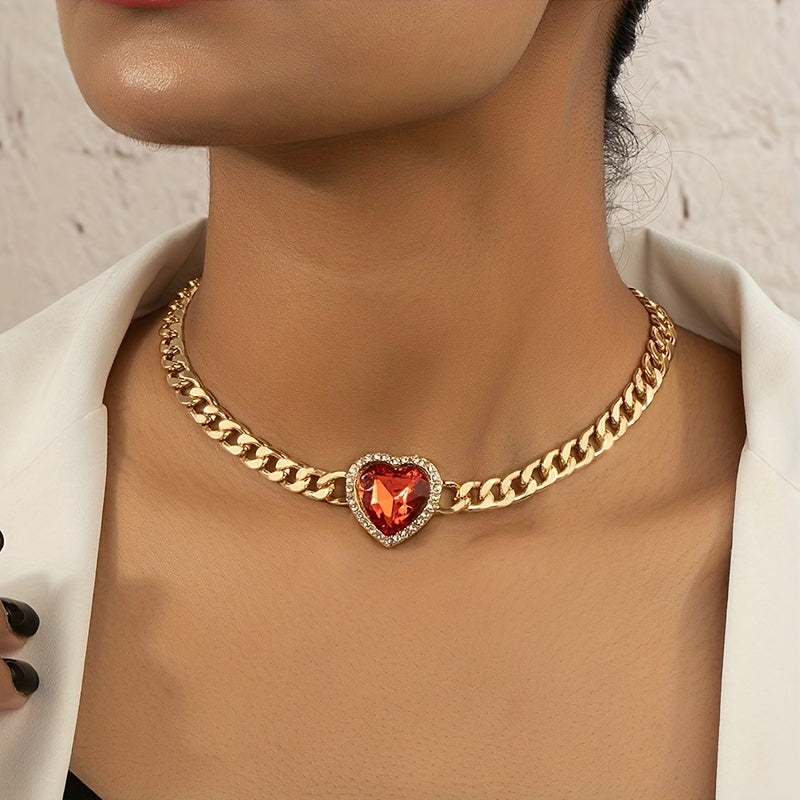 Make a bold statement with this chunky Cuban chain necklace featuring a red heart faux gemstone choker. Perfect for adding a touch of glam to your outfit.