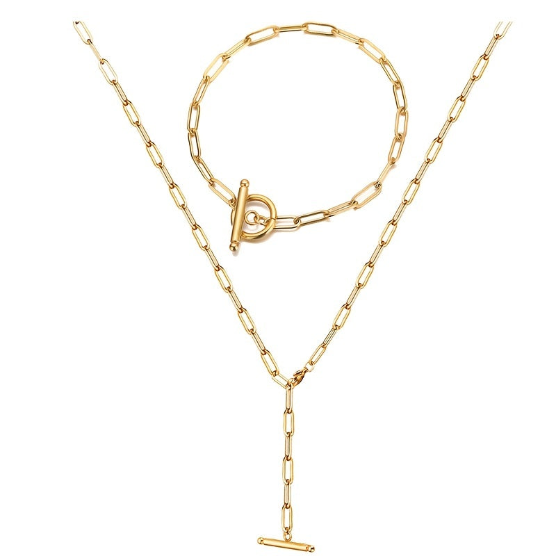 Elevate your style with this trendy Hip Hop style jewelry set. Made of 18K plated stainless steel, this set includes a pendant necklace and chain bracelet.