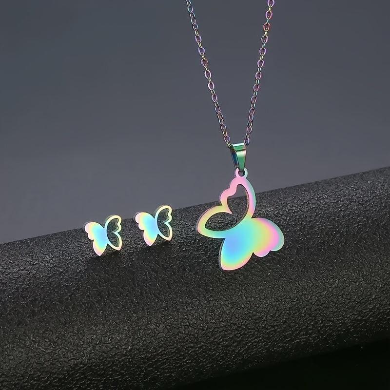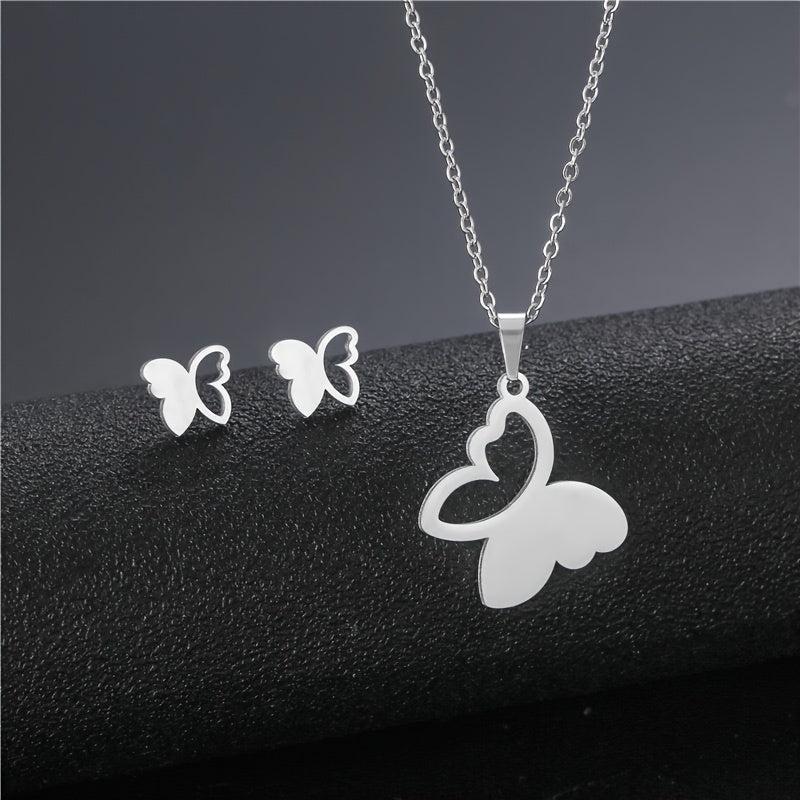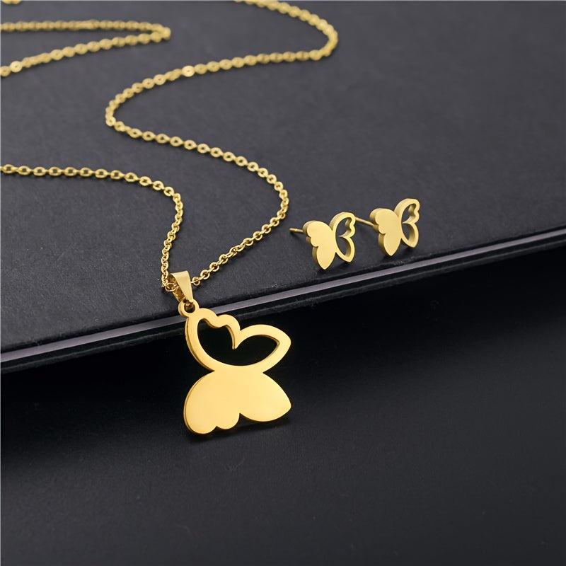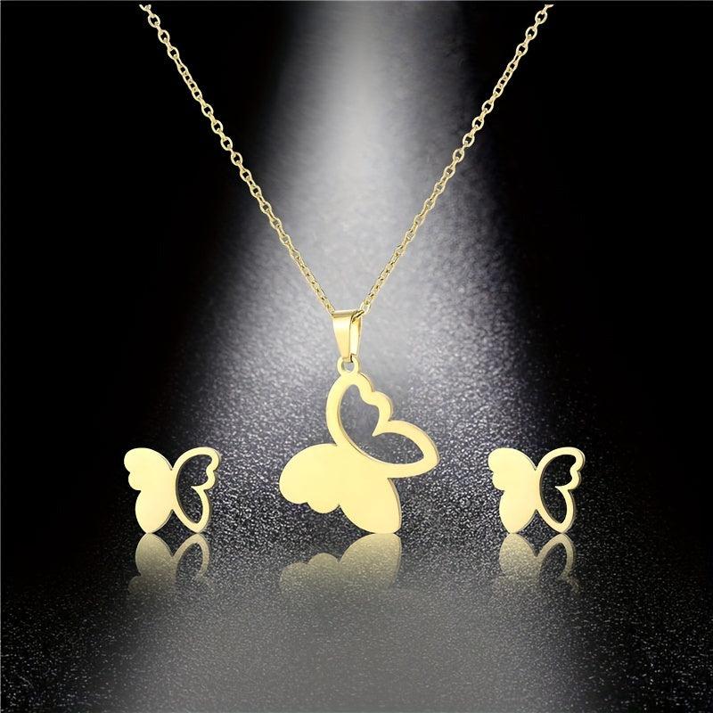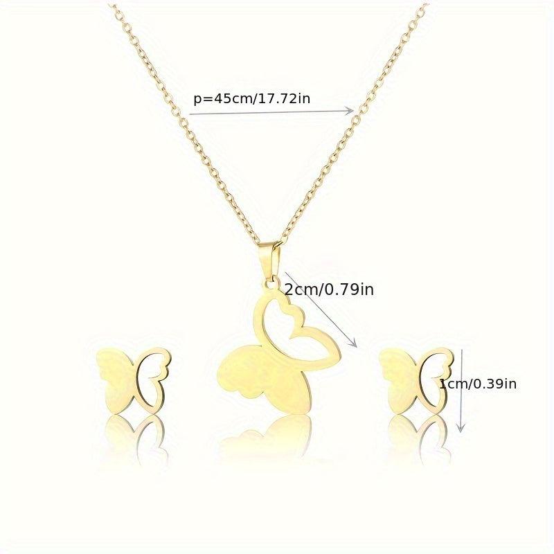 This elegant set includes a necklace and earrings made of high-quality stainless steel with a golden finish, featuring a hollow butterfly design.