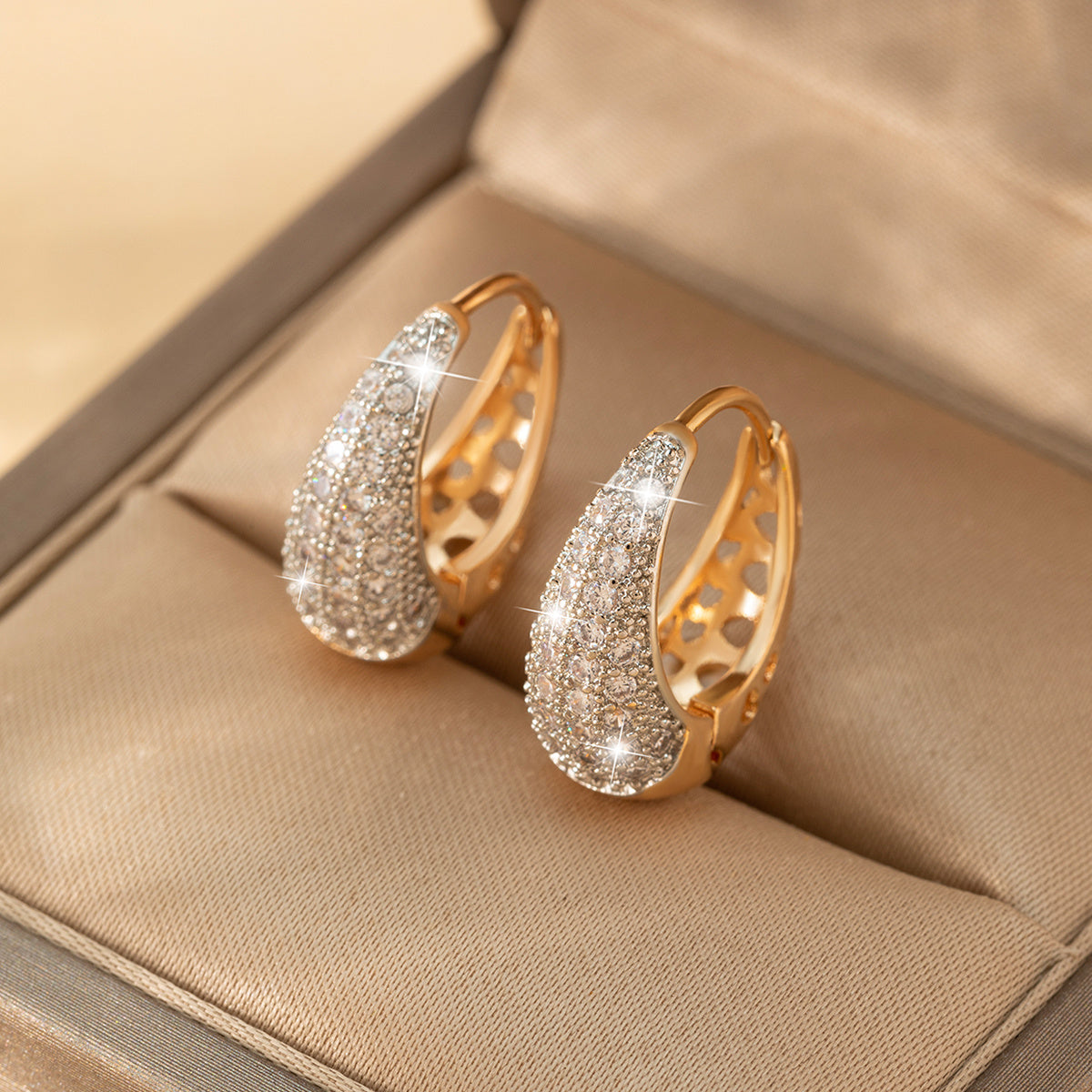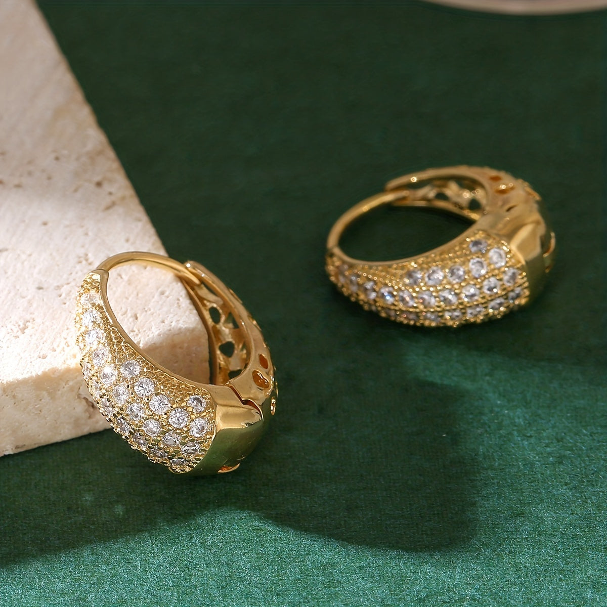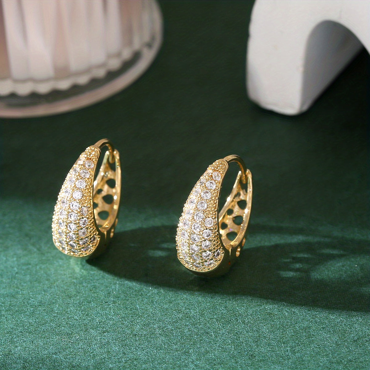 Add a touch of elegance to your outfit with these stunning hollow earrings. The 14K gold plating and zircon inlay give them a luxurious look that sparkles in the light.