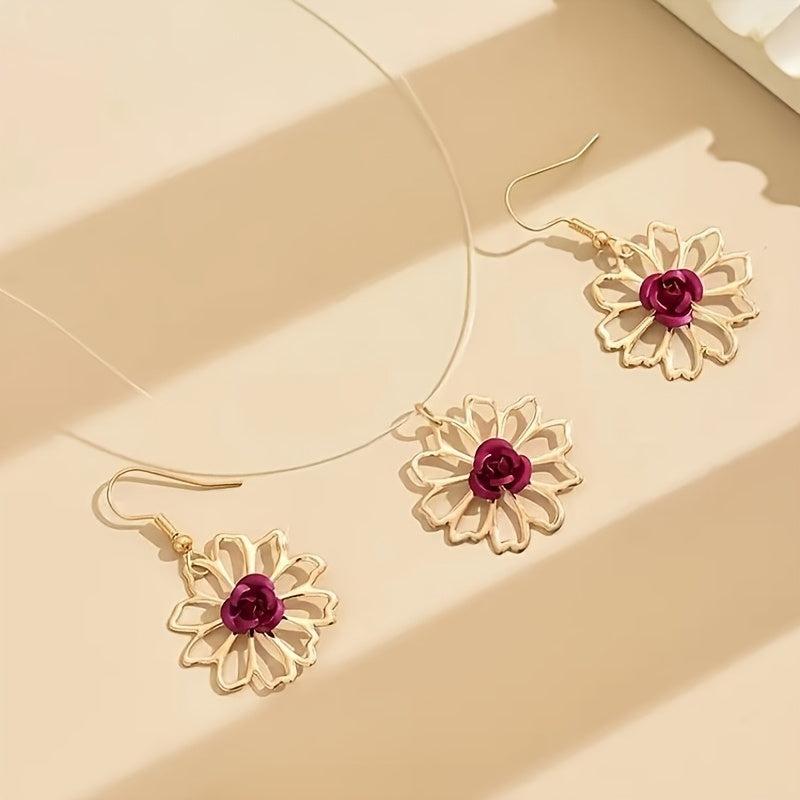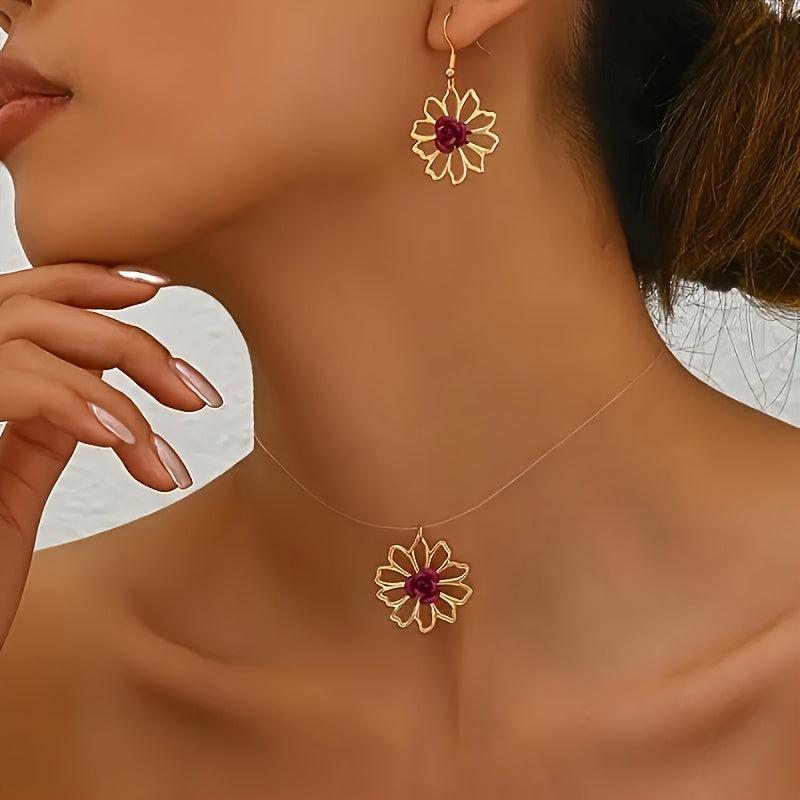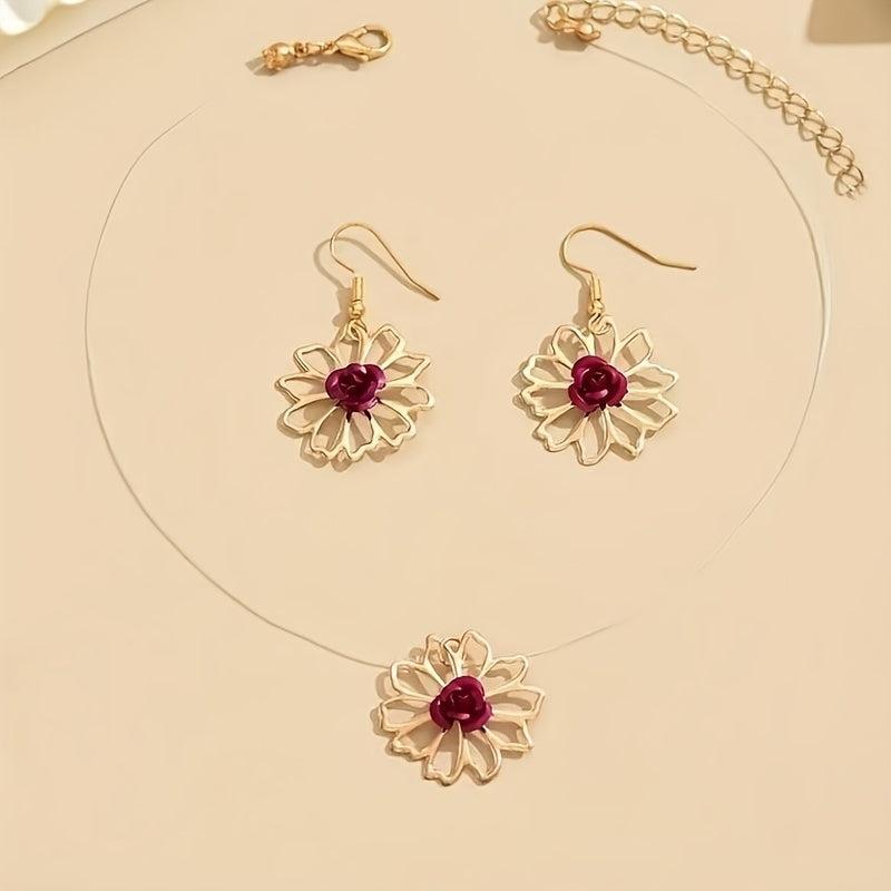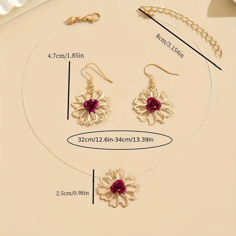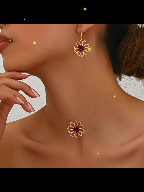 This elegant jewelry set features a hollow floral design with a delicate transparent fishing line necklace and matching earrings. Perfect for parties and special occasions.