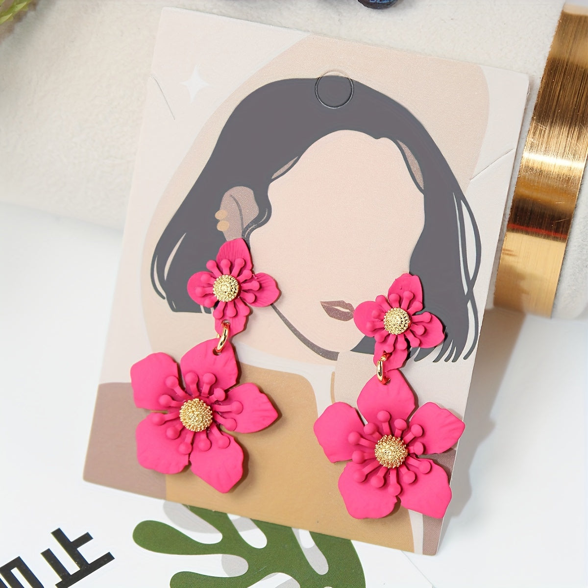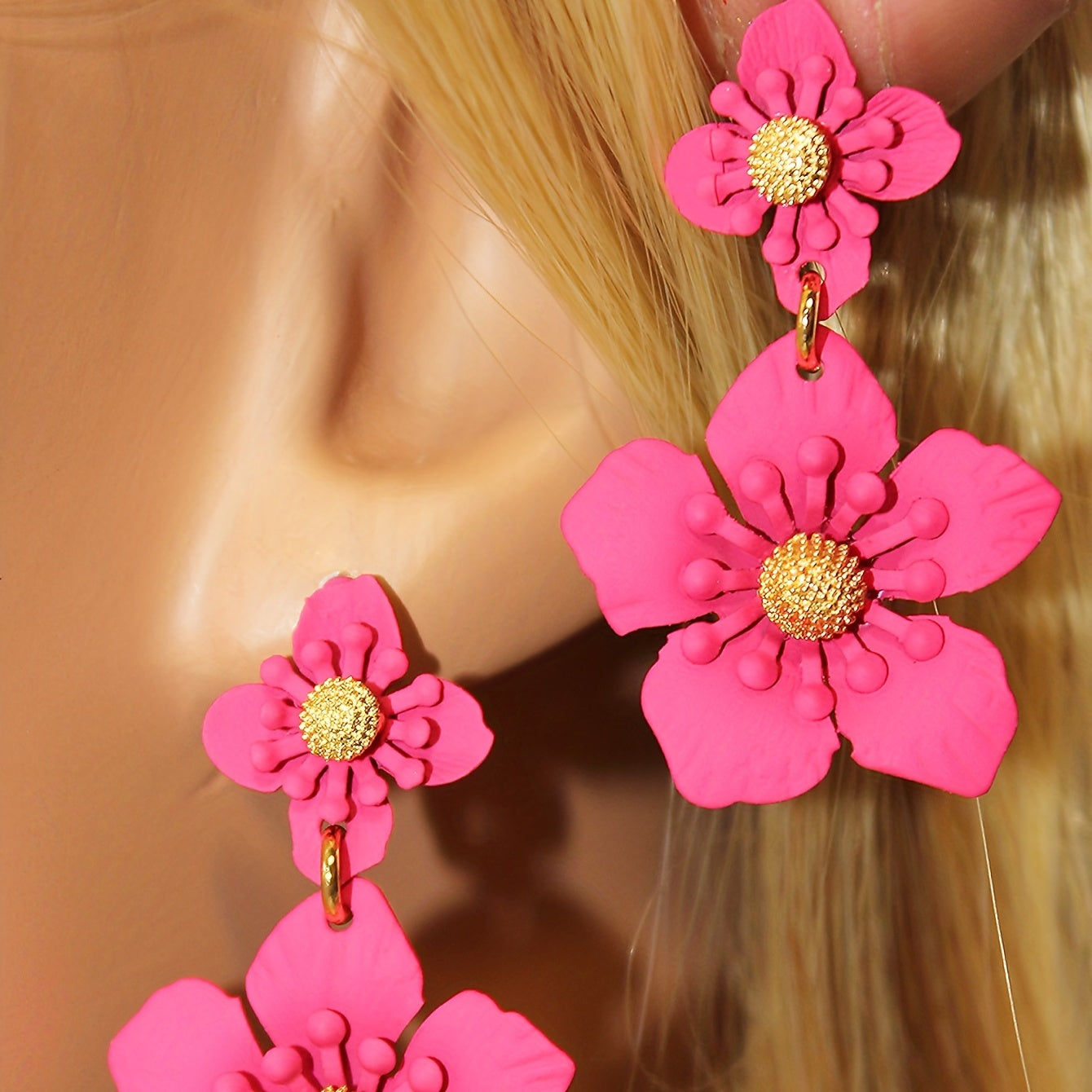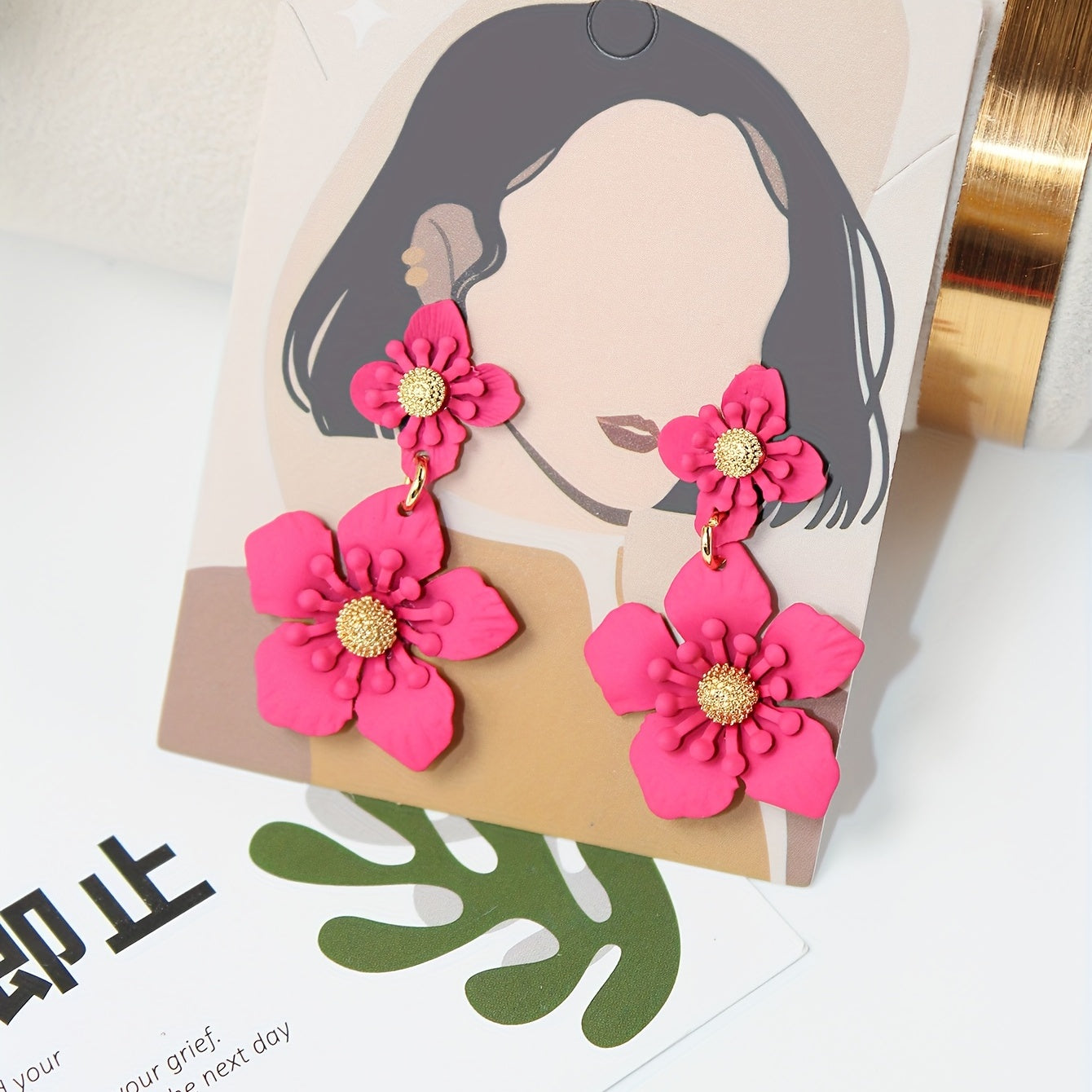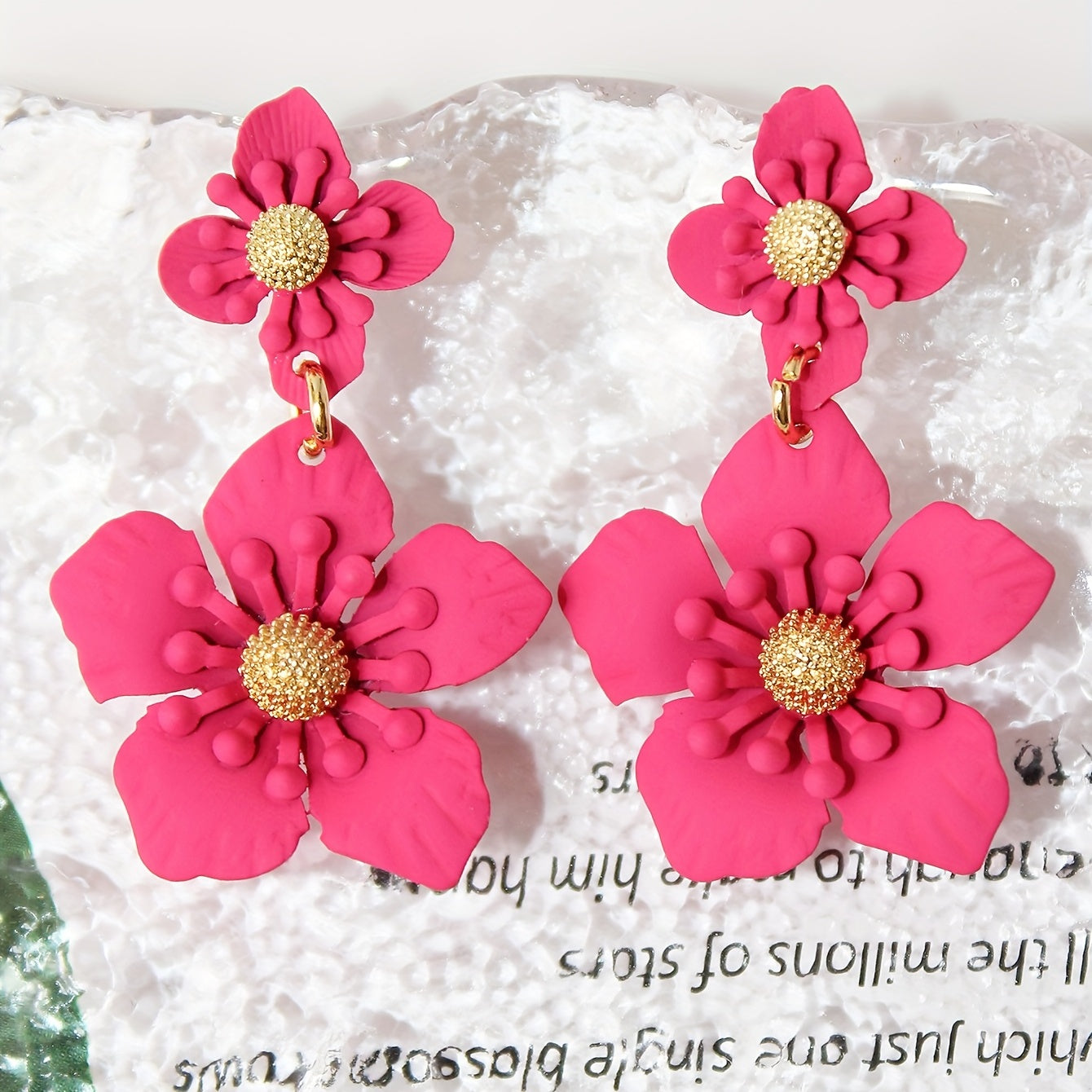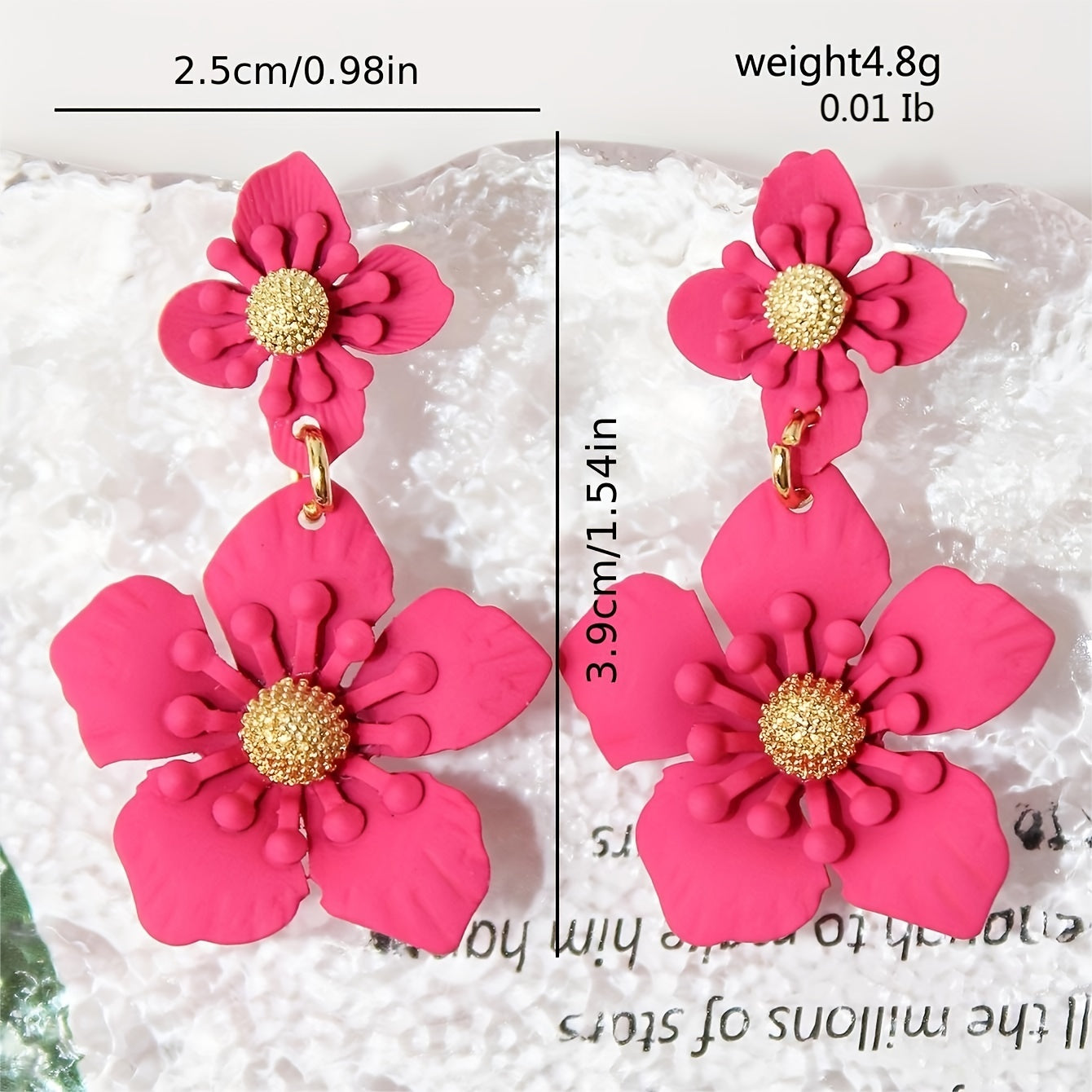 Add a pop of color to your outfit with these hot pink flower dangle earrings. Perfect for vocation style, these iron jewelry pieces make a great gift for any female. They are also ideal holiday ornaments.