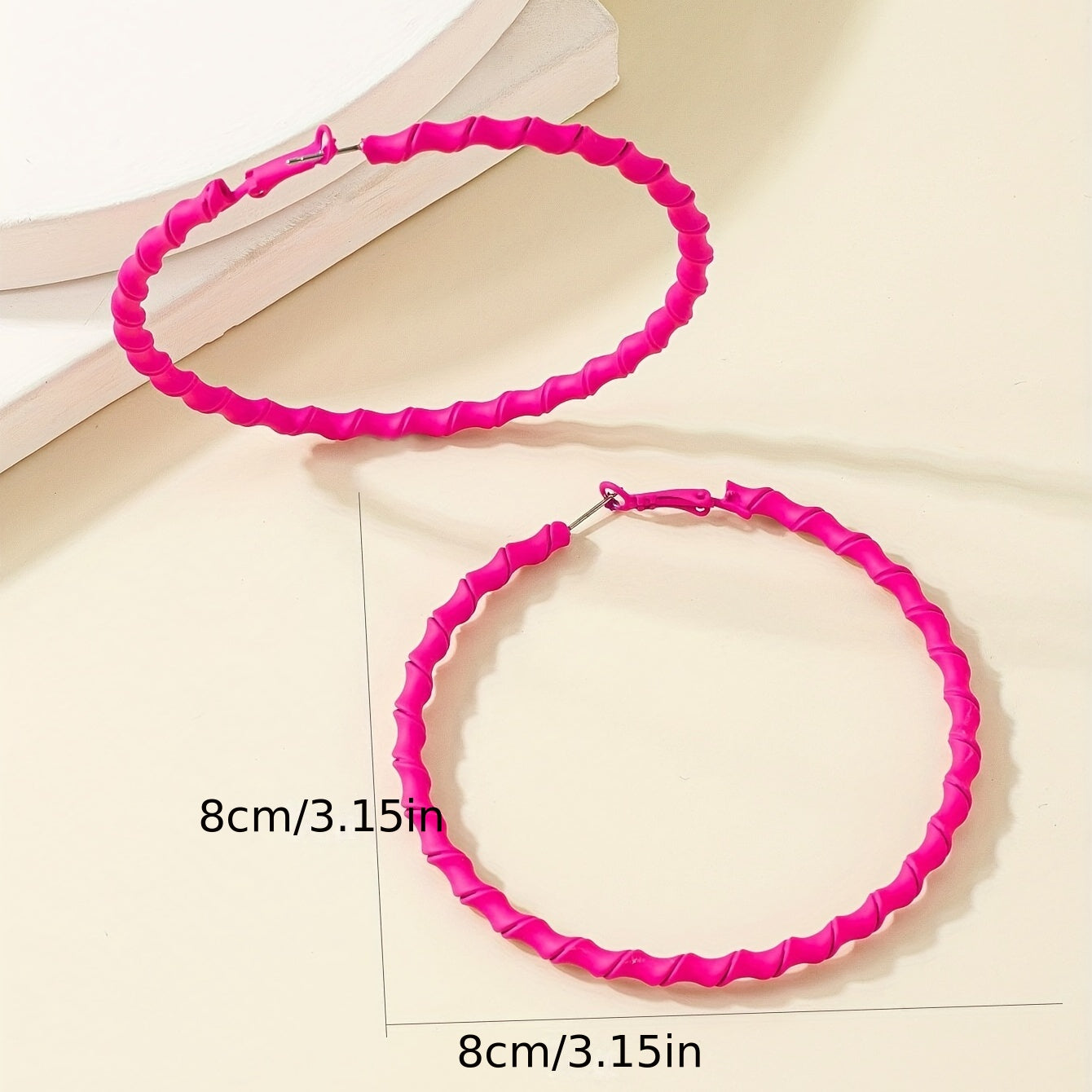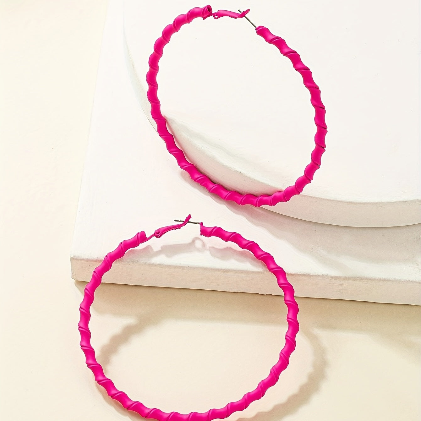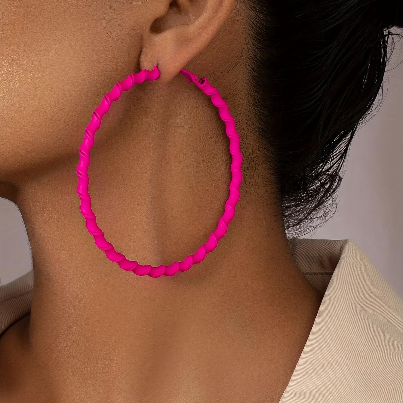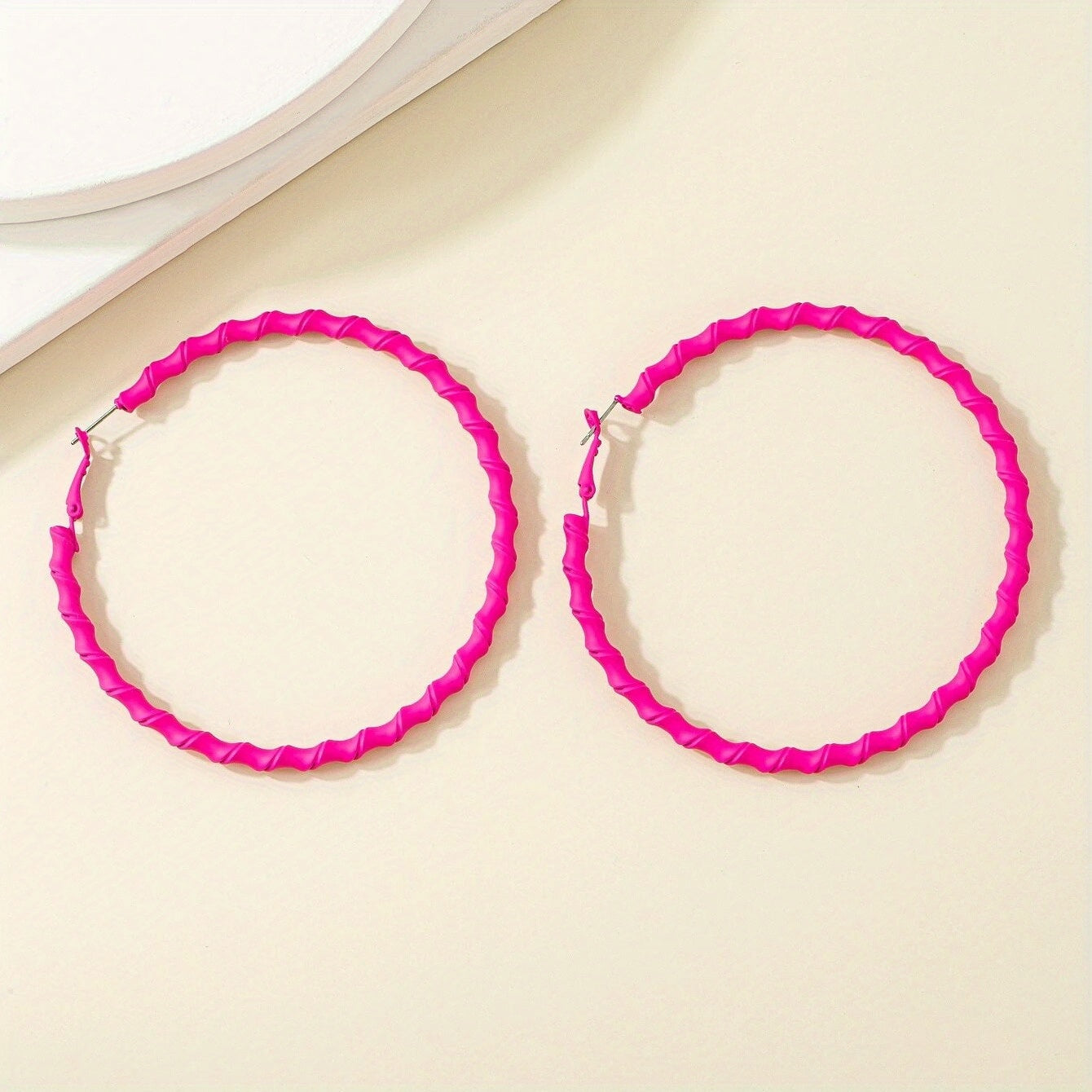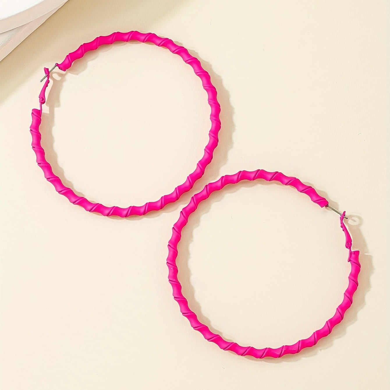 Add a pop of color to your look with these hot pink twisted hoop earrings. Perfect for a sexy leisure style, these earrings are great for stage performances or casual outings.