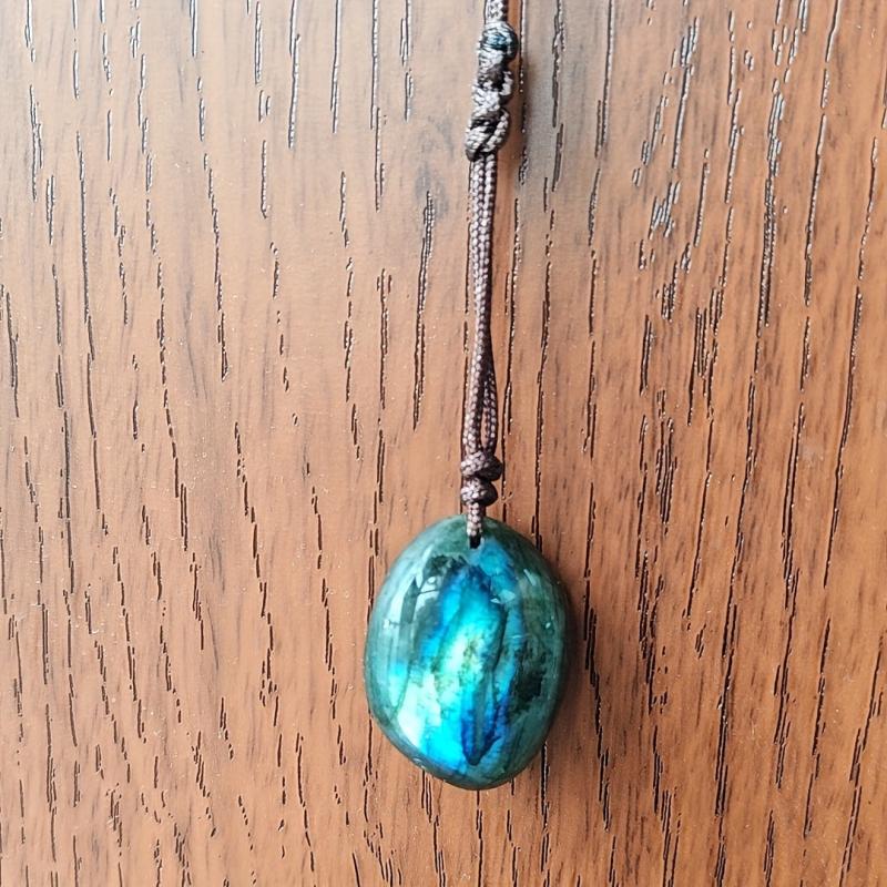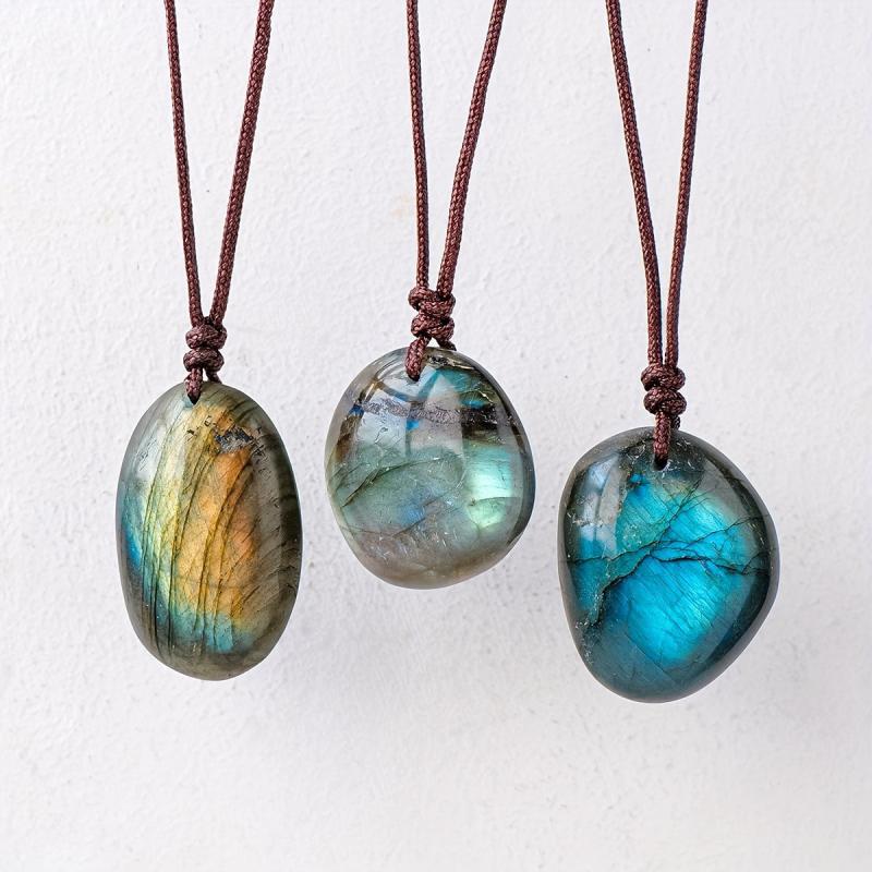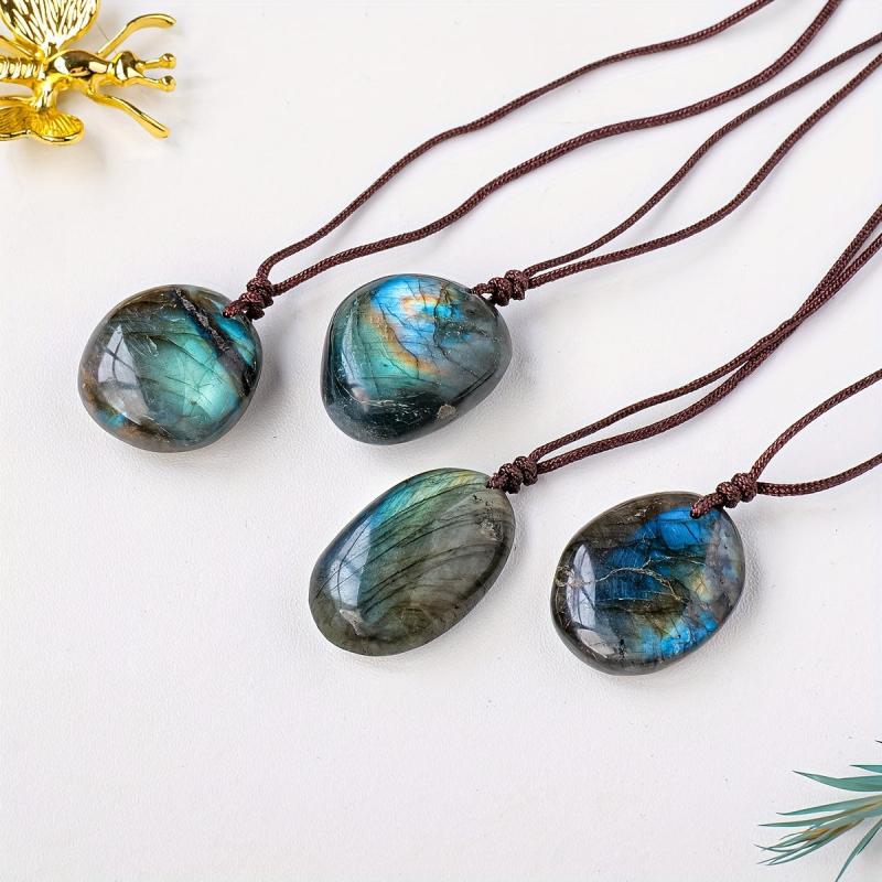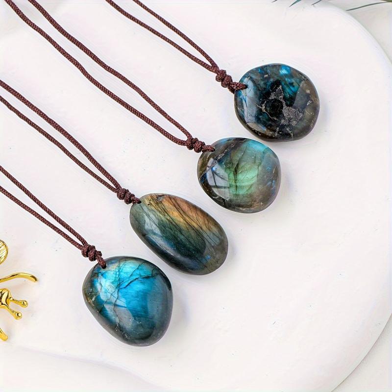 This Apengshi natural labradorite pendant necklace features an iridescent play of green and yellow colors. It's a beautiful bohemian style gemstone jewelry that makes a perfect gift for women with a spiritual touch.