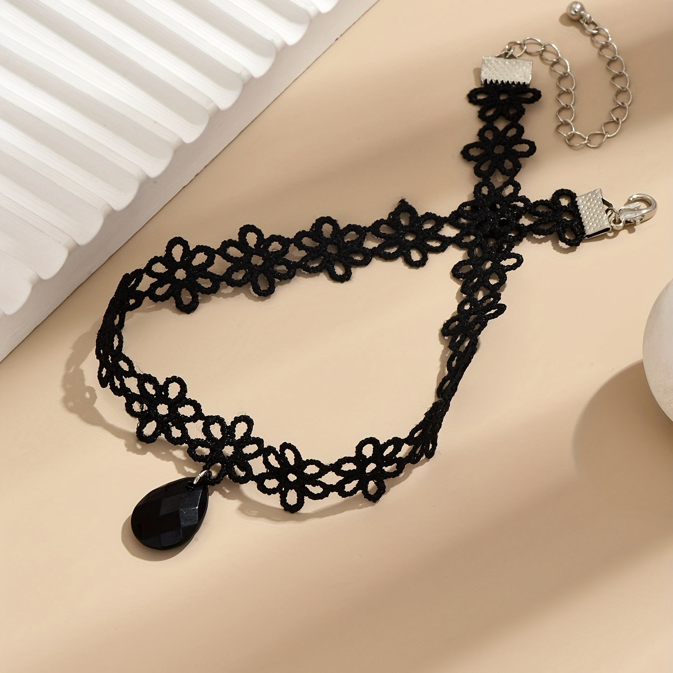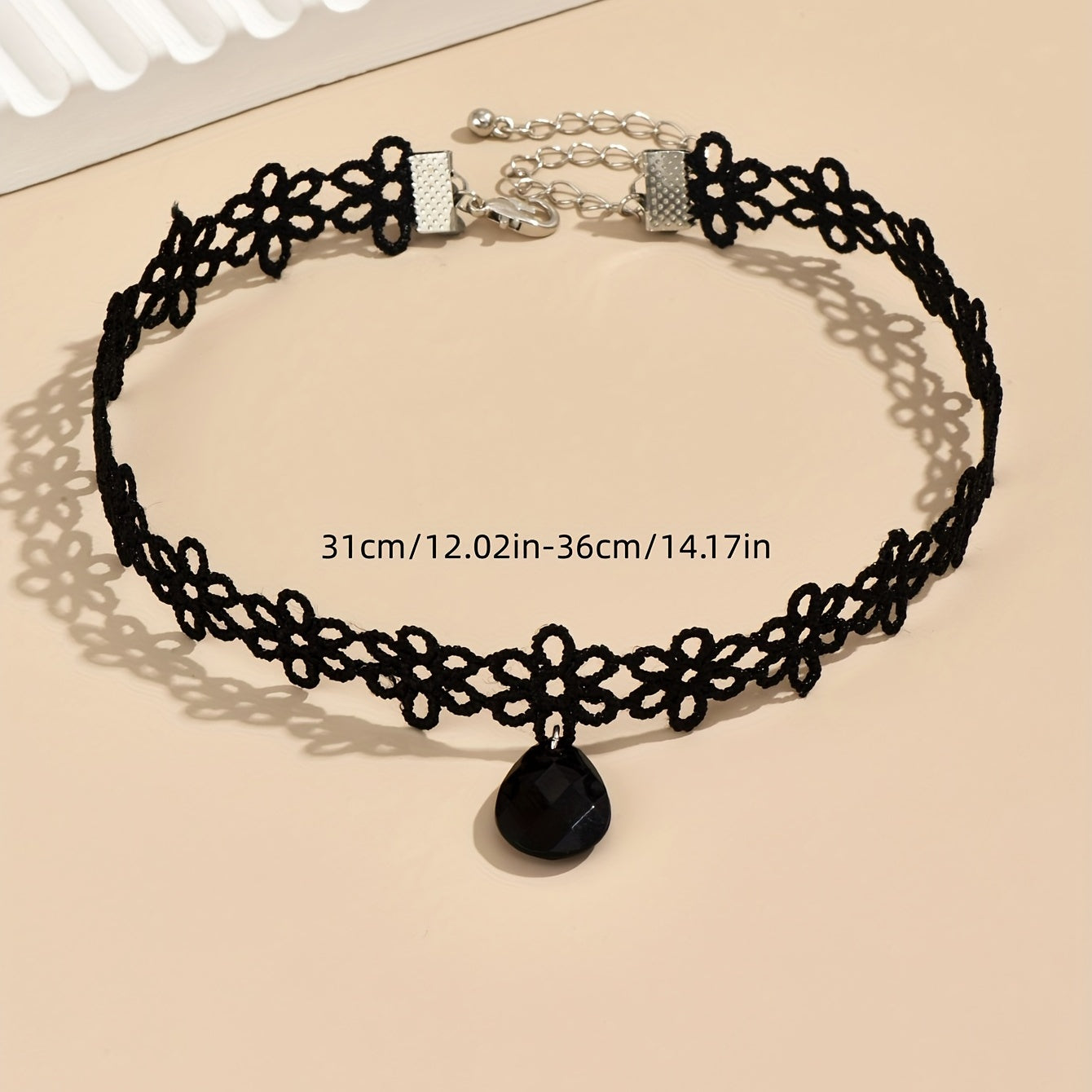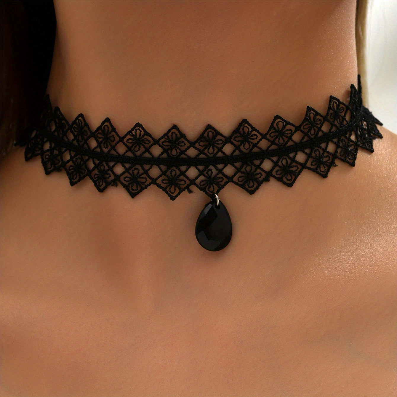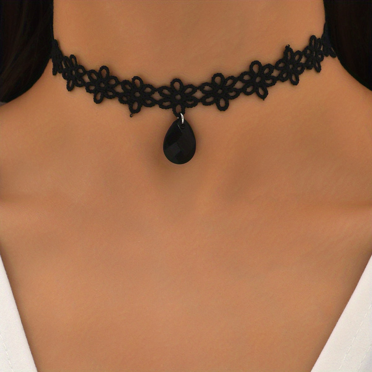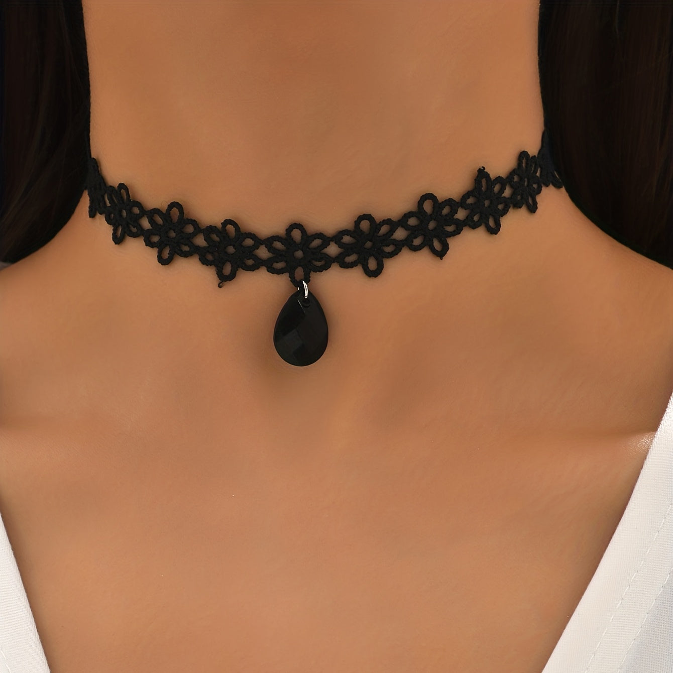 Add a touch of coquettish charm to your look with this lace flower choker necklace featuring a water drop shape pendant. Perfect for casual or dressy occasions.