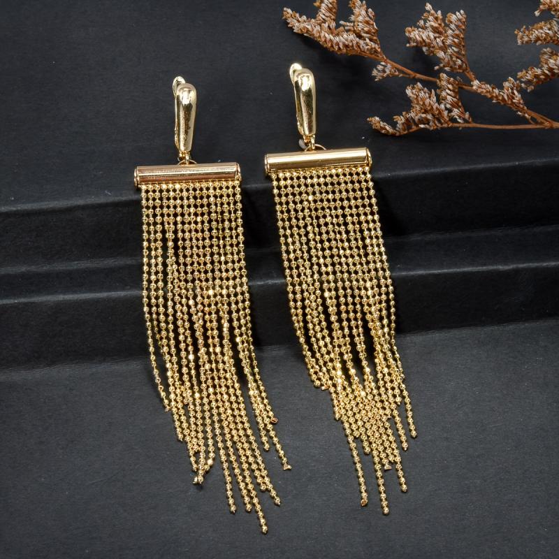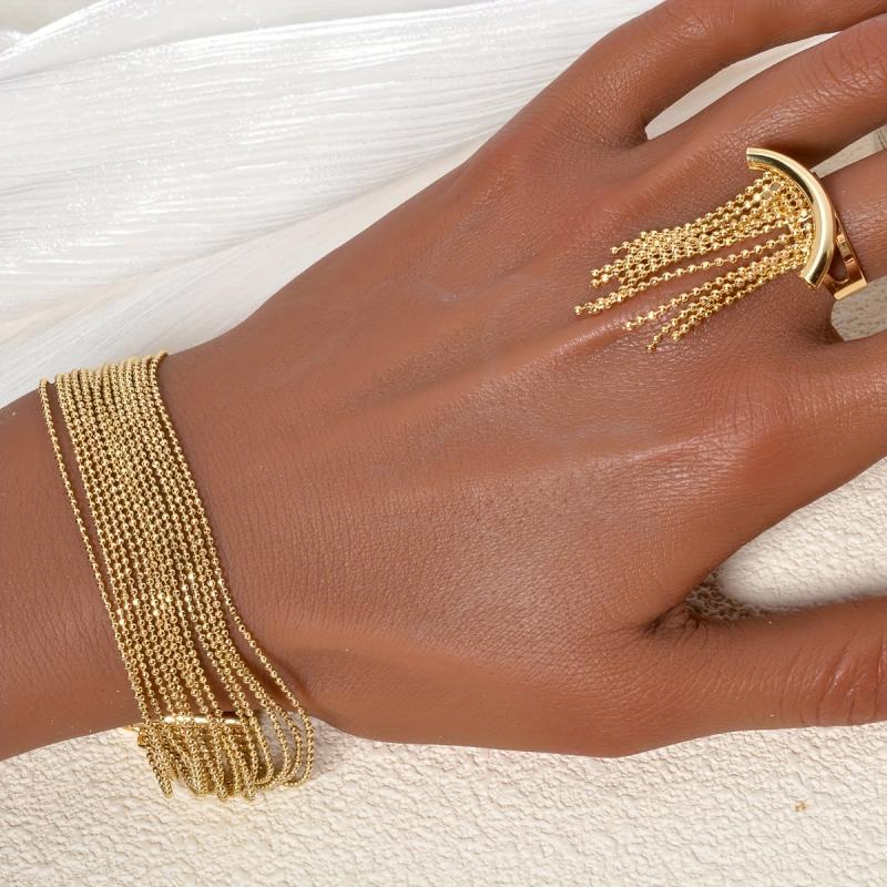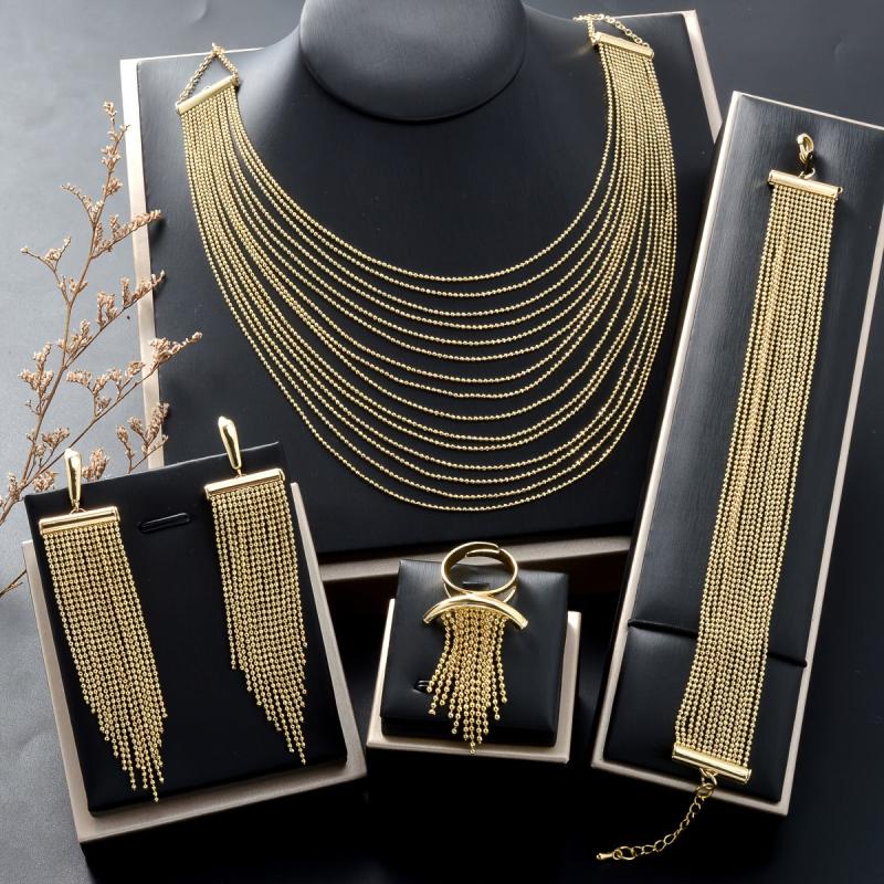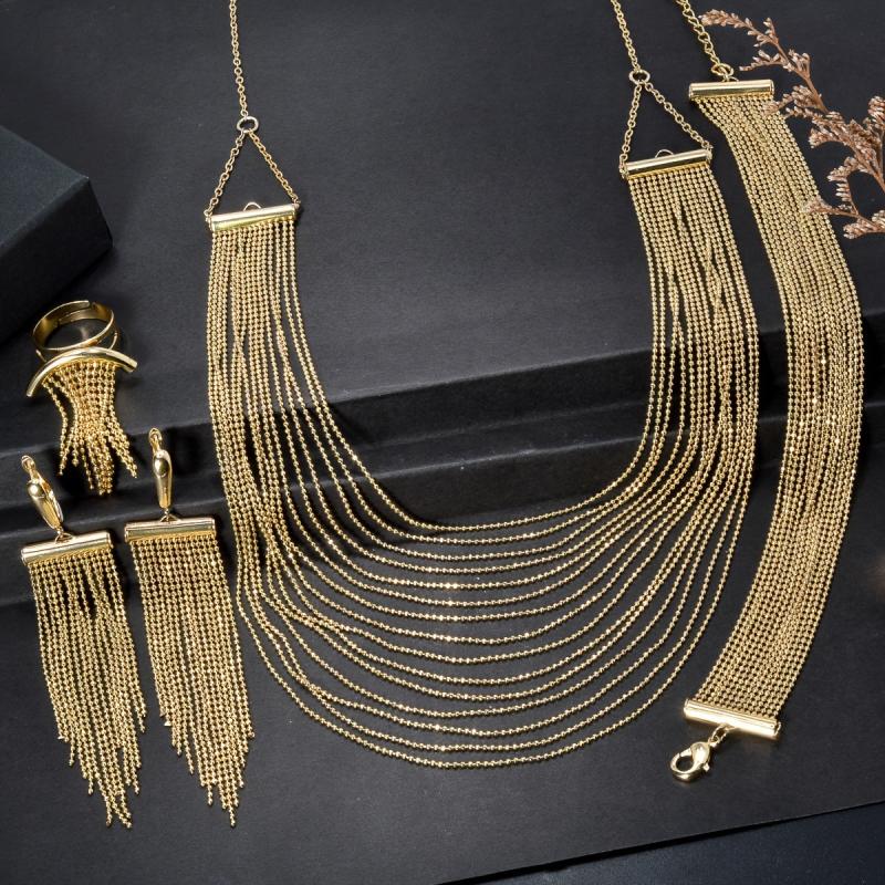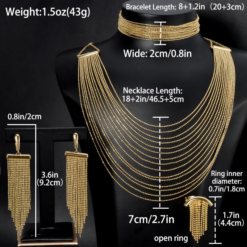 Glow with elegance in this shimmering tassel dangle earrings, ring, necklace, and bracelet set. Perfect for special occasions and weddings.