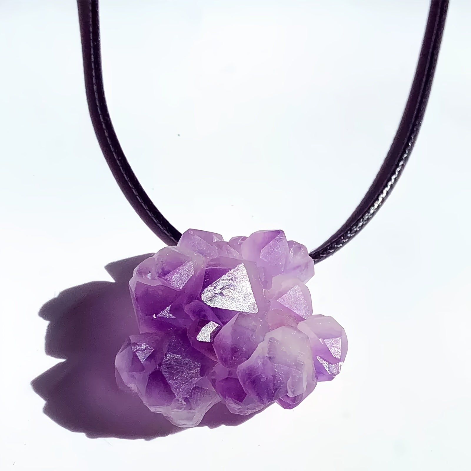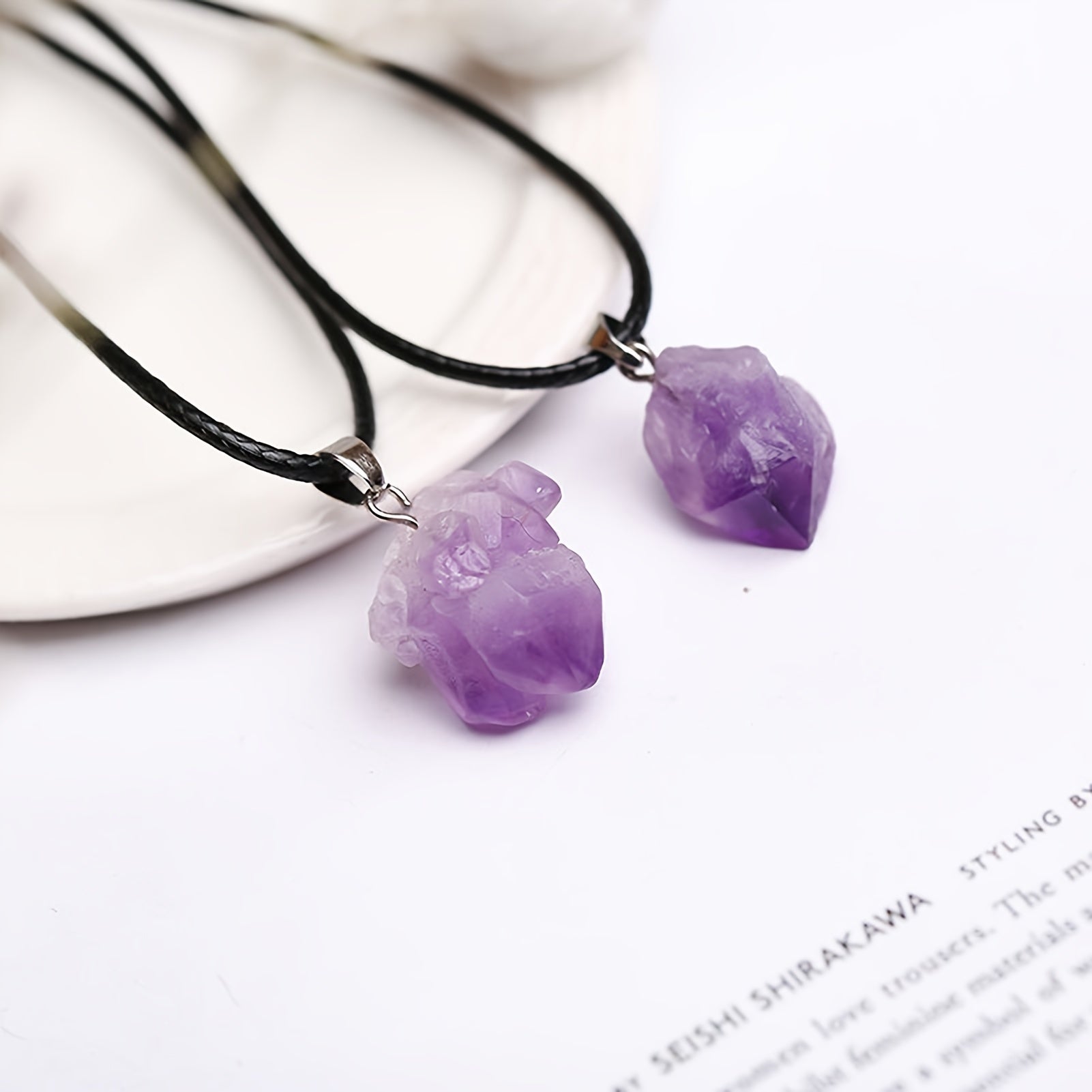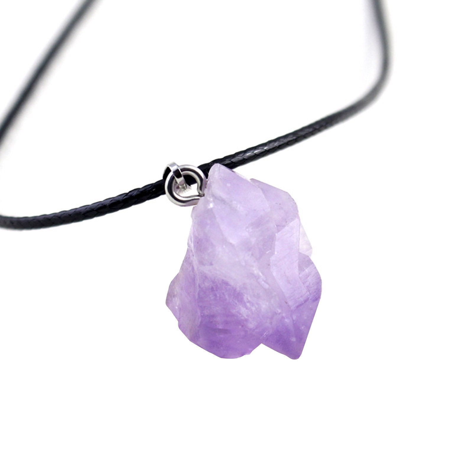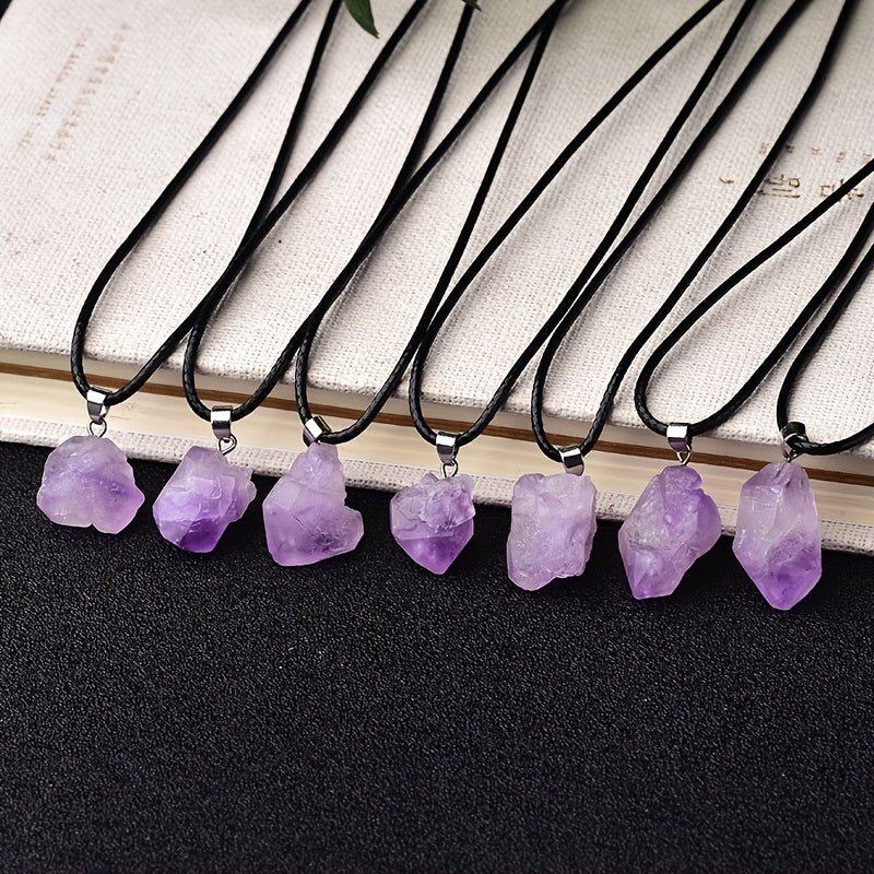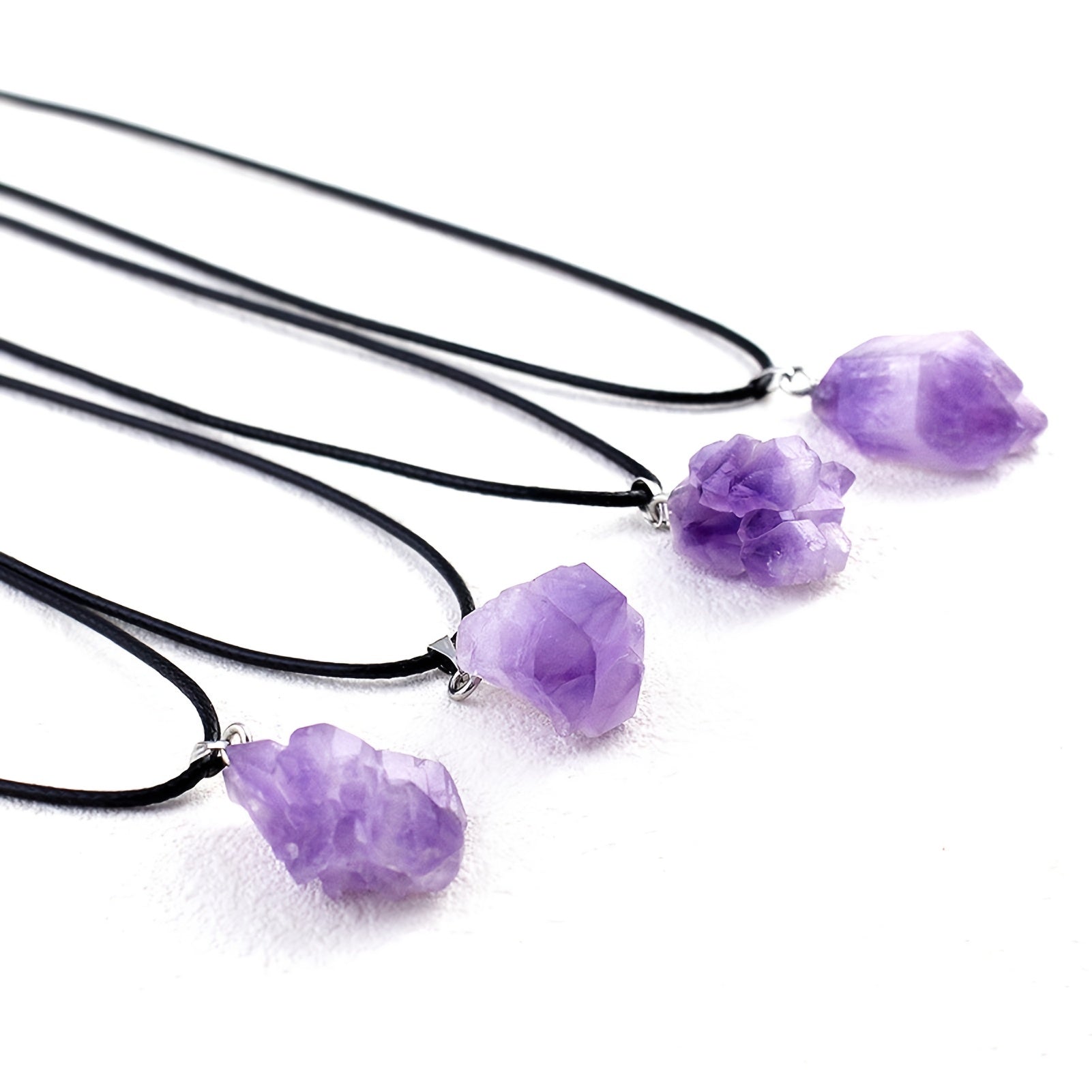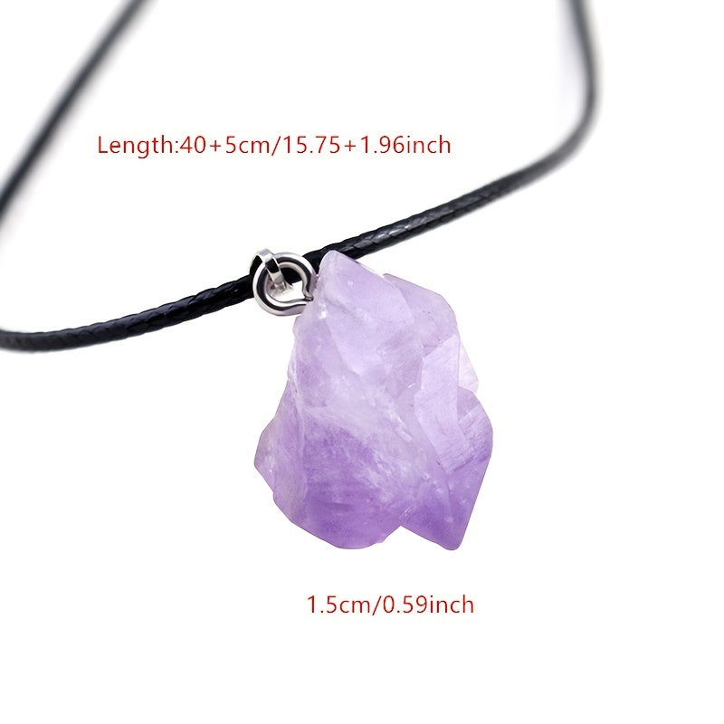 This unique necklace features a rough stone pendant in a lovely lavender purple color, suspended from a leather rope. Perfect for adding a touch of natural beauty to your outfit.