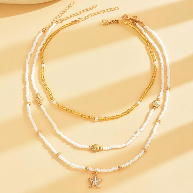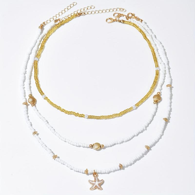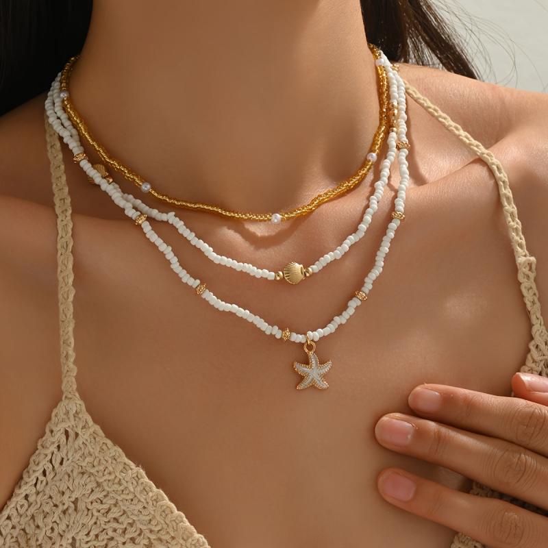 Elevate your beach look with this 3pcs necklace set featuring a seaside shell and starfish pendant, glass bead choker with golden accents. Perfect accessory for a summer vacation or beach day.