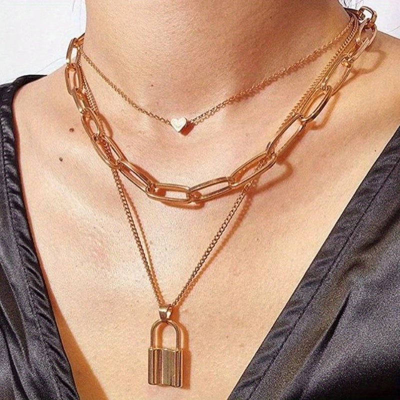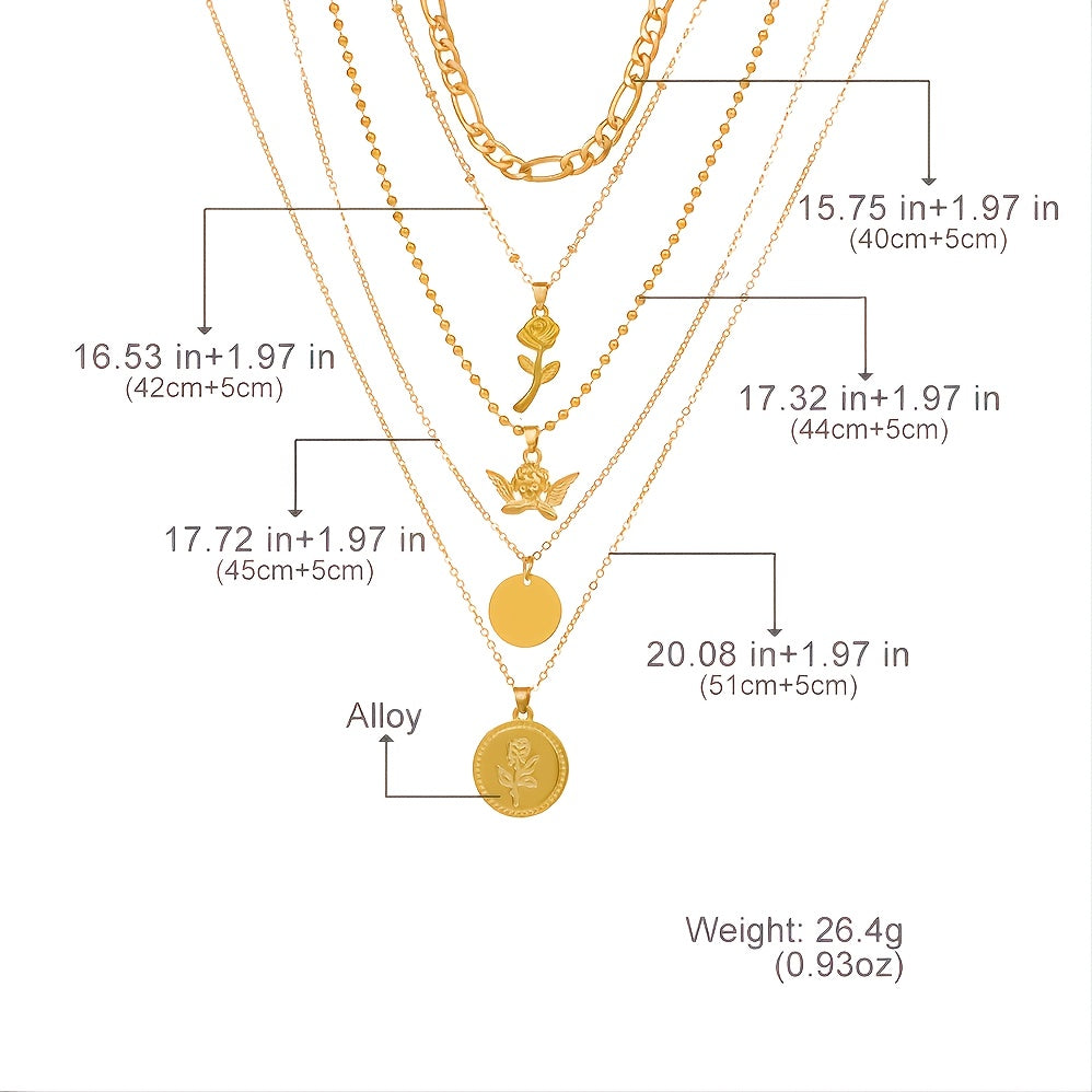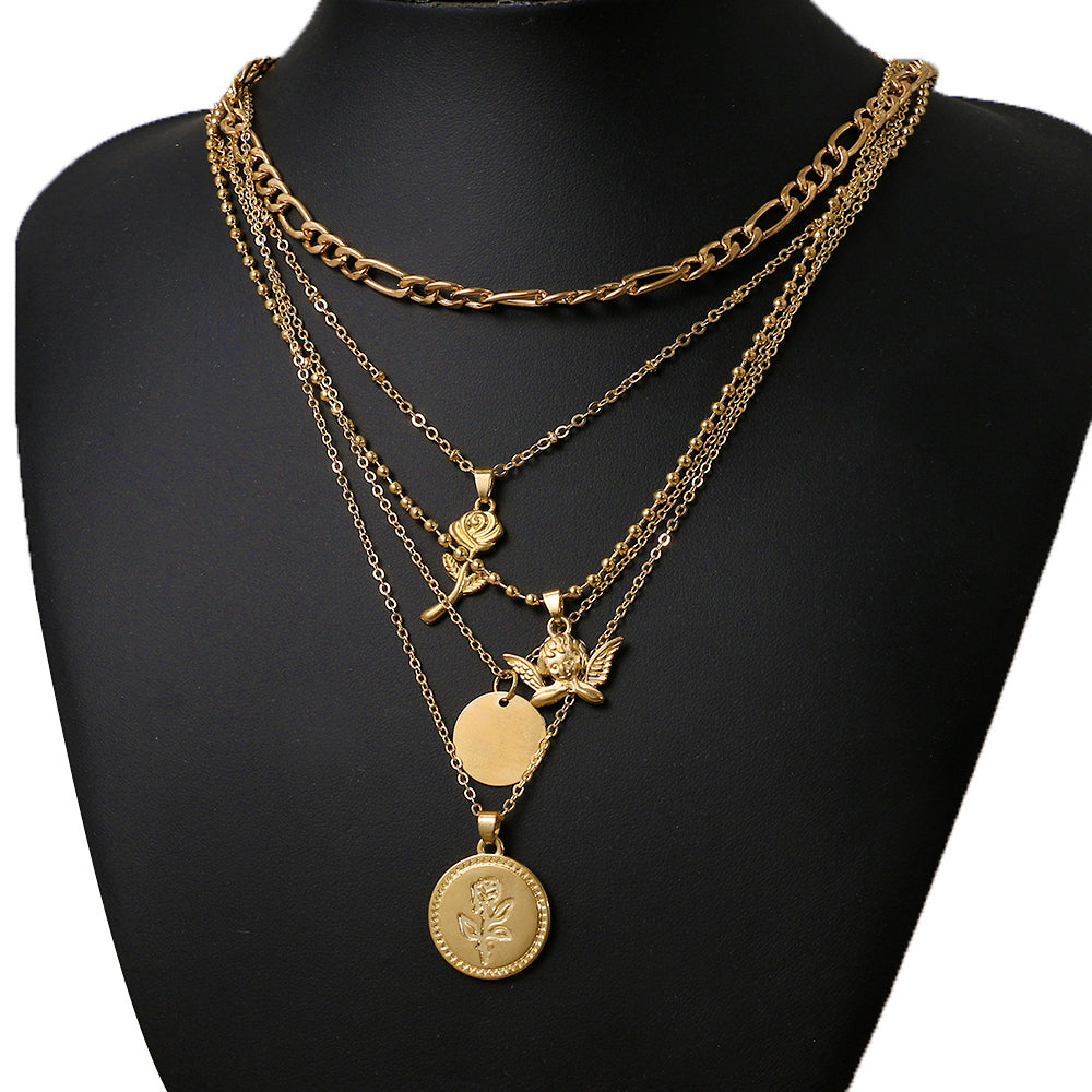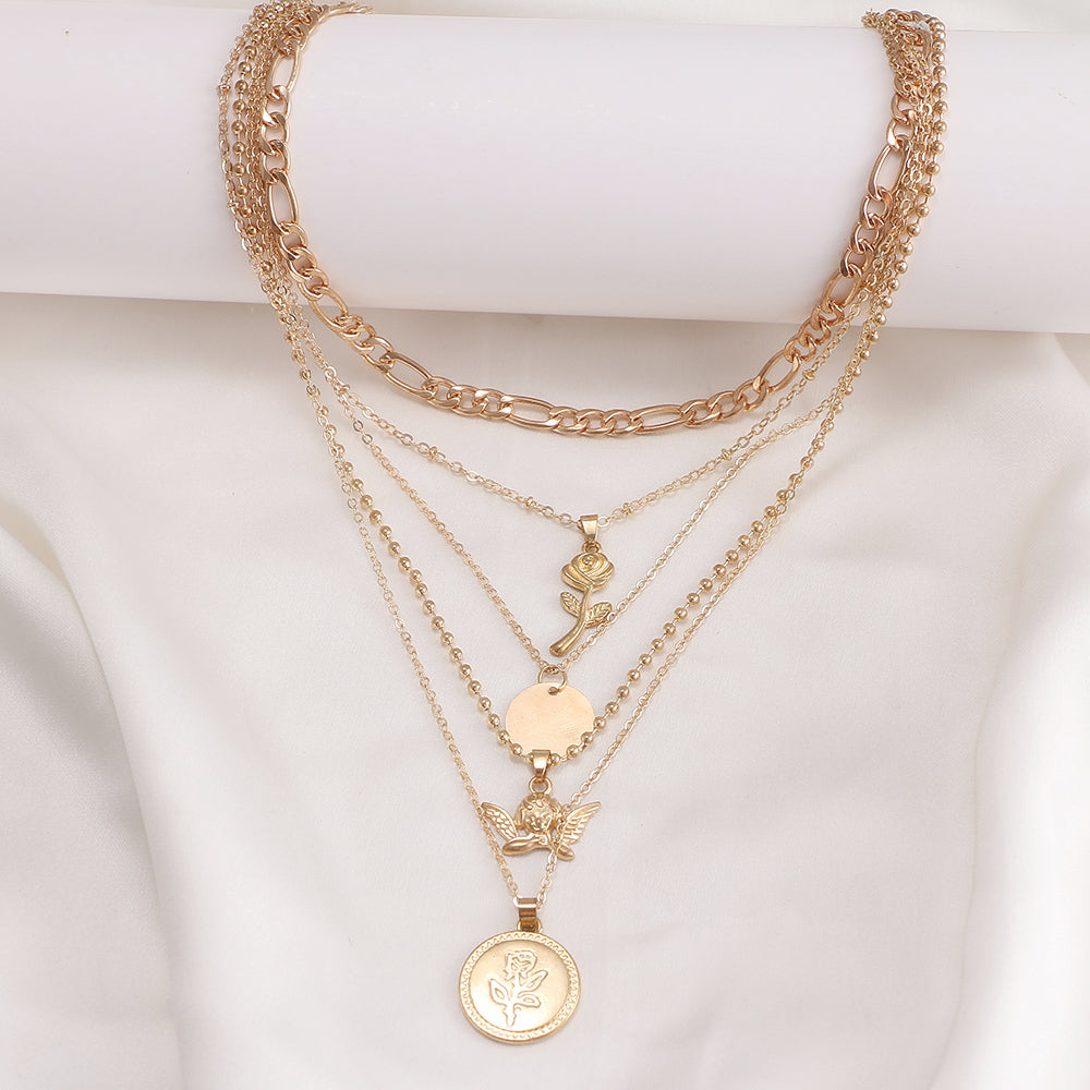 This necklace features a multilayer design with rose and angel pendants, creating a unique and stylish look.